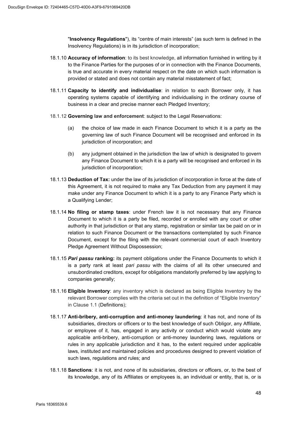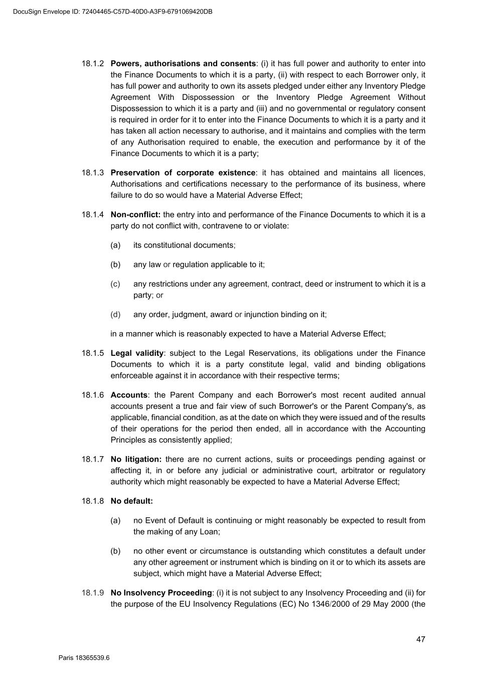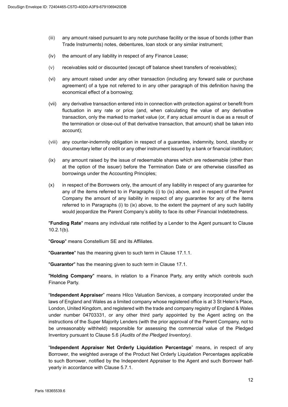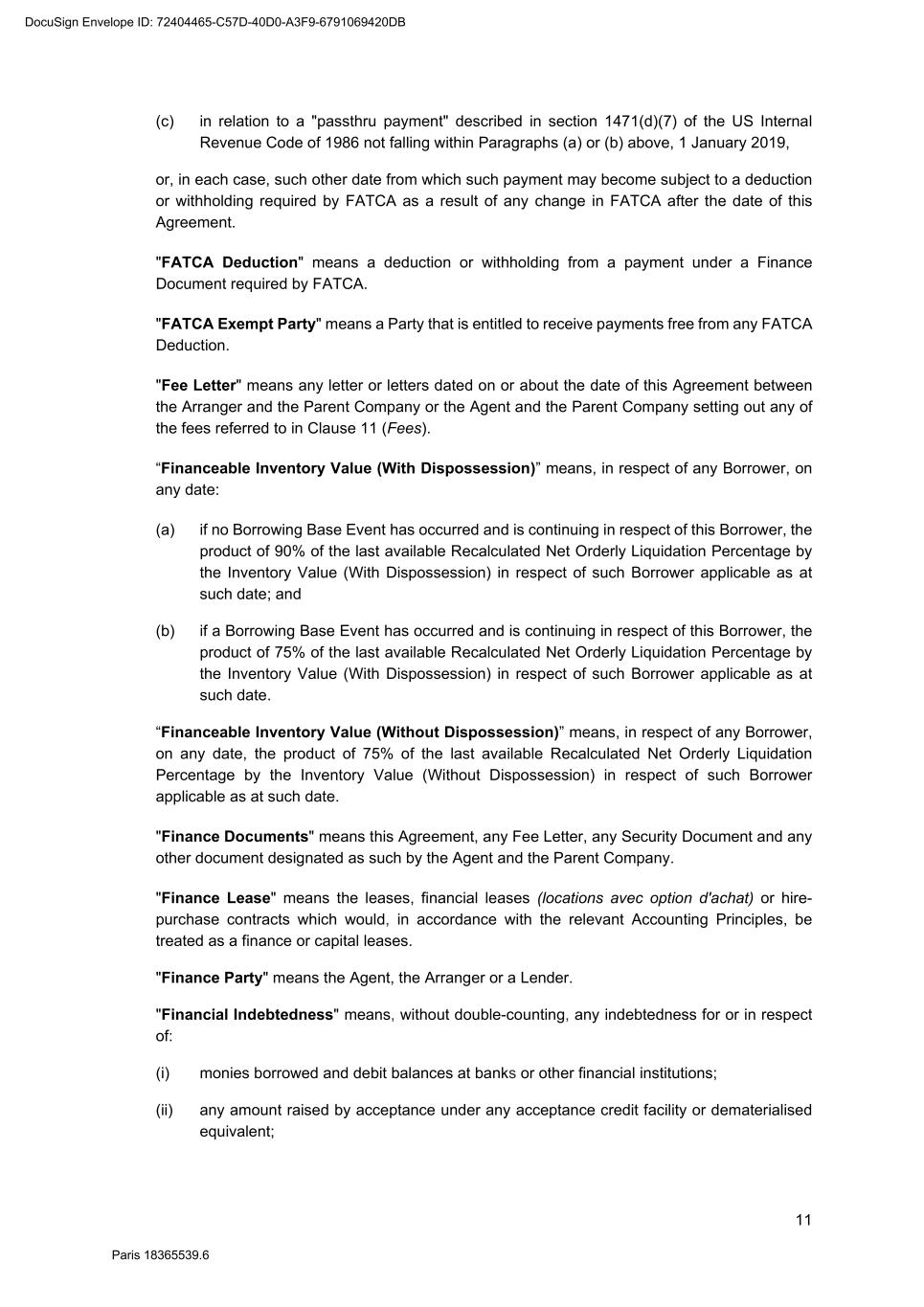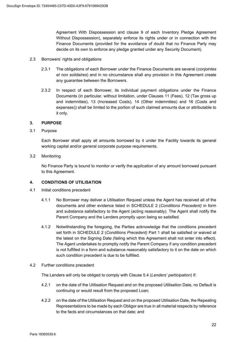 82 Paris 18365539.6 (c) Legal opinion by Dentons Europe in respect of the validity and enforceability of the Finance Documents to be executed on the Signing Date drafted by them. 3. Other documents and evidence (a) Execution of this Agreement and the Fee Letters. (b) Report from the Escrow Agent satisfactory to the Agent. (c) All costs and expenses (including the Agent’s and the Arranger’s legal costs, to the extent invoiced in due time) then due and payable by each Obligor under the Finance Documents have been paid. Part 2 – Conditions Precedent at the first Utilisation Date 1. Documents and evidence (a) Execution of the Security Documents substantially in the form set out in SCHEDULE 10 (Form of Security Documents) or in such other form as may be agreed between the Agent (acting on the instructions of all the Lenders) and the Parent Company, provided that the Agent may request to be provided by each Borrower, on or before the execution of such Security Documents, with the following documents: (i) a certified copy of the up-to-date constitutional documents (statuts) of each Borrower if such constitutional documents have been modified since the Signing Date; (ii) an original copy or a certified copy of the certificate of incorporation of each Borrower (Extrait K-bis) if the certificate of incorporation of such Borrower delivered to the Agent as condition precedent to the Signing Date is more than two months old; (iii) an original copy or a certified copy of a statement of charges over assets and encumbrances (état des inscriptions et nantissements), including a statement as to pledges without dispossession (gages sans dépossession), in relation to each Borrower, if the statement of charges over assets and encumbrances of such Borrower delivered to the Agent as condition precedent to the Signing Date is more than two months old; and (iv) if necessary, original copies or certified copies of the resolutions of the competent corporate bodies, approving the terms of, the transactions contemplated by, and the execution and performance of the Security Documents to be executed by it and an original copy or a certified copy of the power(s) of attorney of the person(s) signing the Security Documents to be executed by it. (b) Execution of any necessary document with the Escrow Agent and the Independent Appraiser. (c) Evidence that an insurance policy complying with the terms of the Finance Documents has been entered into by each Borrower in relation to its Pledged Inventory and that the related premiums have been paid to the insurer. (d) All costs and expenses (including the Agent’s and the Arranger’s legal costs) then due and payable by each Obligor under the Finance Documents have been paid. DocuSign Envelope ID: 72404465-C57D-40D0-A3F9-6791069420DB