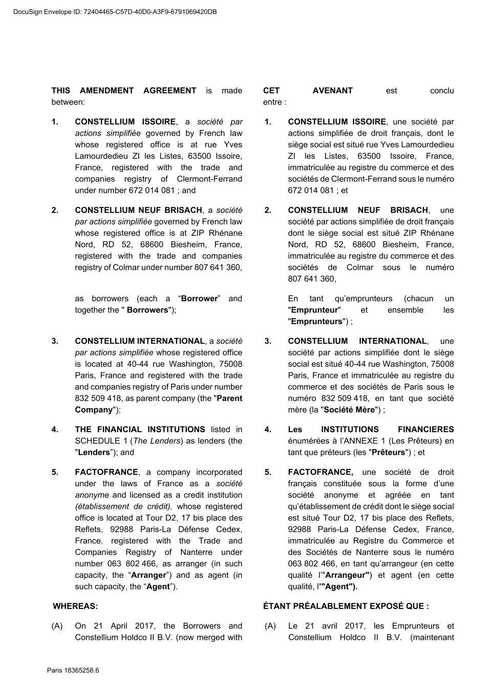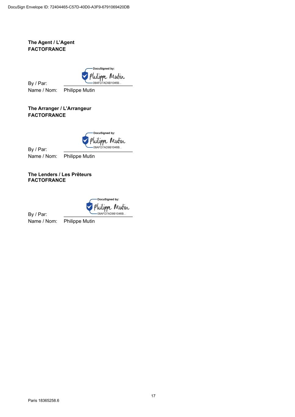 17 Paris 18365258.6 The Agent / L’Agent FACTOFRANCE By / Par: _________________________ Name / Nom: Philippe Mutin The Arranger / L’Arrangeur FACTOFRANCE By / Par: _________________________ Name / Nom: Philippe Mutin The Lenders / Les Prêteurs FACTOFRANCE By / Par: _________________________ Name / Nom: Philippe Mutin DocuSign Envelope ID: 72404465-C57D-40D0-A3F9-6791069420DB