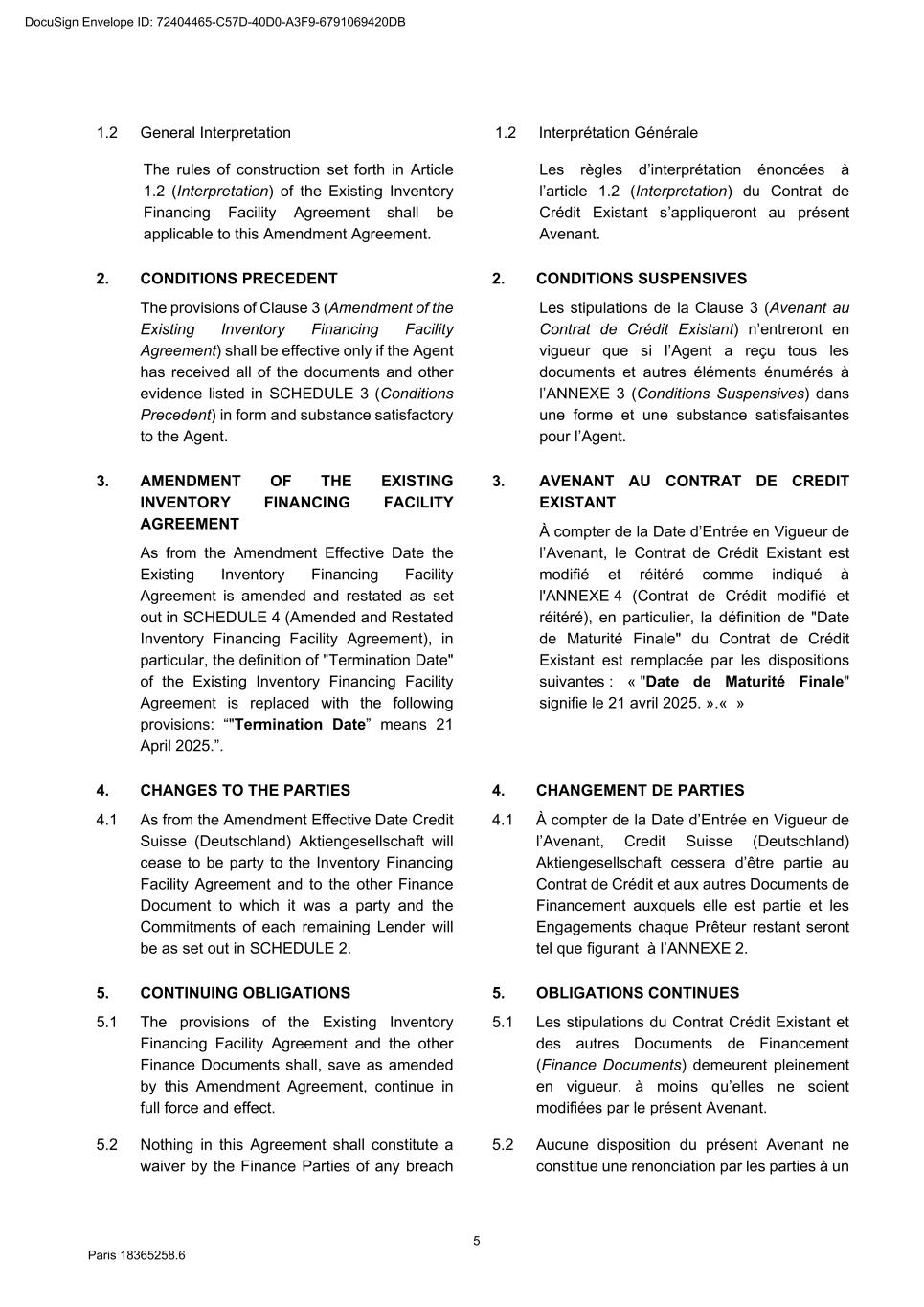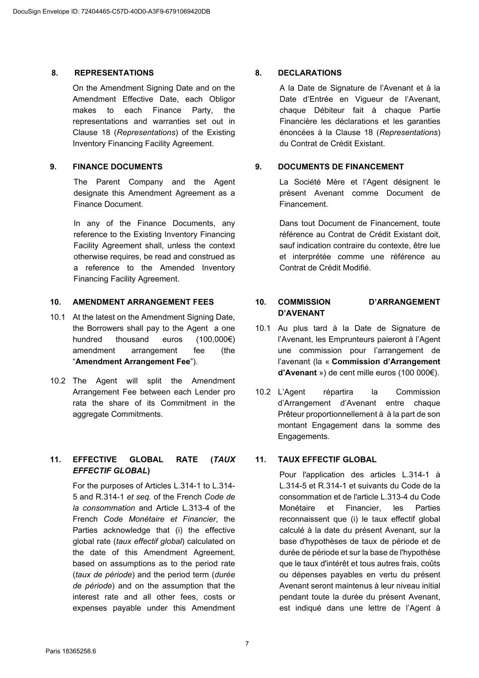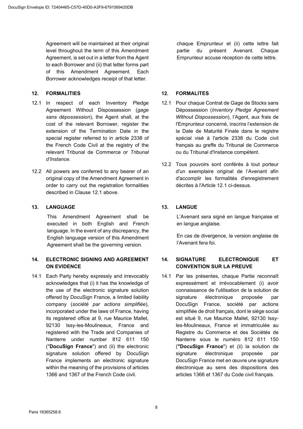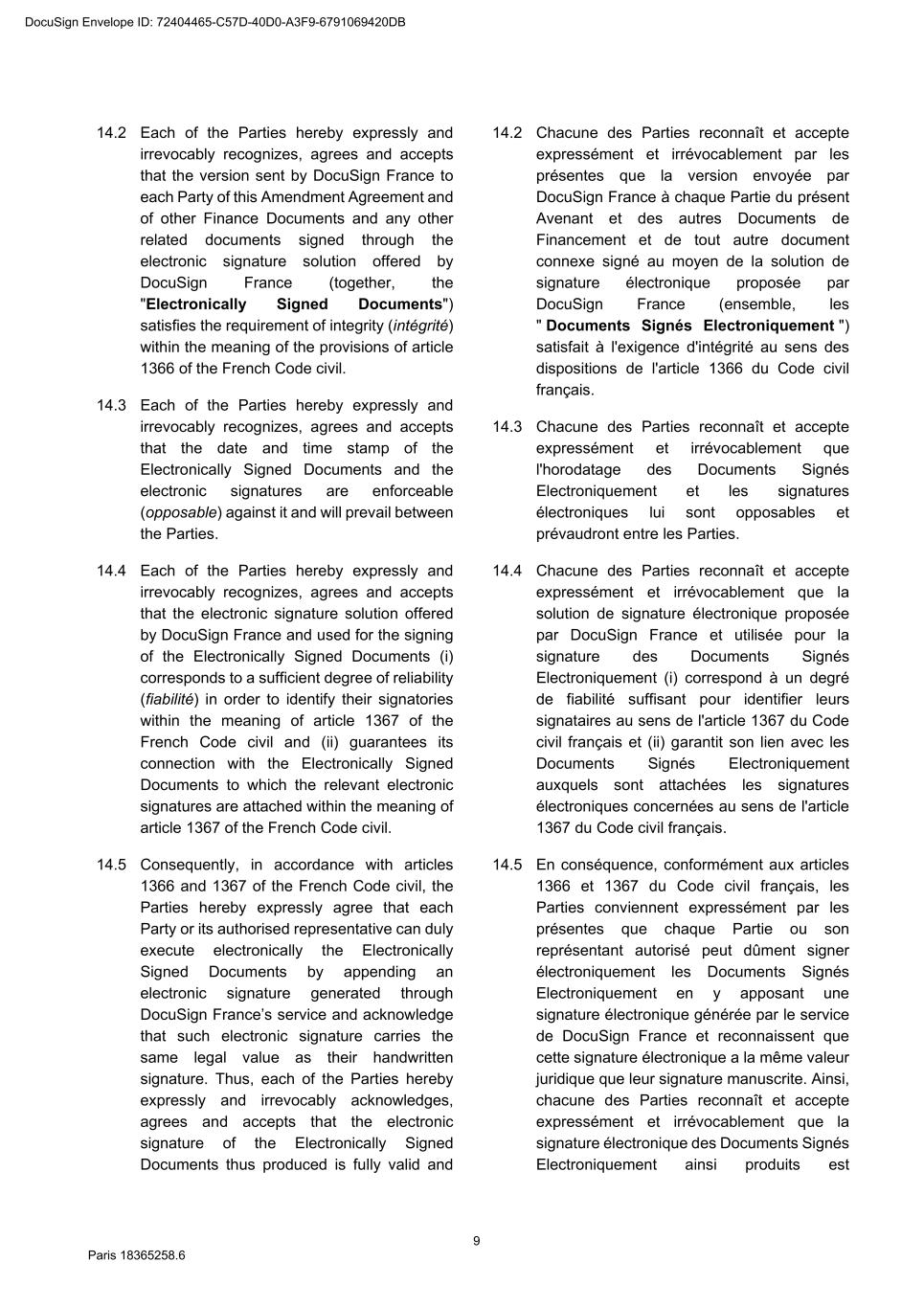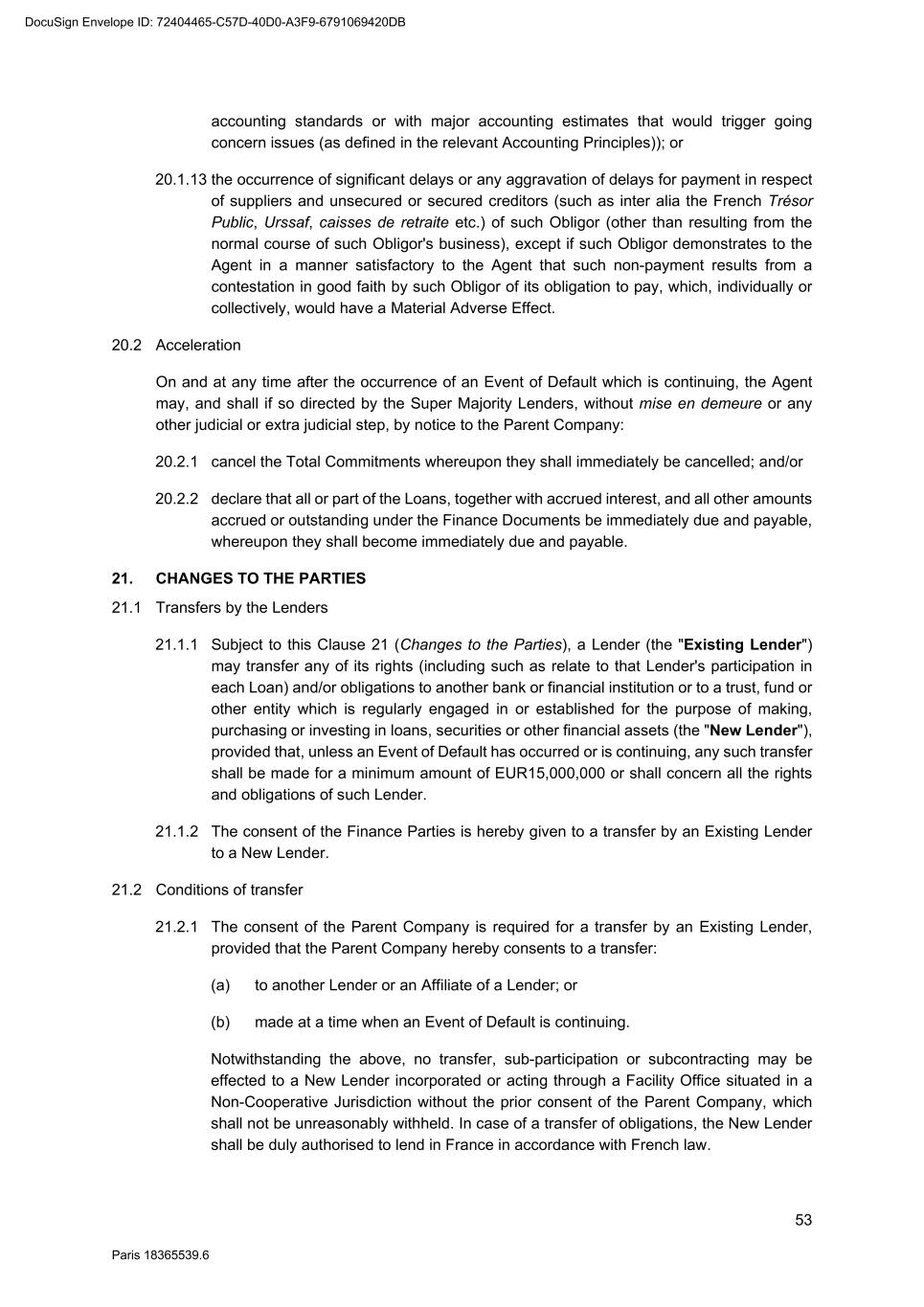 73 Paris 18365539.6 27.4.2 All other documents provided under or in connection with any Finance Document must be: (a) in English; or (b) if not in English, and if so required by the Agent, accompanied by a certified English translation and, in this case, the English translation will prevail unless the document is a constitutional, statutory or other official document. 28. DAY COUNT CONVENTION Any interest, commission or fee accruing under a Finance Document will accrue from day to day and is calculated on the basis of the actual number of days elapsed and a year of 360 days or, in any case where the practice in the Relevant Market differs, in accordance with that market practice. 29. PARTIAL INVALIDITY If, at any time, any provision of a Finance Document is or becomes illegal, invalid or unenforceable in any respect under any law of any jurisdiction, neither the legality, validity or enforceability of the remaining provisions nor the legality, validity or enforceability of such provision under the law of any other jurisdiction will in any way be affected or impaired. 30. REMEDIES, WAIVERS AND HARDSHIP 30.1 Remedies and waivers No failure to exercise, nor any delay in exercising, on the part of any Finance Party, any right or remedy under a Finance Document shall operate as a waiver of any such right or remedy or constitute an election to affirm any of the Finance Documents. No election to affirm any Finance Document on the part of any Finance Party shall be effective unless it is in writing. No single or partial exercise of any right or remedy shall prevent any further or other exercise or the exercise of any other right or remedy. The rights and remedies provided in each Finance Document are cumulative and, subject to Clause 30.2 (No hardship), not exclusive of any rights or remedies provided by law. 30.2 No hardship Each Party hereby acknowledges that the provisions of Article 1195 of the French Code civil shall not apply to it with respect to its obligations under the Finance Documents and that it shall not be entitled to make any claim under Article 1195 of the French Code civil. 31. AMENDMENTS AND WAIVERS 31.1 Required consents 31.1.1 Subject to Clause 31.2 (All Lenders matters), Clause 31.3 (Super Majority Lenders) and Clause 31.4 (Other exceptions), any term of the Finance Documents may be amended or waived only with the consent of the Majority Lenders and the Obligors and any such amendment or waiver will be binding on all Parties. 31.1.2 The Agent may effect, on behalf of any Finance Party, any amendment or waiver permitted by this Clause 31 (Amendments and waivers). 31.2 All Lenders matters DocuSign Envelope ID: 72404465-C57D-40D0-A3F9-6791069420DB