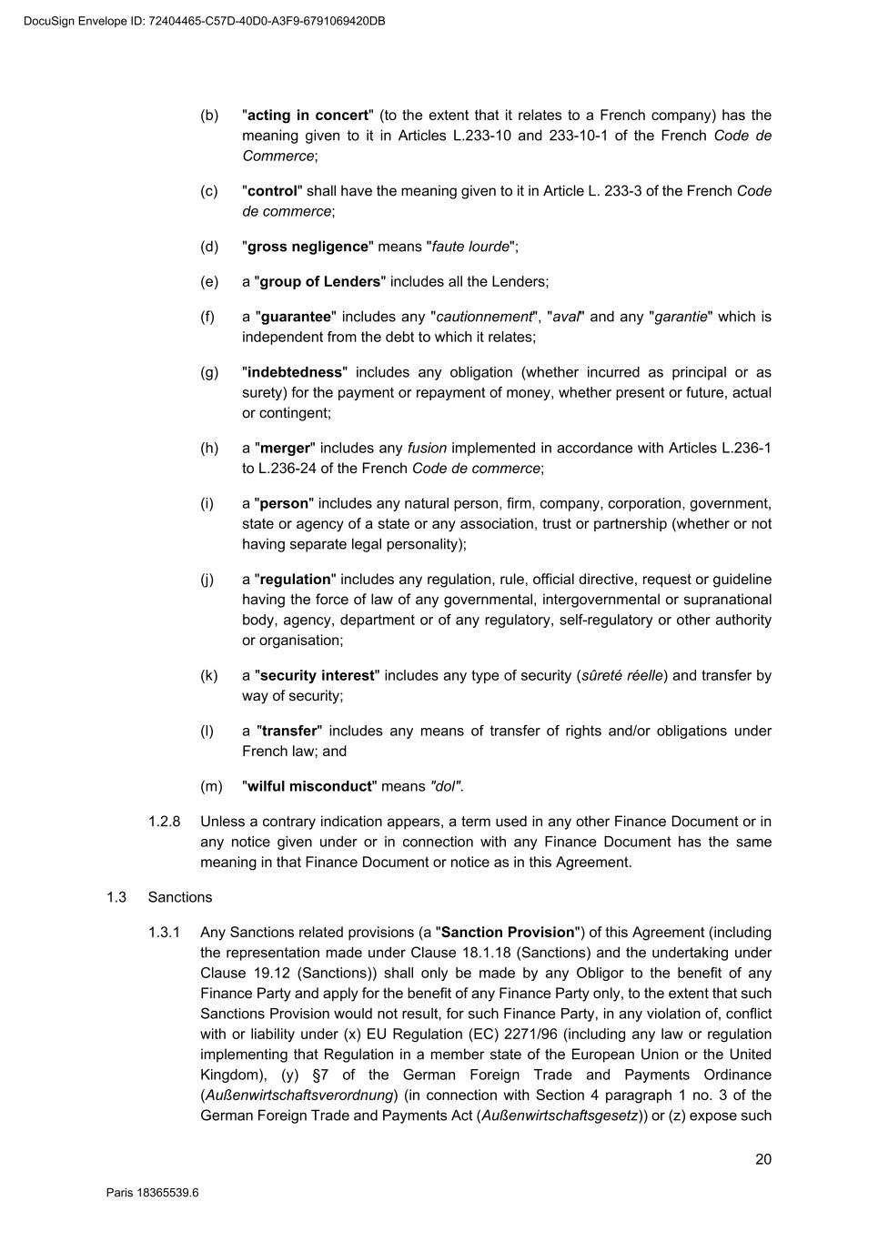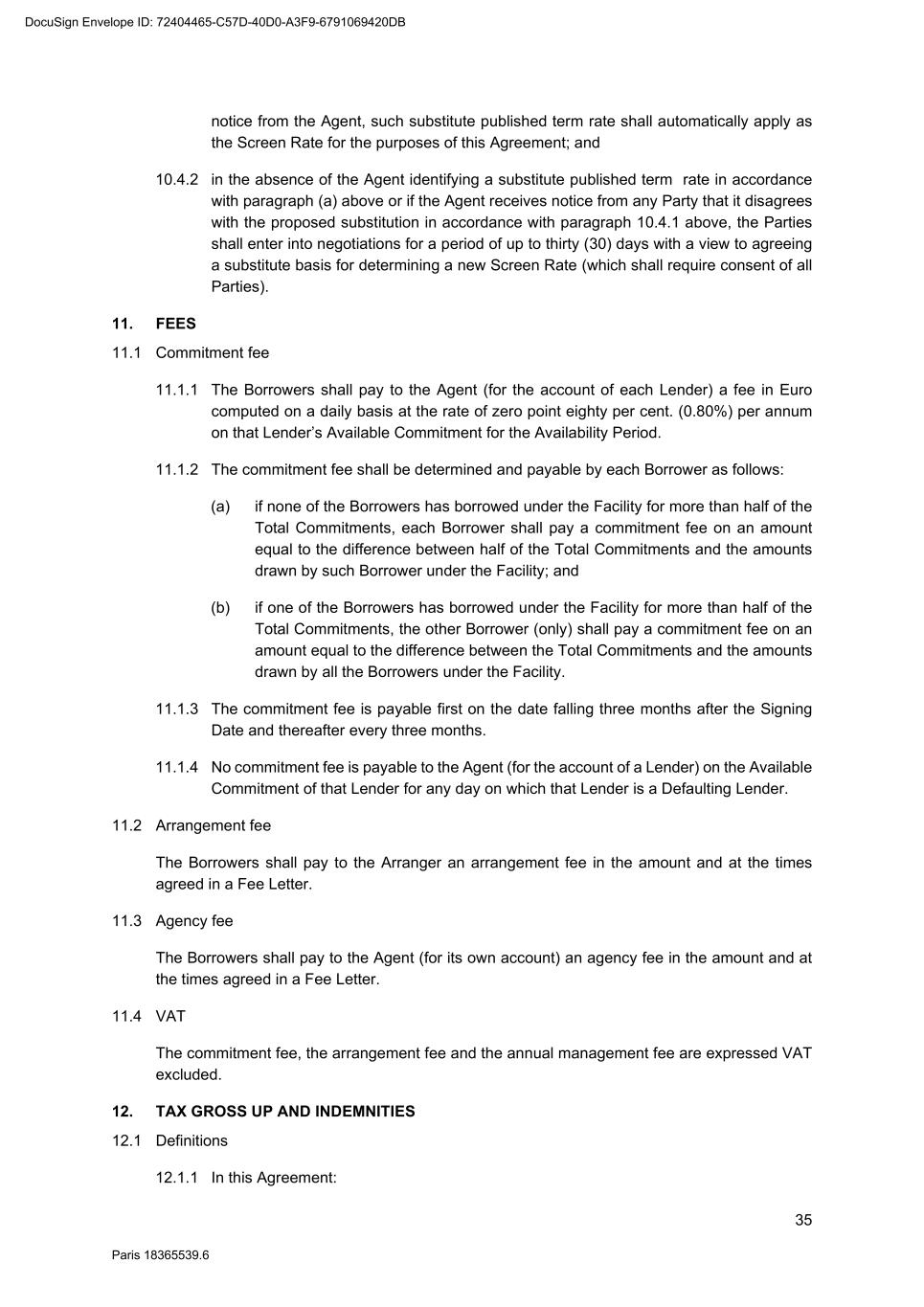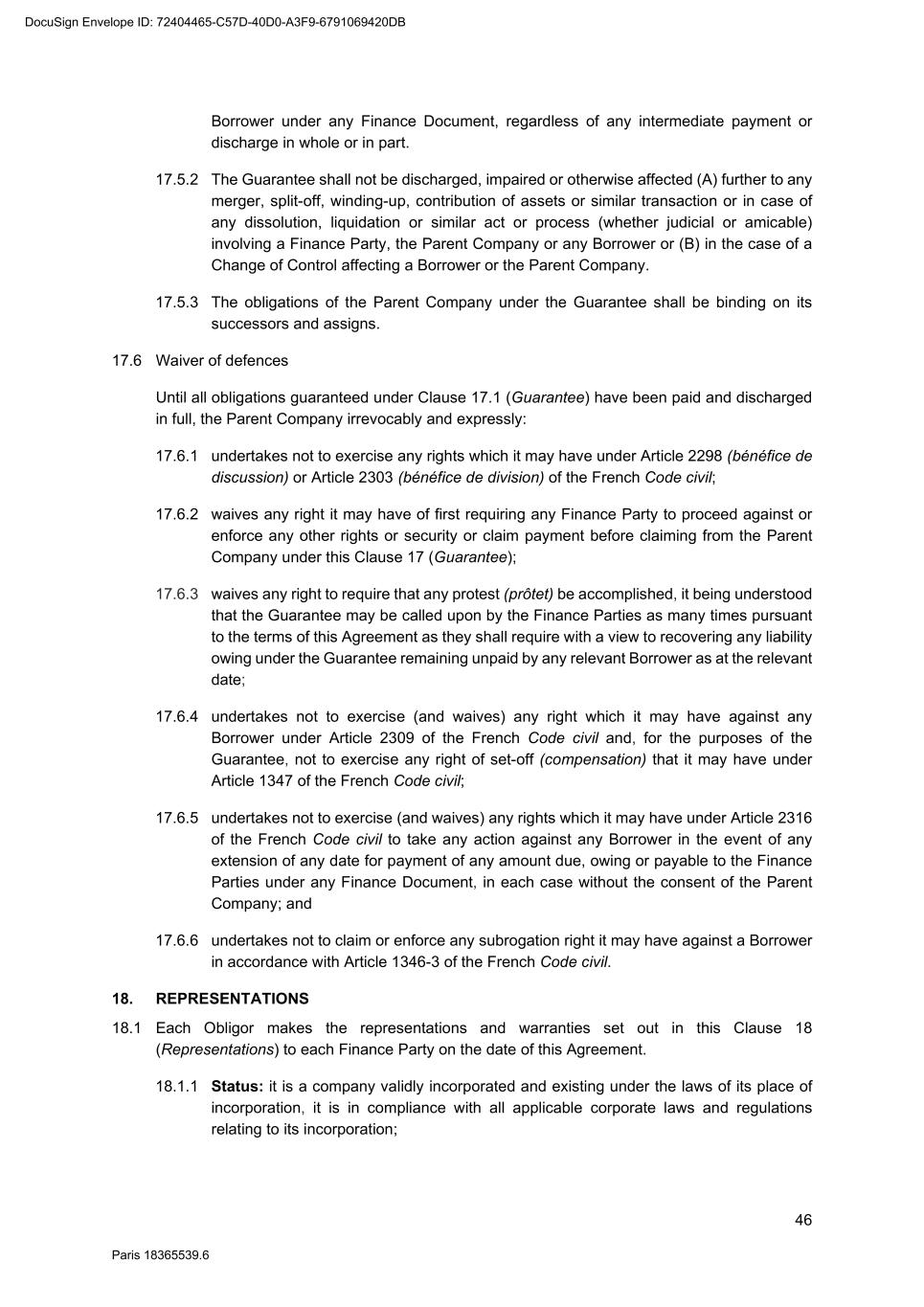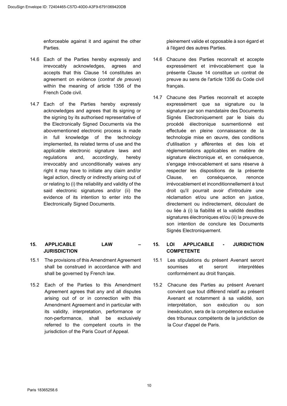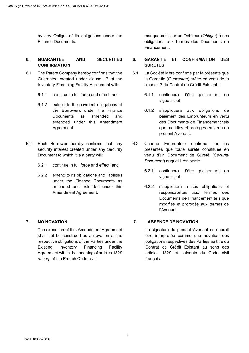 73 Paris 18365539.6 27.4.2 All other documents provided under or in connection with any Finance Document must be: (a) in English; or (b) if not in English, and if so required by the Agent, accompanied by a certified English translation and, in this case, the English translation will prevail unless the document is a constitutional, statutory or other official document. 28. DAY COUNT CONVENTION Any interest, commission or fee accruing under a Finance Document will accrue from day to day and is calculated on the basis of the actual number of days elapsed and a year of 360 days or, in any case where the practice in the Relevant Market differs, in accordance with that market practice. 29. PARTIAL INVALIDITY If, at any time, any provision of a Finance Document is or becomes illegal, invalid or unenforceable in any respect under any law of any jurisdiction, neither the legality, validity or enforceability of the remaining provisions nor the legality, validity or enforceability of such provision under the law of any other jurisdiction will in any way be affected or impaired. 30. REMEDIES, WAIVERS AND HARDSHIP 30.1 Remedies and waivers No failure to exercise, nor any delay in exercising, on the part of any Finance Party, any right or remedy under a Finance Document shall operate as a waiver of any such right or remedy or constitute an election to affirm any of the Finance Documents. No election to affirm any Finance Document on the part of any Finance Party shall be effective unless it is in writing. No single or partial exercise of any right or remedy shall prevent any further or other exercise or the exercise of any other right or remedy. The rights and remedies provided in each Finance Document are cumulative and, subject to Clause 30.2 (No hardship), not exclusive of any rights or remedies provided by law. 30.2 No hardship Each Party hereby acknowledges that the provisions of Article 1195 of the French Code civil shall not apply to it with respect to its obligations under the Finance Documents and that it shall not be entitled to make any claim under Article 1195 of the French Code civil. 31. AMENDMENTS AND WAIVERS 31.1 Required consents 31.1.1 Subject to Clause 31.2 (All Lenders matters), Clause 31.3 (Super Majority Lenders) and Clause 31.4 (Other exceptions), any term of the Finance Documents may be amended or waived only with the consent of the Majority Lenders and the Obligors and any such amendment or waiver will be binding on all Parties. 31.1.2 The Agent may effect, on behalf of any Finance Party, any amendment or waiver permitted by this Clause 31 (Amendments and waivers). 31.2 All Lenders matters DocuSign Envelope ID: 72404465-C57D-40D0-A3F9-6791069420DB