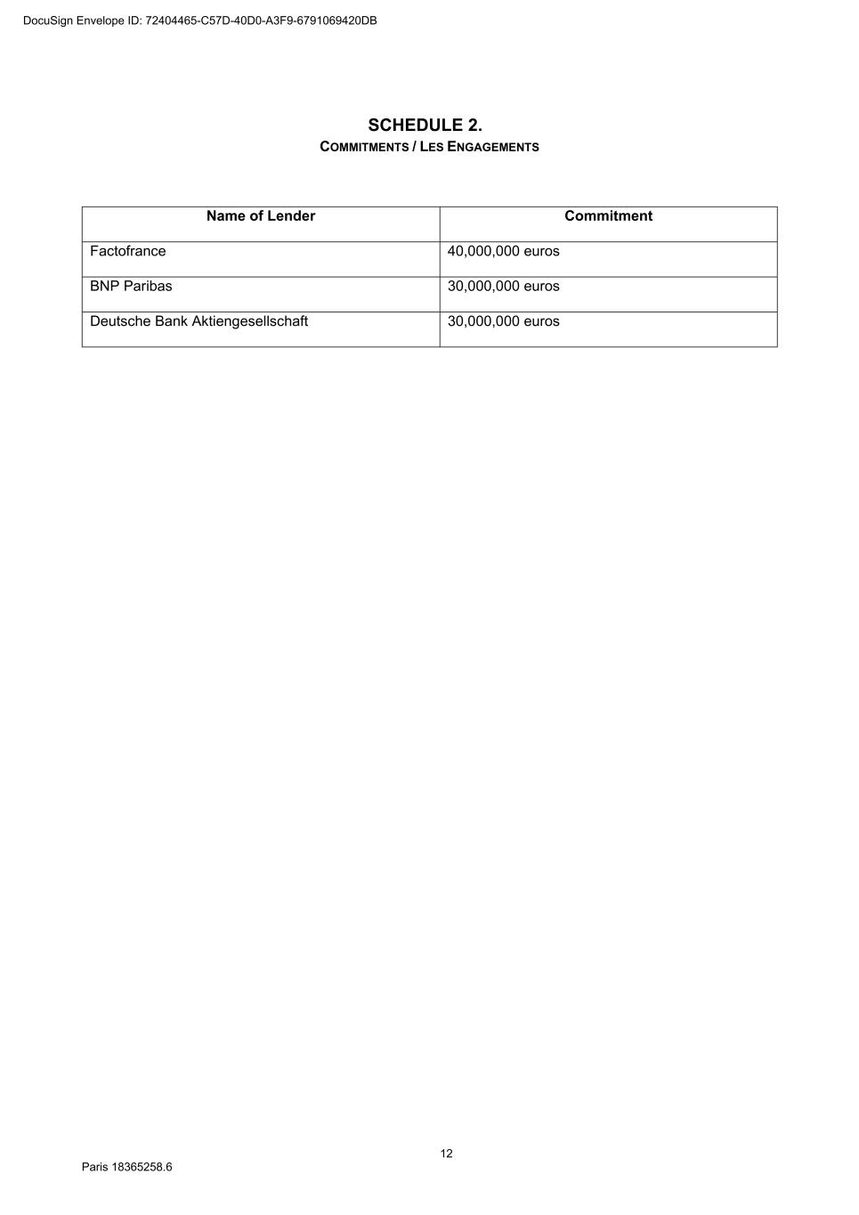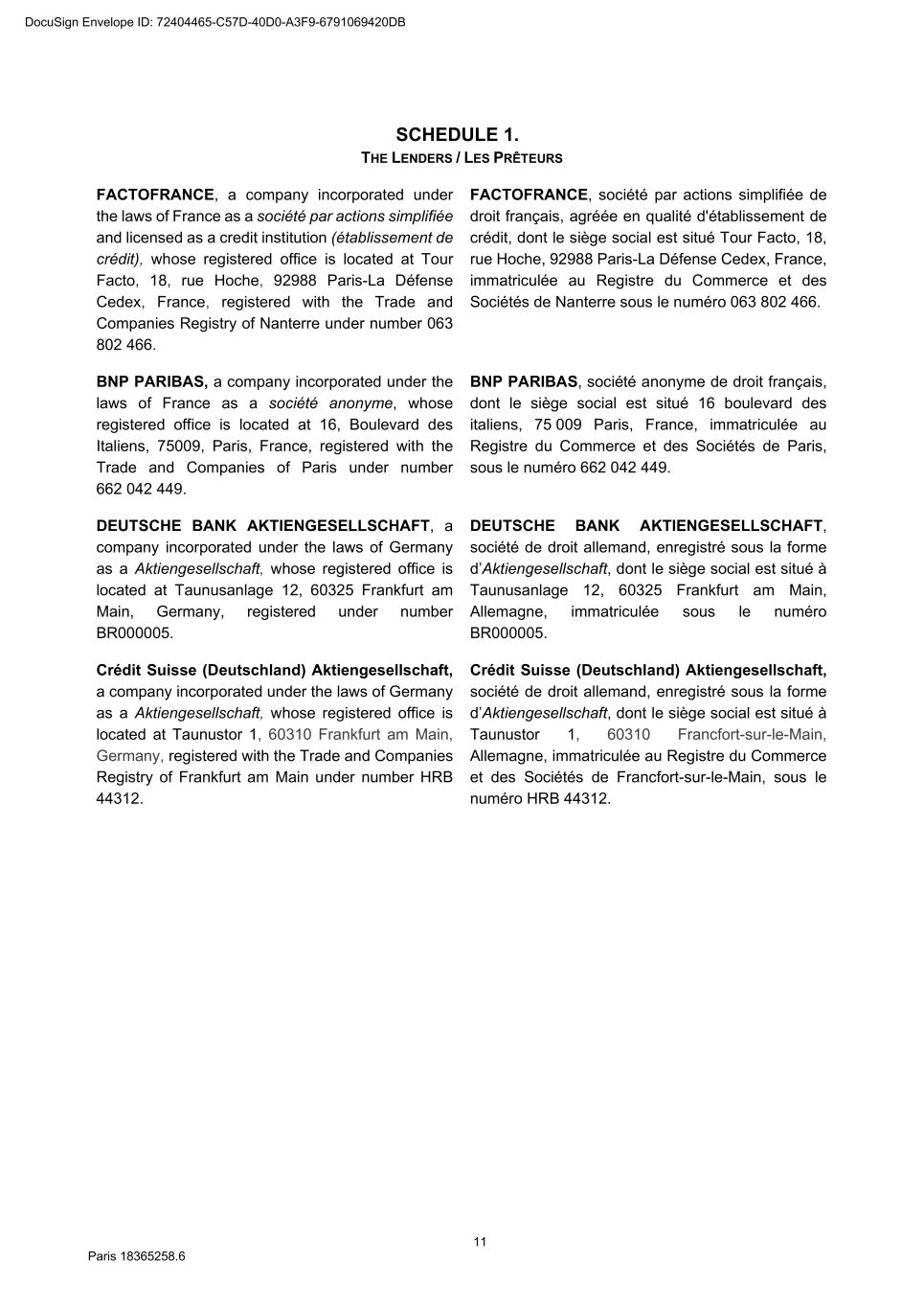 80 Paris 18365539.6 SCHEDULE 1. THE LENDERS Name of Original Lender Commitment Factofrance 40,000,000 euros BNP Paribas 30,000,000 euros Deutsche Bank Aktiengesellschaft 30,000,000 euros DocuSign Envelope ID: 72404465-C57D-40D0-A3F9-6791069420DB