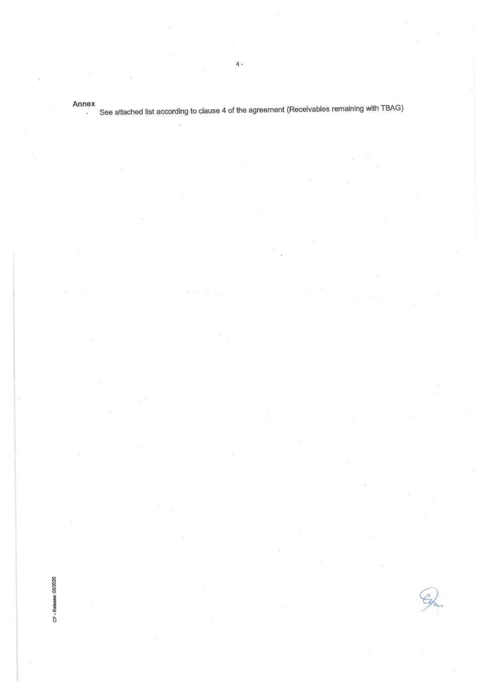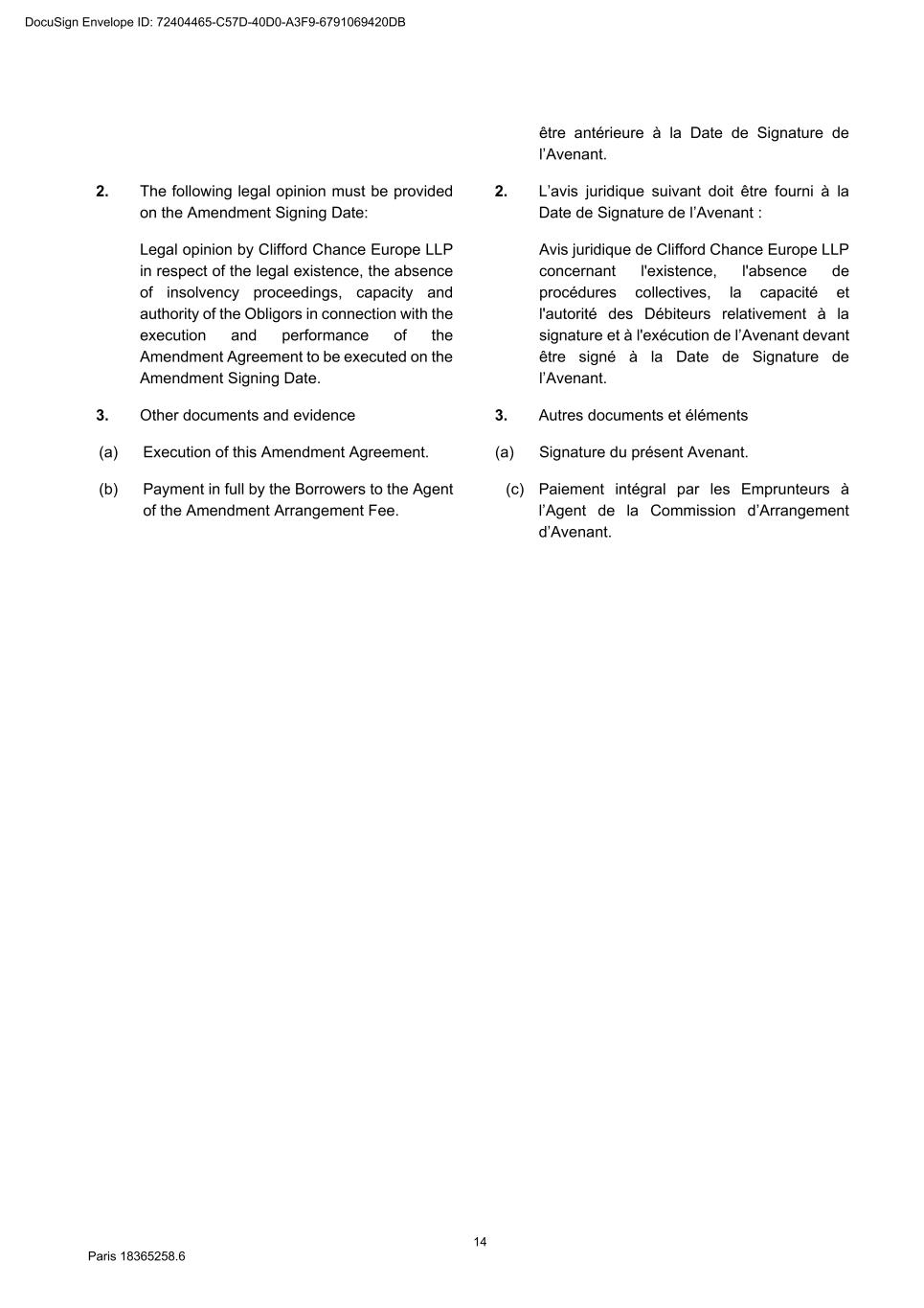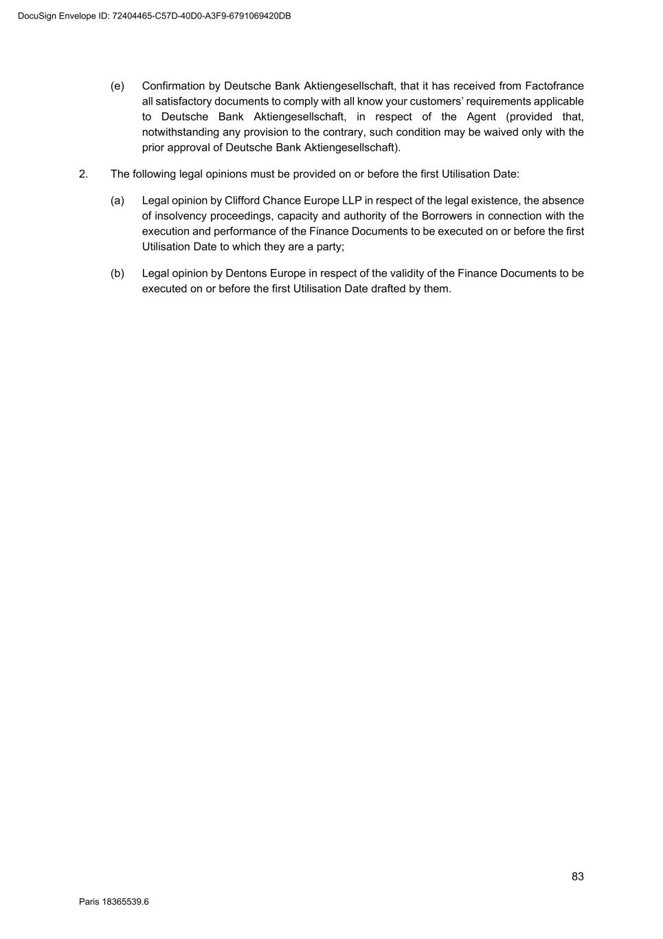 83 Paris 18365539.6 (e) Confirmation by Deutsche Bank Aktiengesellschaft, that it has received from Factofrance all satisfactory documents to comply with all know your customers’ requirements applicable to Deutsche Bank Aktiengesellschaft, in respect of the Agent (provided that, notwithstanding any provision to the contrary, such condition may be waived only with the prior approval of Deutsche Bank Aktiengesellschaft). 2. The following legal opinions must be provided on or before the first Utilisation Date: (a) Legal opinion by Clifford Chance Europe LLP in respect of the legal existence, the absence of insolvency proceedings, capacity and authority of the Borrowers in connection with the execution and performance of the Finance Documents to be executed on or before the first Utilisation Date to which they are a party; (b) Legal opinion by Dentons Europe in respect of the validity of the Finance Documents to be executed on or before the first Utilisation Date drafted by them. DocuSign Envelope ID: 72404465-C57D-40D0-A3F9-6791069420DB