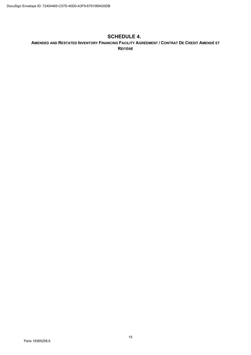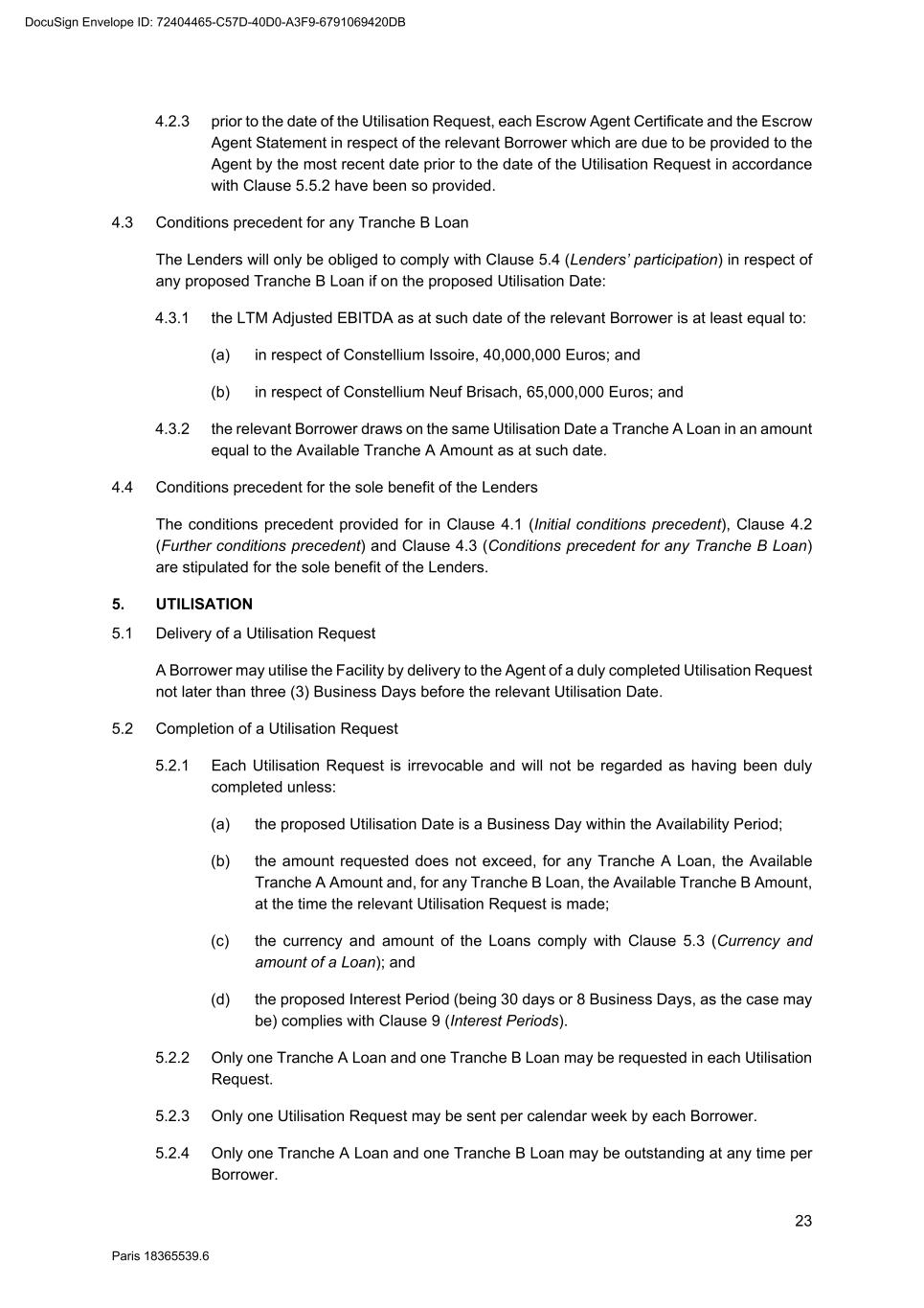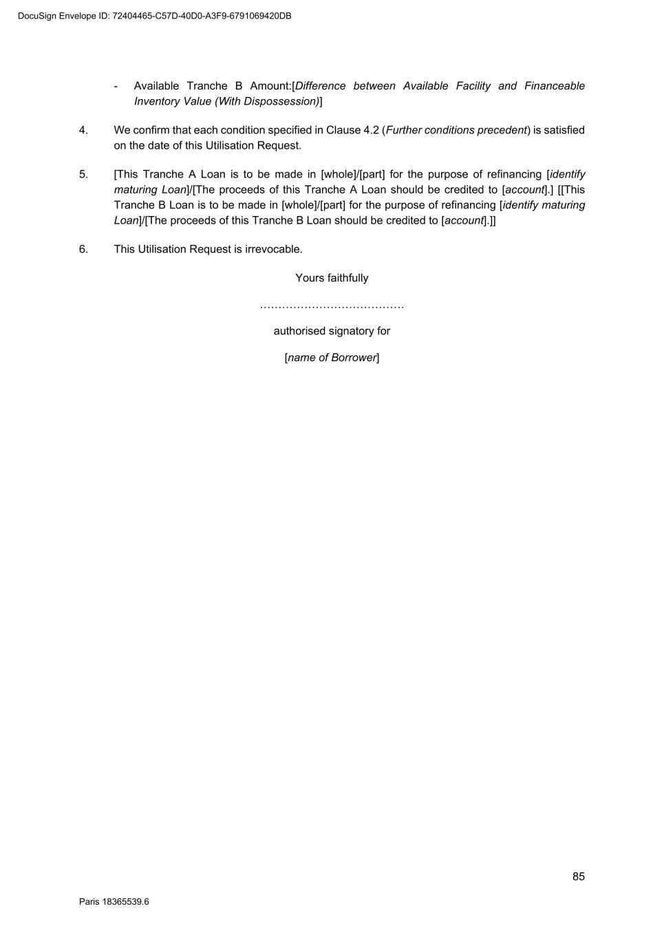 85 Paris 18365539.6 - Available Tranche B Amount:[Difference between Available Facility and Financeable Inventory Value (With Dispossession)] 4. We confirm that each condition specified in Clause 4.2 (Further conditions precedent) is satisfied on the date of this Utilisation Request. 5. [This Tranche A Loan is to be made in [whole]/[part] for the purpose of refinancing [identify maturing Loan]/[The proceeds of this Tranche A Loan should be credited to [account].] [[This Tranche B Loan is to be made in [whole]/[part] for the purpose of refinancing [identify maturing Loan]/[The proceeds of this Tranche B Loan should be credited to [account].]] 6. This Utilisation Request is irrevocable. Yours faithfully ………………………………… authorised signatory for [name of Borrower] DocuSign Envelope ID: 72404465-C57D-40D0-A3F9-6791069420DB
