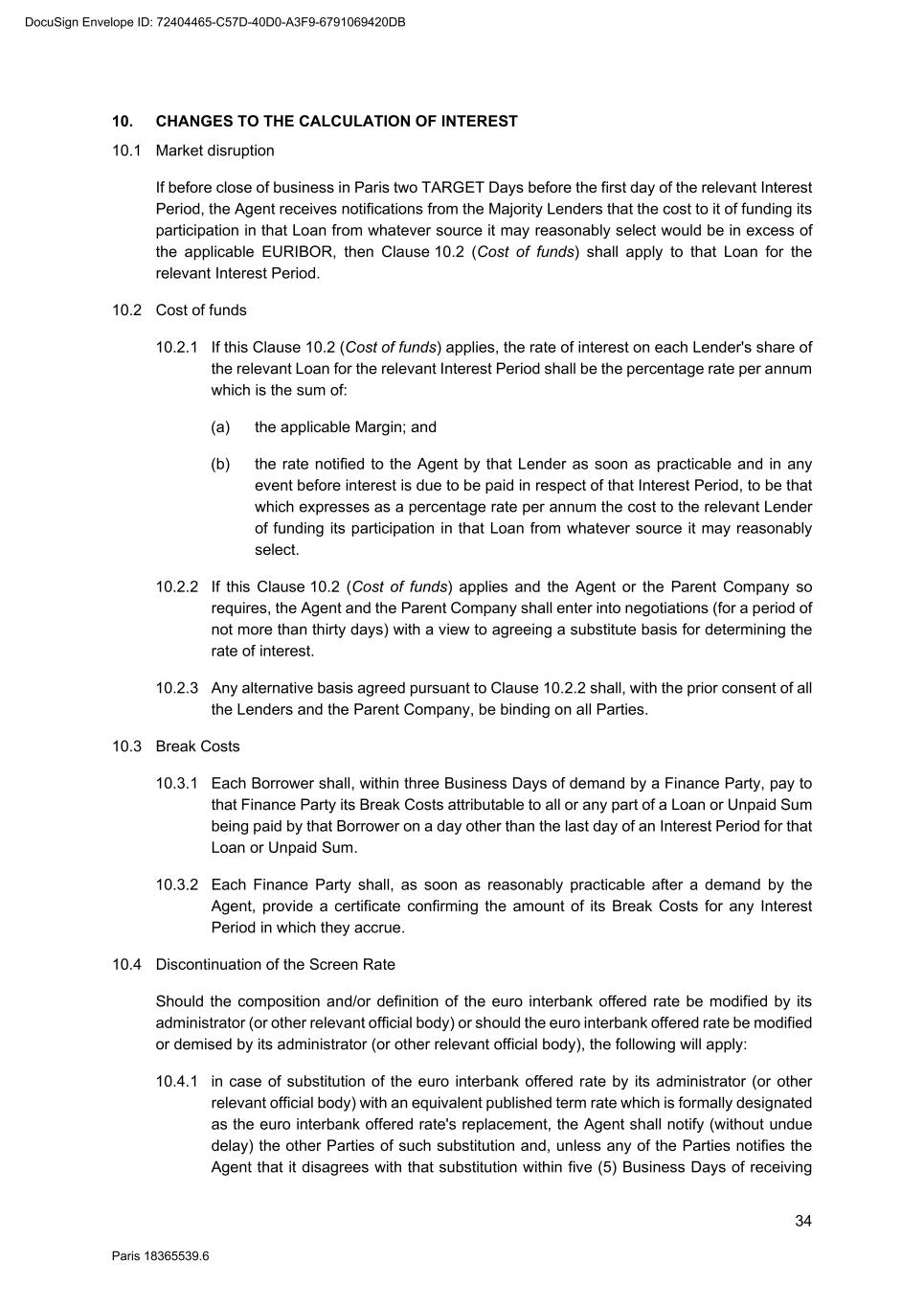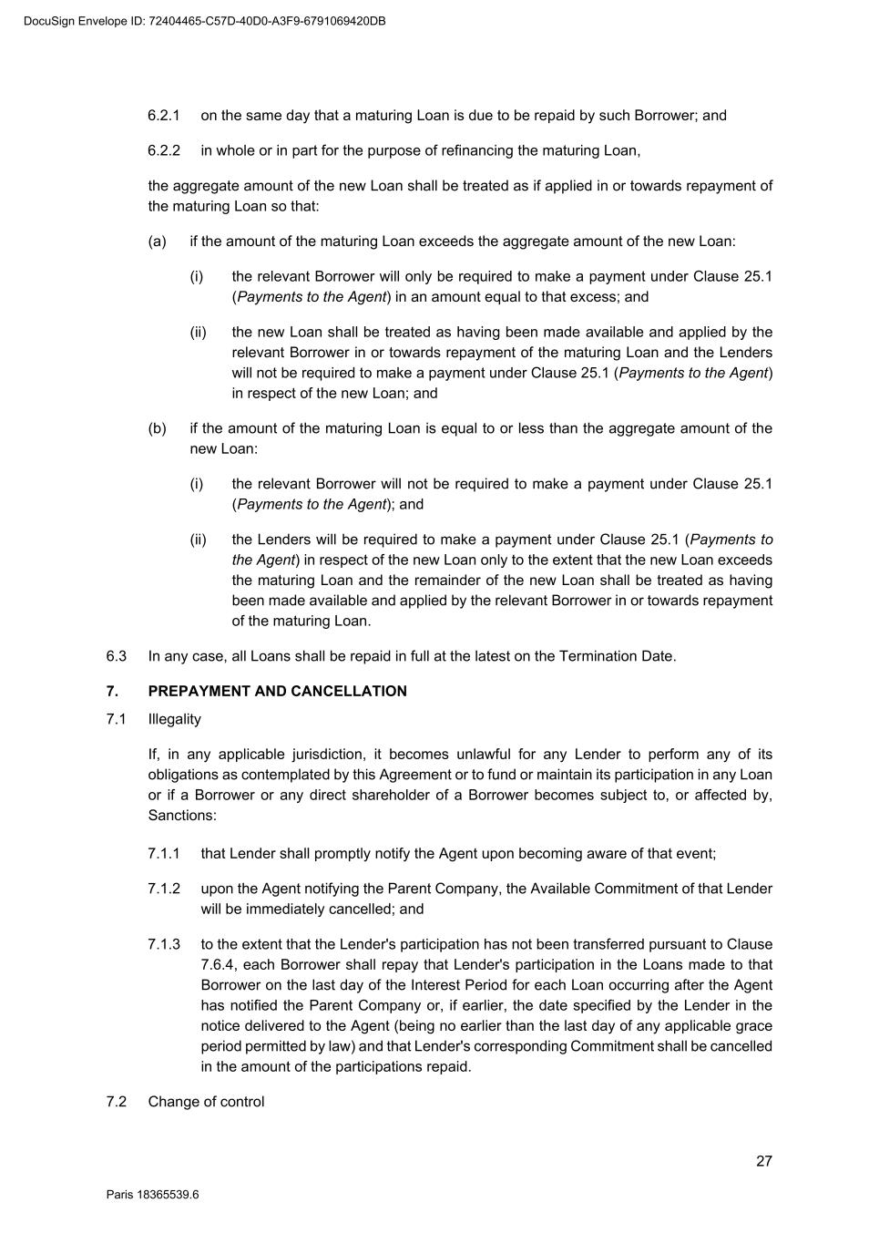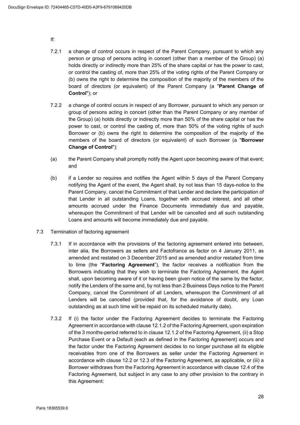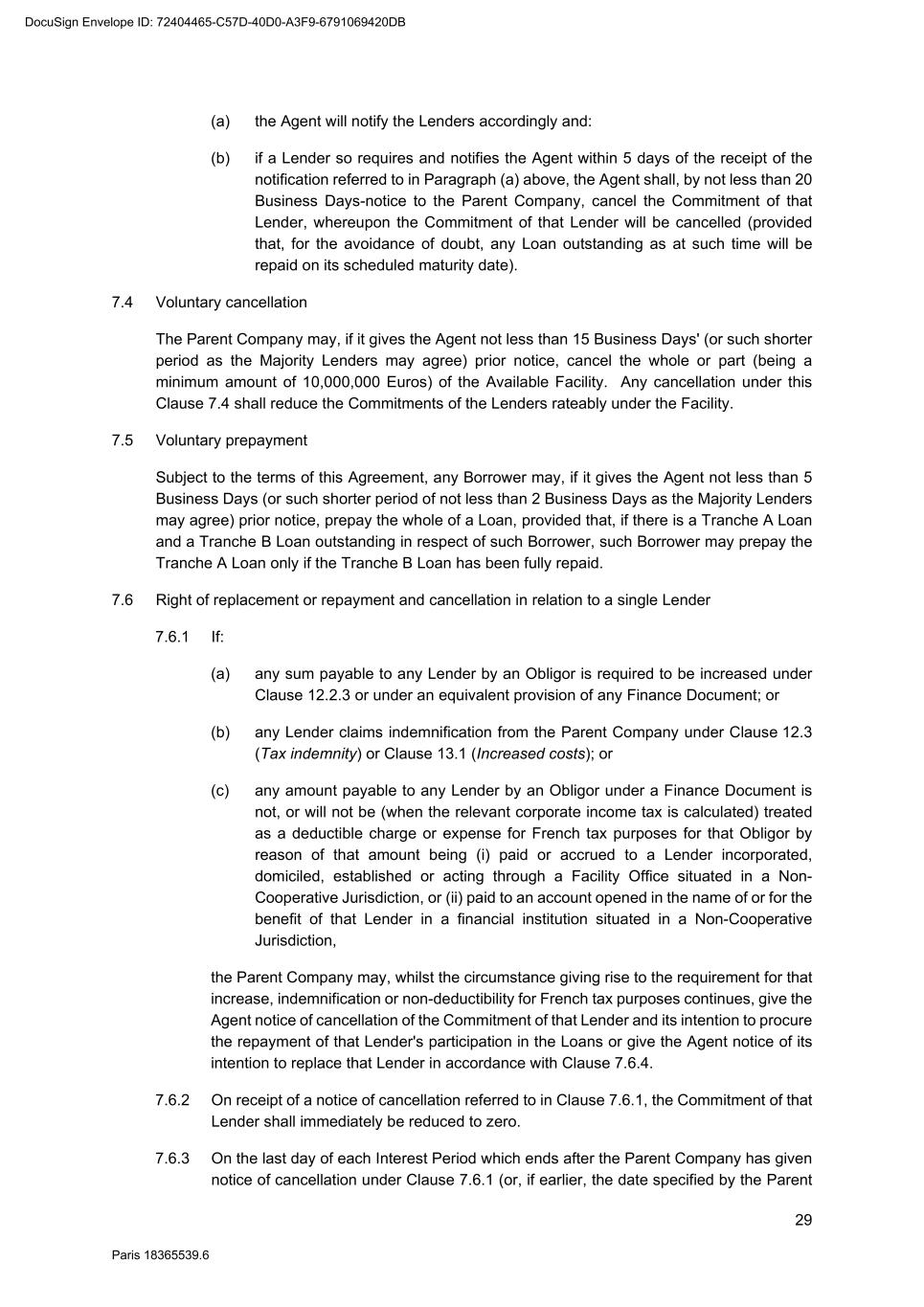 70 Paris 18365539.6 be necessary, be amended to comply with any generally accepted conventions and market practice in the Relevant Market and otherwise to reflect the change in currency. 25.10 Disruption to Payment Systems etc. If either the Agent determines (in its discretion) that a Disruption Event has occurred or the Agent is notified by the Parent Company that a Disruption Event has occurred: 25.10.1 the Agent may, and shall if requested to do so by the Parent Company, consult with the Parent Company with a view to agreeing with the Parent Company such changes to the operation or administration of the Facility as the Agent may deem necessary in the circumstances; 25.10.2 the Agent shall not be obliged to consult with the Parent Company in relation to any changes mentioned in Clause 25.10.1 if, in its opinion, it is not practicable to do so in the circumstances and, in any event, shall have no obligation to agree to such changes; 25.10.3 the Agent may consult with the Finance Parties in relation to any changes mentioned in Clause 25.10.1 but shall not be obliged to do so if, in its opinion, it is not practicable to do so in the circumstances; 25.10.4 any such changes agreed upon by the Agent and the Parent Company shall (whether or not it is finally determined that a Disruption Event has occurred) be binding upon the Parties as an amendment to (or, as the case may be, waiver of) the terms of the Finance Documents notwithstanding the provisions of Clause 31 (Amendments and waivers); and 25.10.5 the Agent shall notify the Finance Parties of all changes agreed pursuant to Clause 25.10.4. 26. SET-OFF Without prejudice to Clause 6.2, if a Default is continuing, a Finance Party may set off any matured obligation due from a Borrower under the Finance Documents (to the extent beneficially owned by that Finance Party) against any matured obligation owed by that Finance Party to that Borrower, regardless of the place of payment, booking branch or currency of either obligation. If the obligations are in different currencies, the Finance Party may convert either obligation at a market rate of exchange in its usual course of business for the purpose of the set-off. A Finance Party which has exercised its right of set-off pursuant to this Clause 26 shall promptly notify the Borrower and the Agent of any such set-off or conversion. 27. NOTICES 27.1 Communications in writing Any communication to be made under or in connection with the Finance Documents shall be made in writing and, unless otherwise stated, may be made by electronic mail, normal letter mailed or hand delivered, registered letter or registered letter with acknowledgement of receipt. 27.2 Addresses The address (and the department or officer, if any, for whose attention the communication is to be made) of each Party for any communication or document to be made or delivered under or in connection with the Finance Documents is: DocuSign Envelope ID: 72404465-C57D-40D0-A3F9-6791069420DB