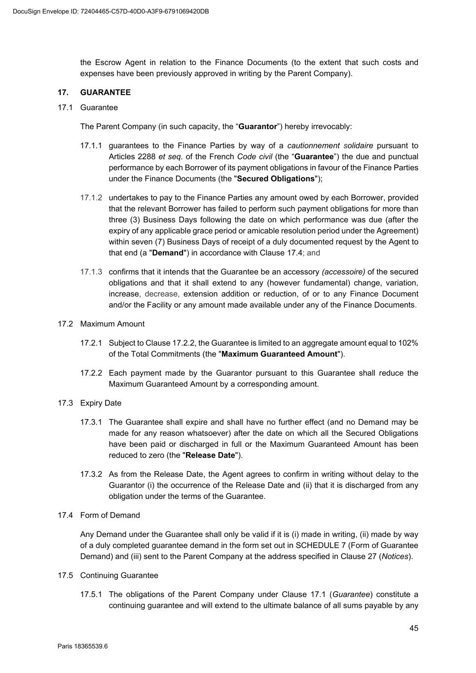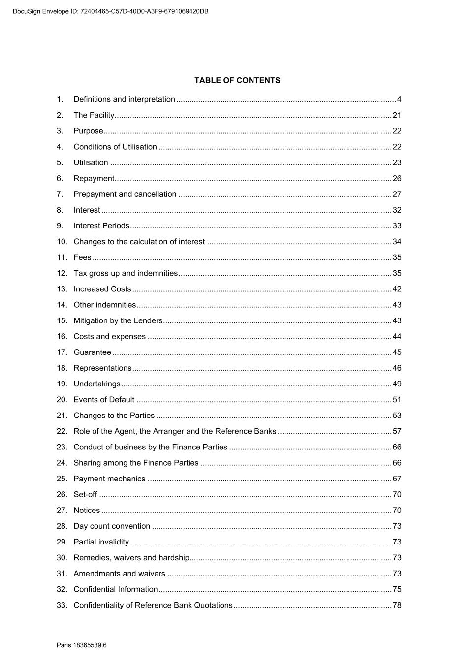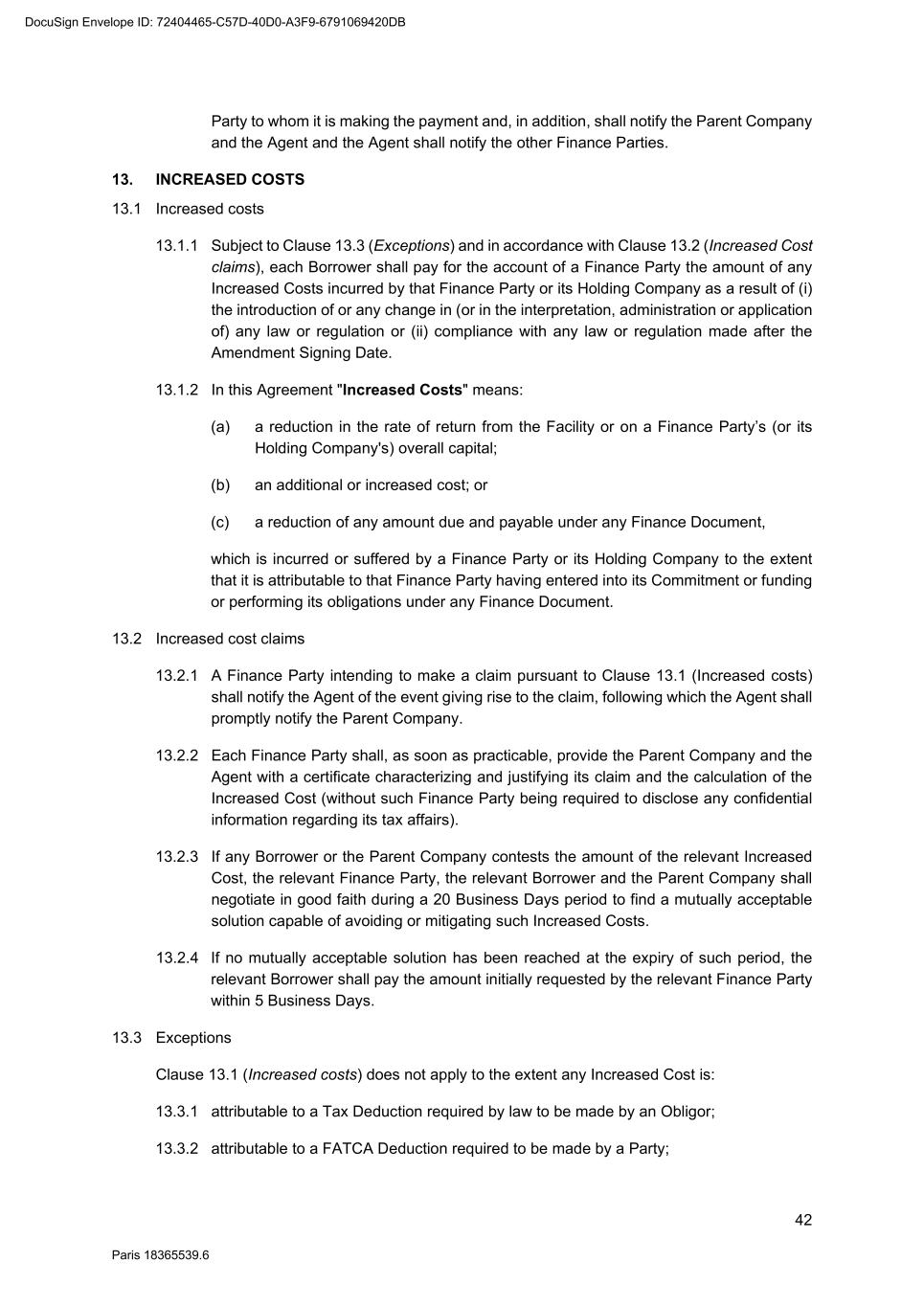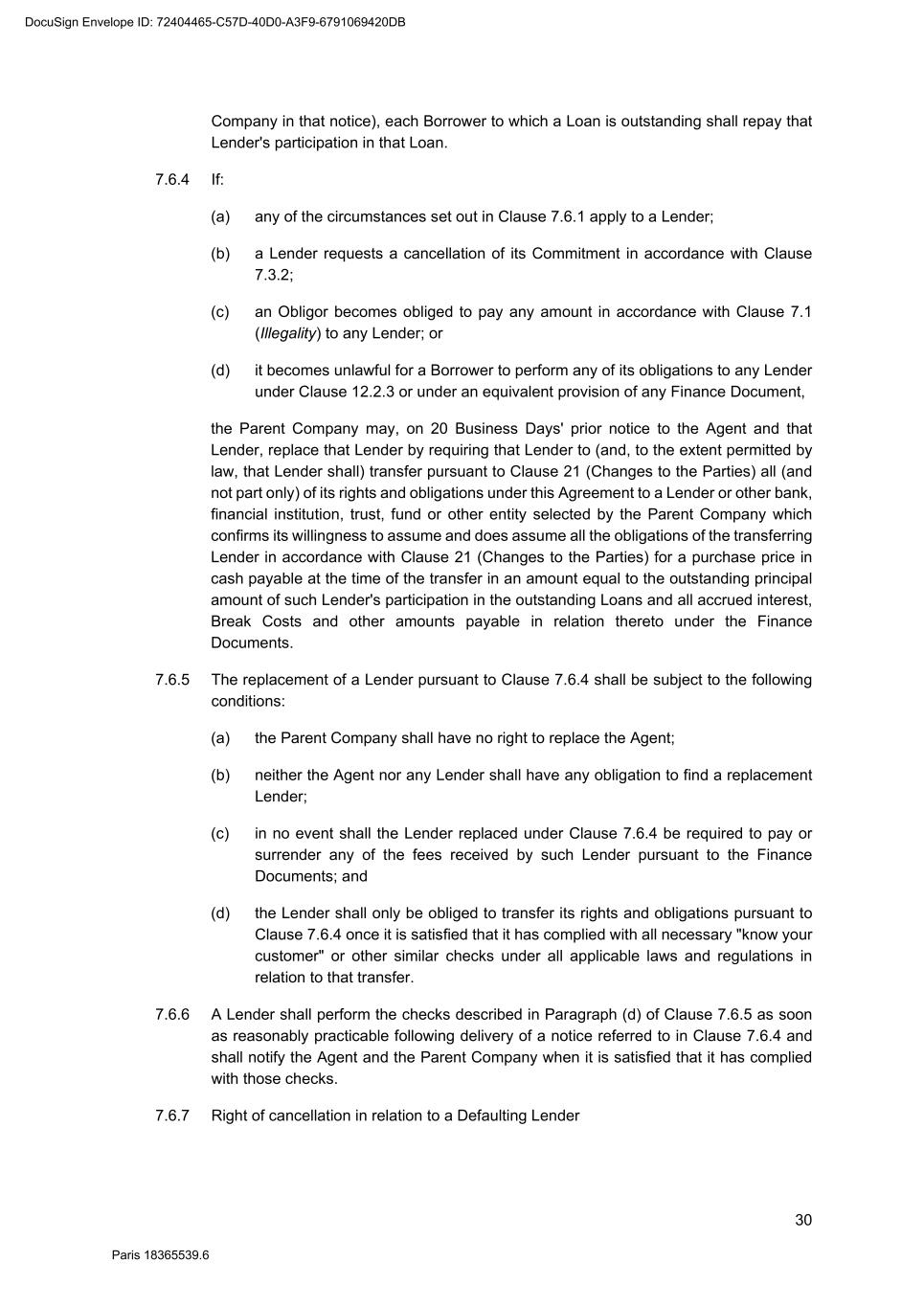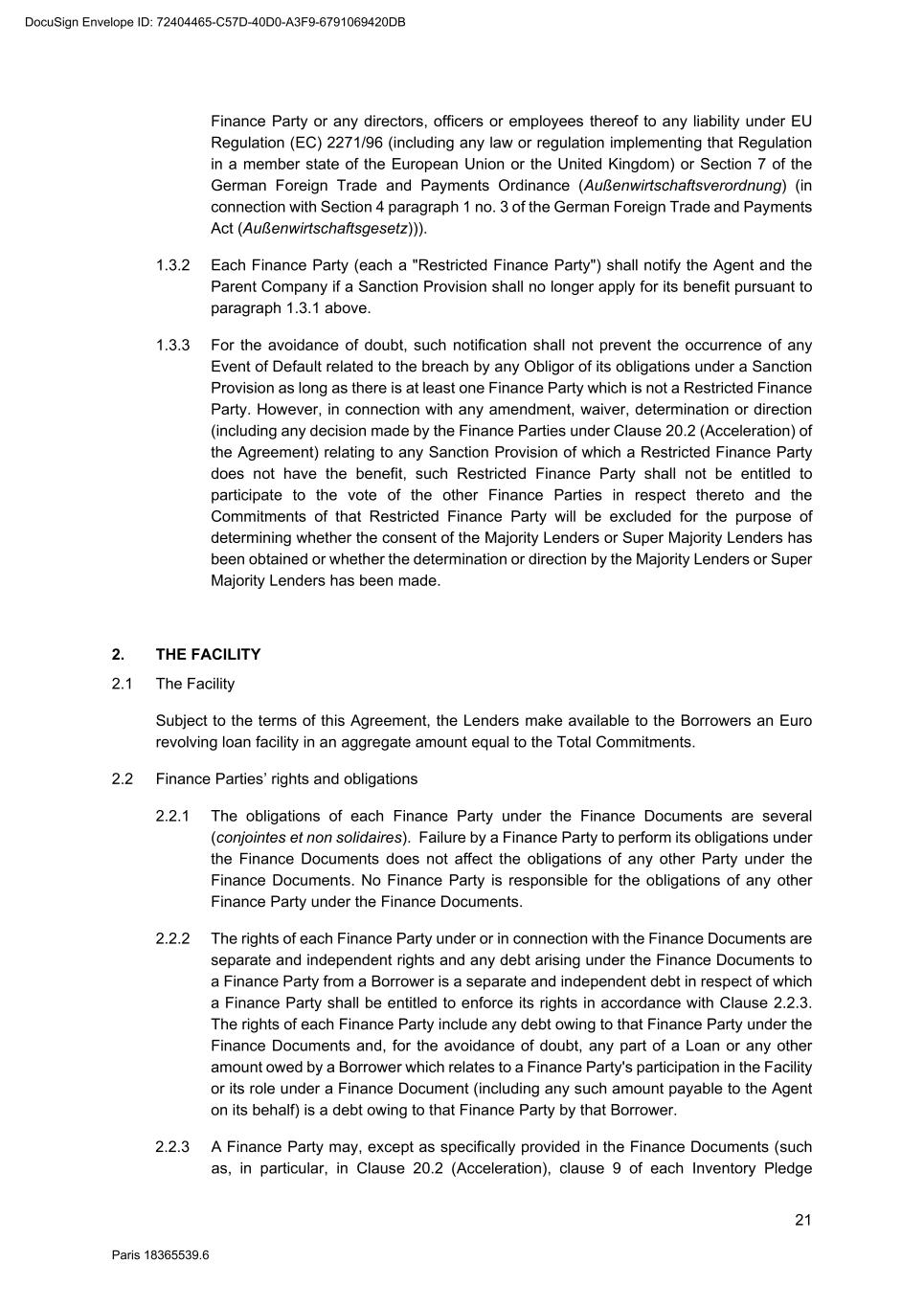 70 Paris 18365539.6 be necessary, be amended to comply with any generally accepted conventions and market practice in the Relevant Market and otherwise to reflect the change in currency. 25.10 Disruption to Payment Systems etc. If either the Agent determines (in its discretion) that a Disruption Event has occurred or the Agent is notified by the Parent Company that a Disruption Event has occurred: 25.10.1 the Agent may, and shall if requested to do so by the Parent Company, consult with the Parent Company with a view to agreeing with the Parent Company such changes to the operation or administration of the Facility as the Agent may deem necessary in the circumstances; 25.10.2 the Agent shall not be obliged to consult with the Parent Company in relation to any changes mentioned in Clause 25.10.1 if, in its opinion, it is not practicable to do so in the circumstances and, in any event, shall have no obligation to agree to such changes; 25.10.3 the Agent may consult with the Finance Parties in relation to any changes mentioned in Clause 25.10.1 but shall not be obliged to do so if, in its opinion, it is not practicable to do so in the circumstances; 25.10.4 any such changes agreed upon by the Agent and the Parent Company shall (whether or not it is finally determined that a Disruption Event has occurred) be binding upon the Parties as an amendment to (or, as the case may be, waiver of) the terms of the Finance Documents notwithstanding the provisions of Clause 31 (Amendments and waivers); and 25.10.5 the Agent shall notify the Finance Parties of all changes agreed pursuant to Clause 25.10.4. 26. SET-OFF Without prejudice to Clause 6.2, if a Default is continuing, a Finance Party may set off any matured obligation due from a Borrower under the Finance Documents (to the extent beneficially owned by that Finance Party) against any matured obligation owed by that Finance Party to that Borrower, regardless of the place of payment, booking branch or currency of either obligation. If the obligations are in different currencies, the Finance Party may convert either obligation at a market rate of exchange in its usual course of business for the purpose of the set-off. A Finance Party which has exercised its right of set-off pursuant to this Clause 26 shall promptly notify the Borrower and the Agent of any such set-off or conversion. 27. NOTICES 27.1 Communications in writing Any communication to be made under or in connection with the Finance Documents shall be made in writing and, unless otherwise stated, may be made by electronic mail, normal letter mailed or hand delivered, registered letter or registered letter with acknowledgement of receipt. 27.2 Addresses The address (and the department or officer, if any, for whose attention the communication is to be made) of each Party for any communication or document to be made or delivered under or in connection with the Finance Documents is: DocuSign Envelope ID: 72404465-C57D-40D0-A3F9-6791069420DB