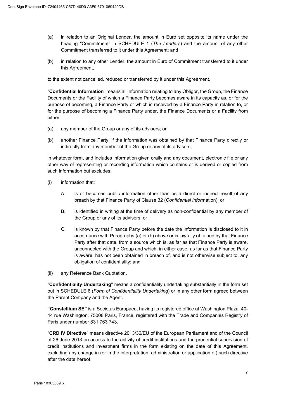 75 Paris 18365539.6 31.3.2 any condition precedent provided for in Clause 4 (Conditions of Utilisation) and Clause 5 (Utilisation); or 31.3.3 Clause 20 (Events of Default), shall not be made without the prior consent of the Super Majority Lenders. 31.4 Other exceptions An amendment or waiver which relates to the rights or obligations of the Agent, the Arranger or a Reference Bank (each in their capacity as such) may not be effected without the consent of the Agent, the Arranger, or that Reference Bank as the case may be. 32. CONFIDENTIAL INFORMATION 32.1 Confidentiality 32.1.1 Each Finance Party agrees to keep all Confidential Information confidential and not to disclose it to anyone, save to the extent permitted by Clause 32.1.2 (Disclosure of Confidential Information), and to ensure that all Confidential Information is protected with security measures and a degree of care that would apply to its own confidential information. 32.1.2 Disclosure of Confidential Information Any Finance Party may, without prejudice to the provisions of article L.511-33 of the French Code monétaire et financier, disclose: (a) to any of its Affiliates and Related Funds and any of its or their officers, directors, employees, professional advisers, auditors, partners and representatives such Confidential Information as that Finance Party shall consider appropriate if any person to whom the Confidential Information is to be given pursuant to this Paragraph (a) is informed in writing of its confidential nature and that some or all of such Confidential Information may be price-sensitive information except that there shall be no such requirement to so inform if the recipient is subject to professional obligations to maintain the confidentiality of the information or is otherwise bound by requirements of confidentiality in relation to the Confidential Information; (b) to any person: (i) to (or through) whom it transfers (or may potentially transfer) all or any of its rights and/or obligations under one or more Finance Documents or which succeeds (or which may potentially succeed) it as Agent and, in each case, to any of that person's Affiliates, Related Funds, representatives and professional advisers; (ii) with (or through) whom it enters into (or may potentially enter into), whether directly or indirectly, any sub-participation in relation to, or any other transaction under which payments are to be made or may be made by reference to, one or more Finance Documents and/or one or more Obligors and to any of that person's Affiliates, Related Funds, representatives and professional advisers; DocuSign Envelope ID: 72404465-C57D-40D0-A3F9-6791069420DB
