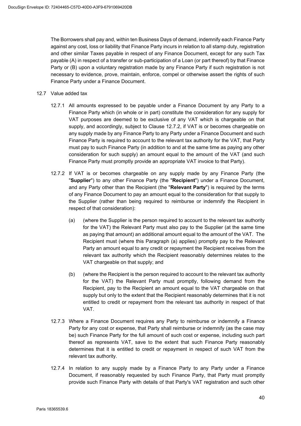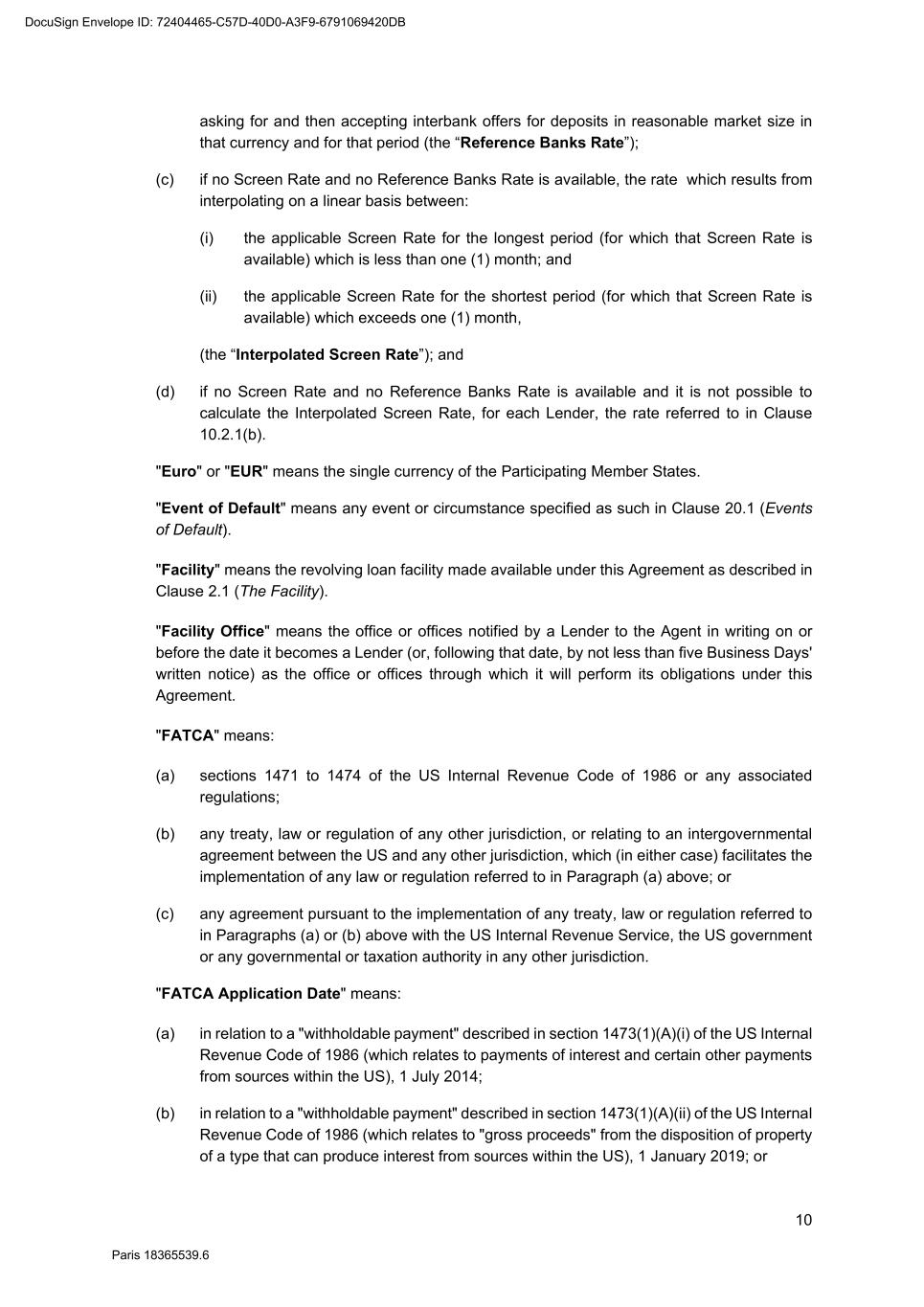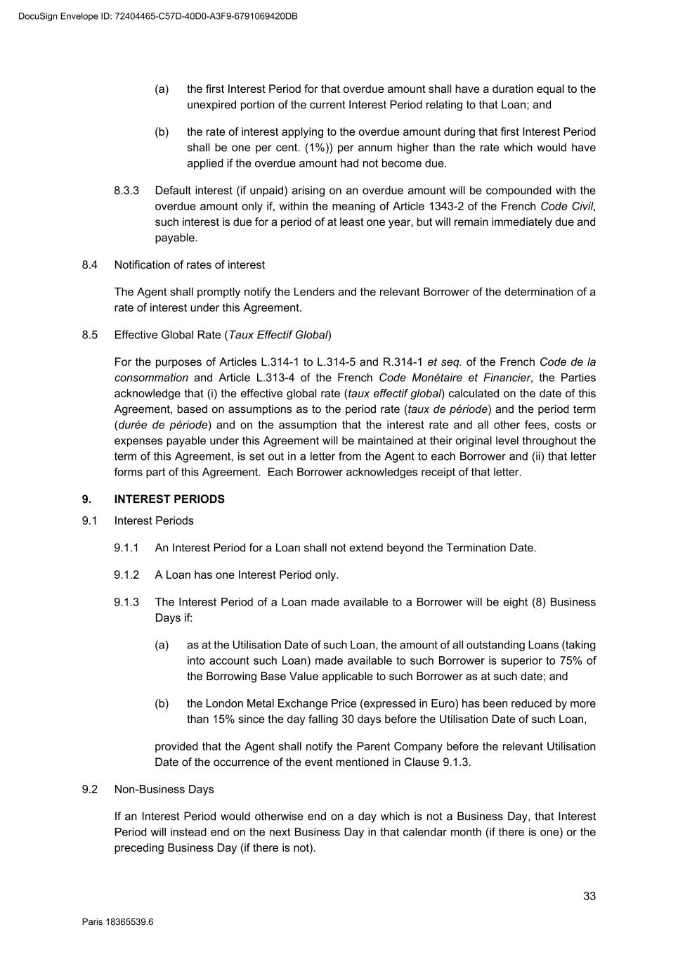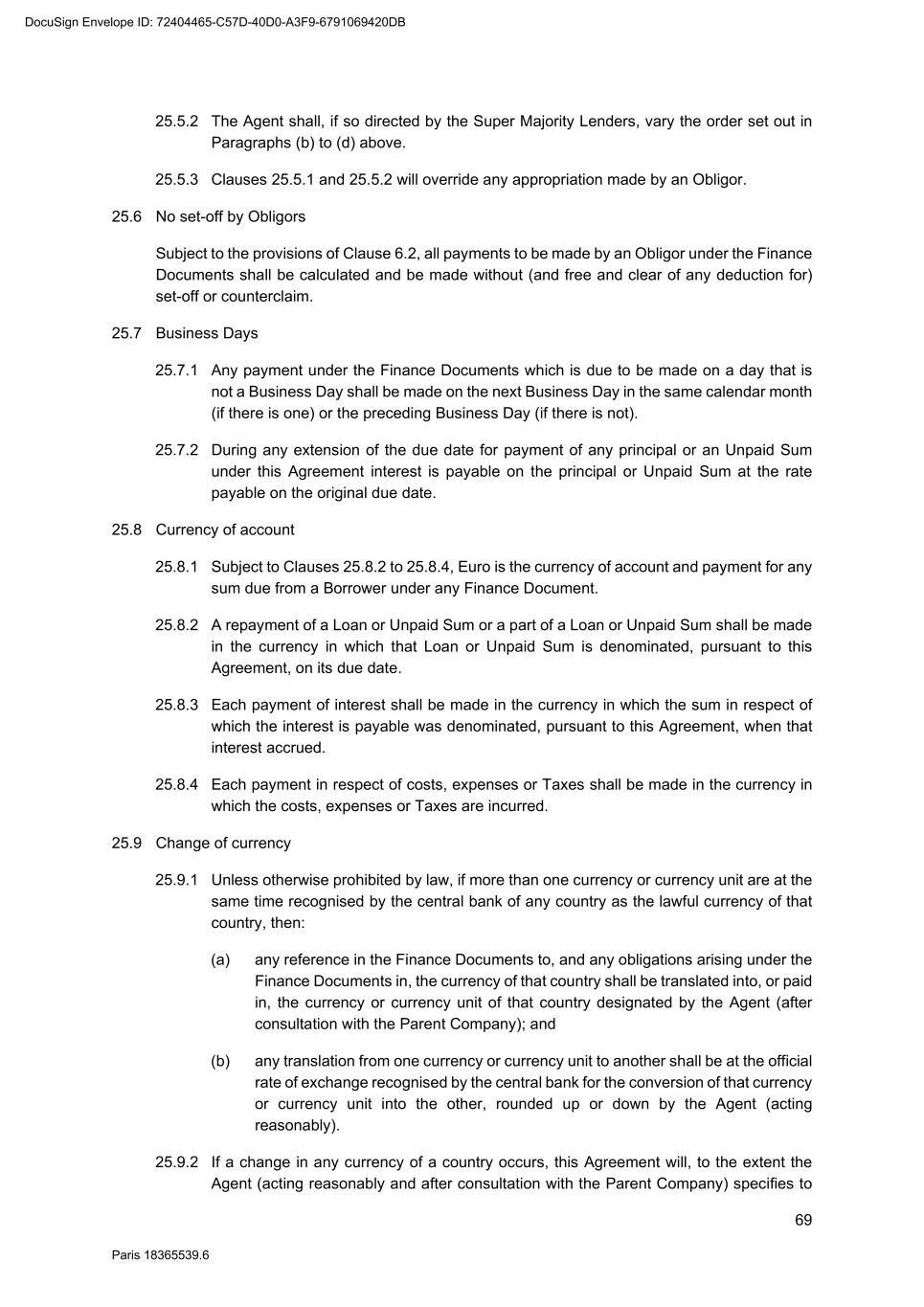 69 Paris 18365539.6 25.5.2 The Agent shall, if so directed by the Super Majority Lenders, vary the order set out in Paragraphs (b) to (d) above. 25.5.3 Clauses 25.5.1 and 25.5.2 will override any appropriation made by an Obligor. 25.6 No set-off by Obligors Subject to the provisions of Clause 6.2, all payments to be made by an Obligor under the Finance Documents shall be calculated and be made without (and free and clear of any deduction for) set-off or counterclaim. 25.7 Business Days 25.7.1 Any payment under the Finance Documents which is due to be made on a day that is not a Business Day shall be made on the next Business Day in the same calendar month (if there is one) or the preceding Business Day (if there is not). 25.7.2 During any extension of the due date for payment of any principal or an Unpaid Sum under this Agreement interest is payable on the principal or Unpaid Sum at the rate payable on the original due date. 25.8 Currency of account 25.8.1 Subject to Clauses 25.8.2 to 25.8.4, Euro is the currency of account and payment for any sum due from a Borrower under any Finance Document. 25.8.2 A repayment of a Loan or Unpaid Sum or a part of a Loan or Unpaid Sum shall be made in the currency in which that Loan or Unpaid Sum is denominated, pursuant to this Agreement, on its due date. 25.8.3 Each payment of interest shall be made in the currency in which the sum in respect of which the interest is payable was denominated, pursuant to this Agreement, when that interest accrued. 25.8.4 Each payment in respect of costs, expenses or Taxes shall be made in the currency in which the costs, expenses or Taxes are incurred. 25.9 Change of currency 25.9.1 Unless otherwise prohibited by law, if more than one currency or currency unit are at the same time recognised by the central bank of any country as the lawful currency of that country, then: (a) any reference in the Finance Documents to, and any obligations arising under the Finance Documents in, the currency of that country shall be translated into, or paid in, the currency or currency unit of that country designated by the Agent (after consultation with the Parent Company); and (b) any translation from one currency or currency unit to another shall be at the official rate of exchange recognised by the central bank for the conversion of that currency or currency unit into the other, rounded up or down by the Agent (acting reasonably). 25.9.2 If a change in any currency of a country occurs, this Agreement will, to the extent the Agent (acting reasonably and after consultation with the Parent Company) specifies to DocuSign Envelope ID: 72404465-C57D-40D0-A3F9-6791069420DB