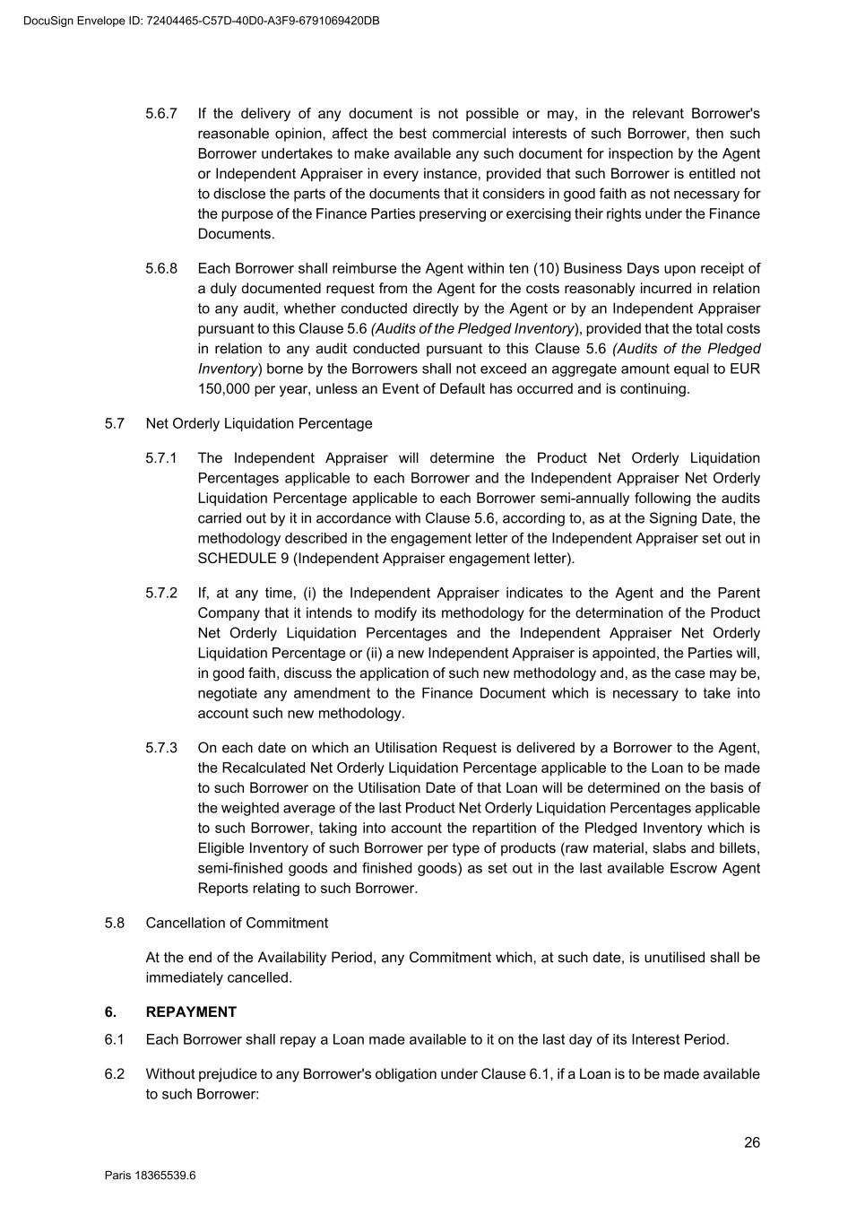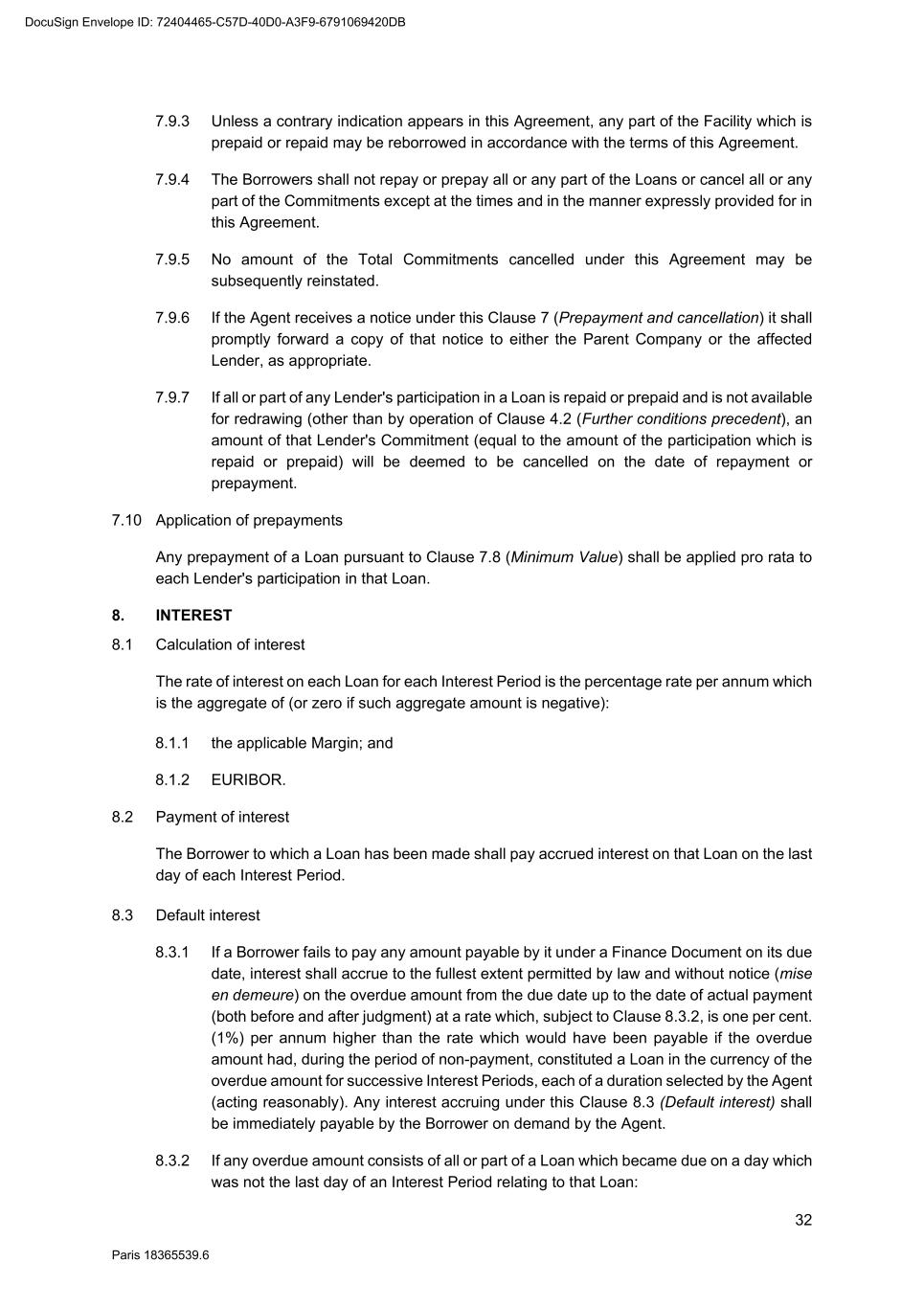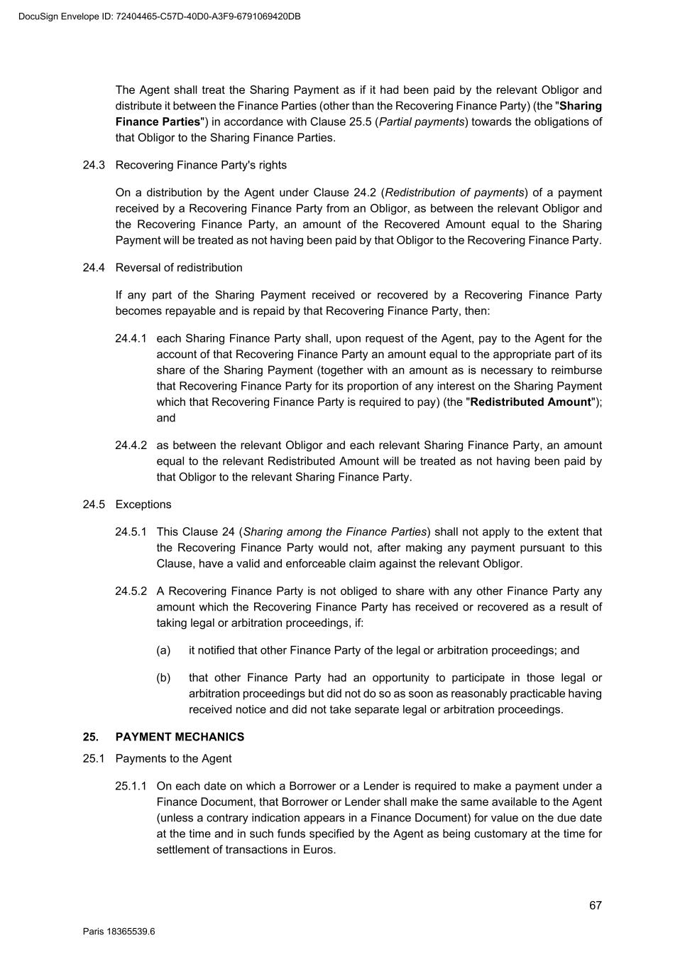 67 Paris 18365539.6 The Agent shall treat the Sharing Payment as if it had been paid by the relevant Obligor and distribute it between the Finance Parties (other than the Recovering Finance Party) (the "Sharing Finance Parties") in accordance with Clause 25.5 (Partial payments) towards the obligations of that Obligor to the Sharing Finance Parties. 24.3 Recovering Finance Party's rights On a distribution by the Agent under Clause 24.2 (Redistribution of payments) of a payment received by a Recovering Finance Party from an Obligor, as between the relevant Obligor and the Recovering Finance Party, an amount of the Recovered Amount equal to the Sharing Payment will be treated as not having been paid by that Obligor to the Recovering Finance Party. 24.4 Reversal of redistribution If any part of the Sharing Payment received or recovered by a Recovering Finance Party becomes repayable and is repaid by that Recovering Finance Party, then: 24.4.1 each Sharing Finance Party shall, upon request of the Agent, pay to the Agent for the account of that Recovering Finance Party an amount equal to the appropriate part of its share of the Sharing Payment (together with an amount as is necessary to reimburse that Recovering Finance Party for its proportion of any interest on the Sharing Payment which that Recovering Finance Party is required to pay) (the "Redistributed Amount"); and 24.4.2 as between the relevant Obligor and each relevant Sharing Finance Party, an amount equal to the relevant Redistributed Amount will be treated as not having been paid by that Obligor to the relevant Sharing Finance Party. 24.5 Exceptions 24.5.1 This Clause 24 (Sharing among the Finance Parties) shall not apply to the extent that the Recovering Finance Party would not, after making any payment pursuant to this Clause, have a valid and enforceable claim against the relevant Obligor. 24.5.2 A Recovering Finance Party is not obliged to share with any other Finance Party any amount which the Recovering Finance Party has received or recovered as a result of taking legal or arbitration proceedings, if: (a) it notified that other Finance Party of the legal or arbitration proceedings; and (b) that other Finance Party had an opportunity to participate in those legal or arbitration proceedings but did not do so as soon as reasonably practicable having received notice and did not take separate legal or arbitration proceedings. 25. PAYMENT MECHANICS 25.1 Payments to the Agent 25.1.1 On each date on which a Borrower or a Lender is required to make a payment under a Finance Document, that Borrower or Lender shall make the same available to the Agent (unless a contrary indication appears in a Finance Document) for value on the due date at the time and in such funds specified by the Agent as being customary at the time for settlement of transactions in Euros. DocuSign Envelope ID: 72404465-C57D-40D0-A3F9-6791069420DB