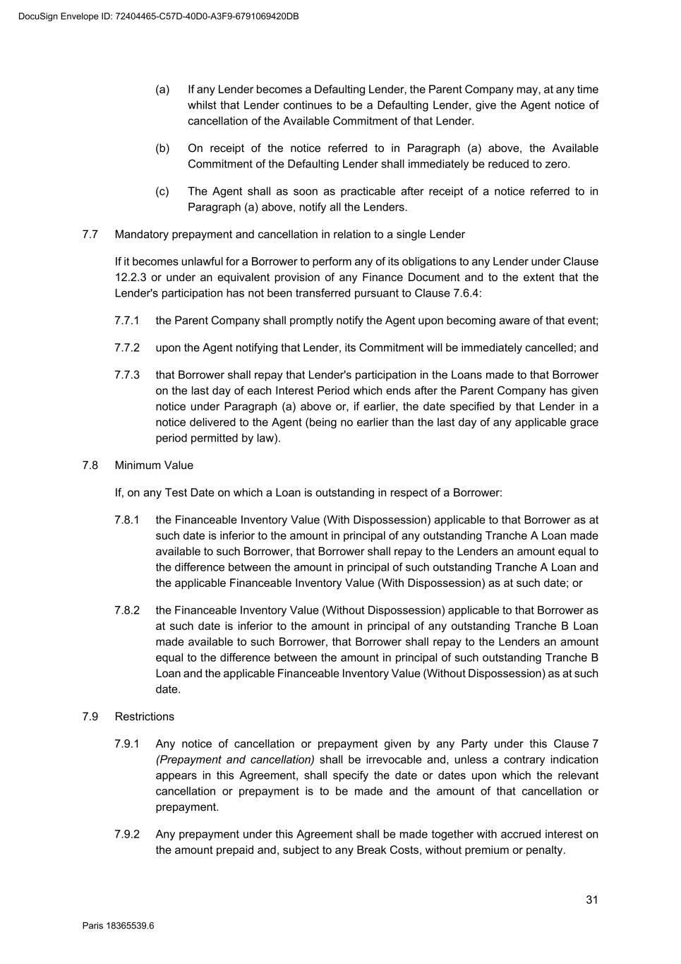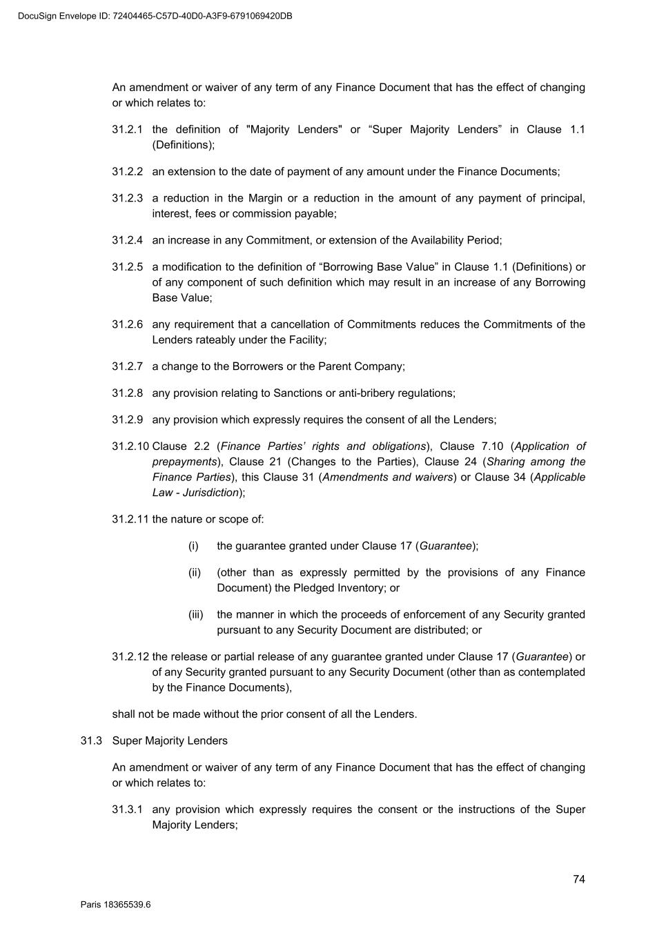 74 Paris 18365539.6 An amendment or waiver of any term of any Finance Document that has the effect of changing or which relates to: 31.2.1 the definition of "Majority Lenders" or “Super Majority Lenders” in Clause 1.1 (Definitions); 31.2.2 an extension to the date of payment of any amount under the Finance Documents; 31.2.3 a reduction in the Margin or a reduction in the amount of any payment of principal, interest, fees or commission payable; 31.2.4 an increase in any Commitment, or extension of the Availability Period; 31.2.5 a modification to the definition of “Borrowing Base Value” in Clause 1.1 (Definitions) or of any component of such definition which may result in an increase of any Borrowing Base Value; 31.2.6 any requirement that a cancellation of Commitments reduces the Commitments of the Lenders rateably under the Facility; 31.2.7 a change to the Borrowers or the Parent Company; 31.2.8 any provision relating to Sanctions or anti-bribery regulations; 31.2.9 any provision which expressly requires the consent of all the Lenders; 31.2.10 Clause 2.2 (Finance Parties’ rights and obligations), Clause 7.10 (Application of prepayments), Clause 21 (Changes to the Parties), Clause 24 (Sharing among the Finance Parties), this Clause 31 (Amendments and waivers) or Clause 34 (Applicable Law - Jurisdiction); 31.2.11 the nature or scope of: (i) the guarantee granted under Clause 17 (Guarantee); (ii) (other than as expressly permitted by the provisions of any Finance Document) the Pledged Inventory; or (iii) the manner in which the proceeds of enforcement of any Security granted pursuant to any Security Document are distributed; or 31.2.12 the release or partial release of any guarantee granted under Clause 17 (Guarantee) or of any Security granted pursuant to any Security Document (other than as contemplated by the Finance Documents), shall not be made without the prior consent of all the Lenders. 31.3 Super Majority Lenders An amendment or waiver of any term of any Finance Document that has the effect of changing or which relates to: 31.3.1 any provision which expressly requires the consent or the instructions of the Super Majority Lenders; DocuSign Envelope ID: 72404465-C57D-40D0-A3F9-6791069420DB