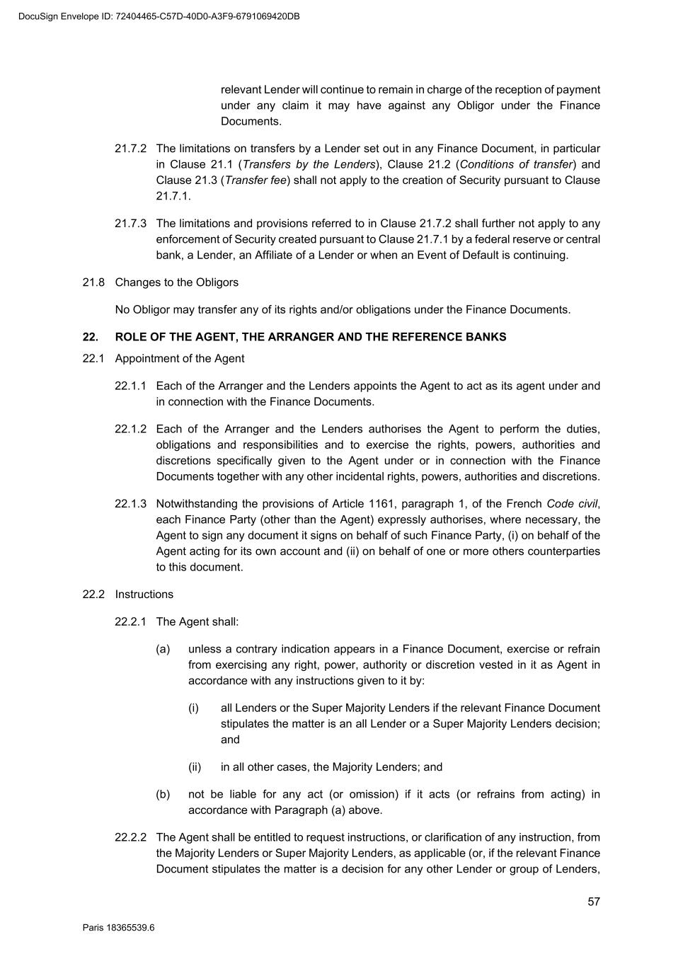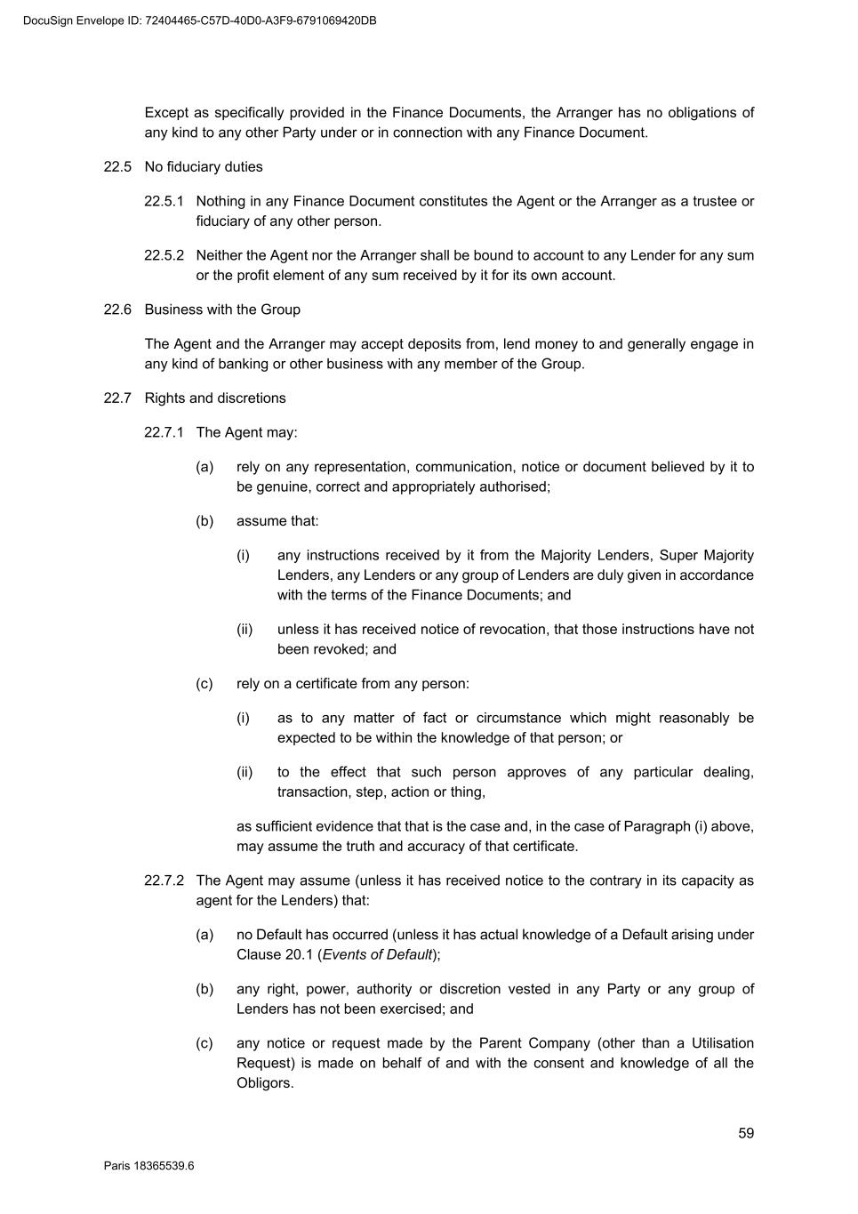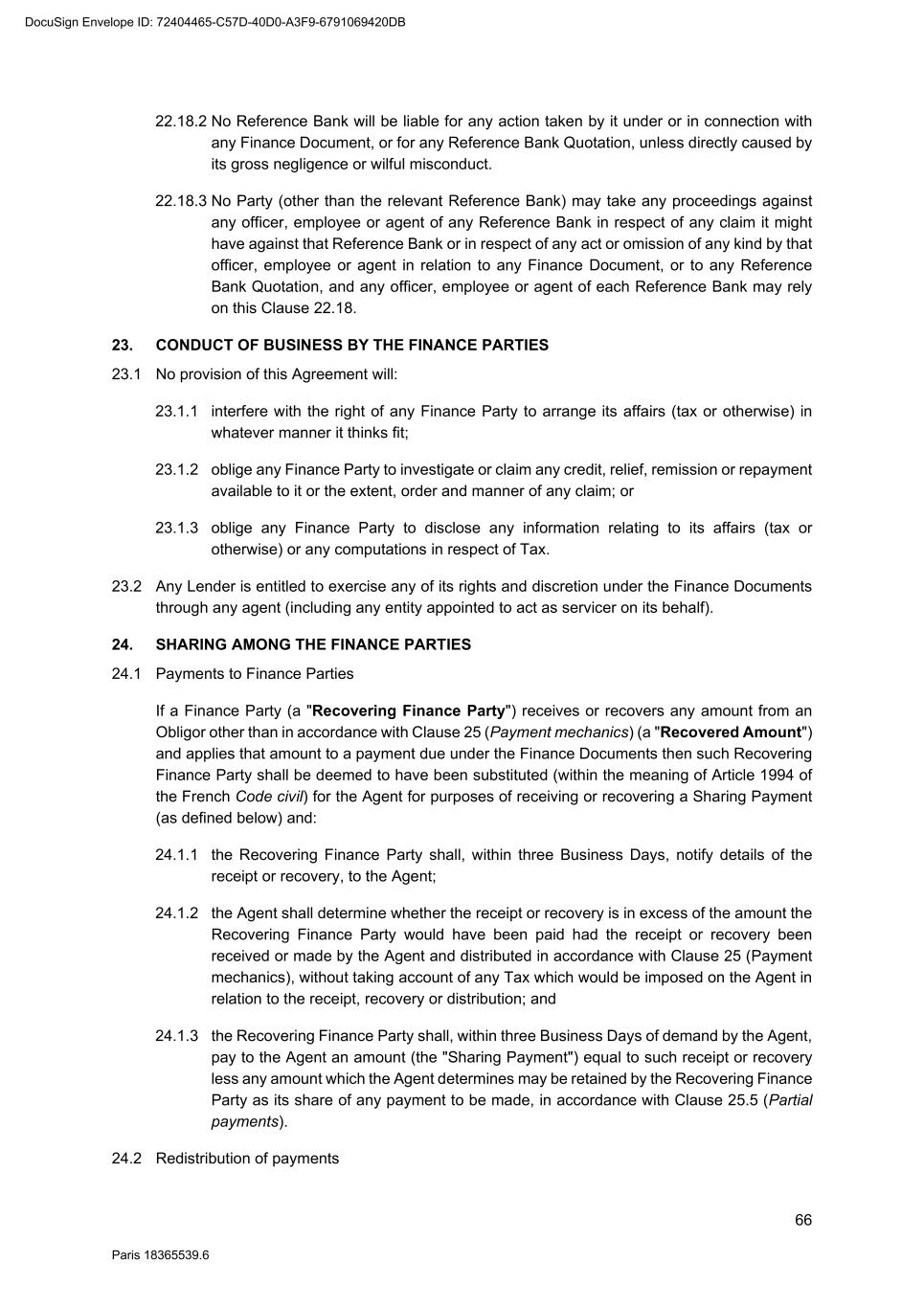 66 Paris 18365539.6 22.18.2 No Reference Bank will be liable for any action taken by it under or in connection with any Finance Document, or for any Reference Bank Quotation, unless directly caused by its gross negligence or wilful misconduct. 22.18.3 No Party (other than the relevant Reference Bank) may take any proceedings against any officer, employee or agent of any Reference Bank in respect of any claim it might have against that Reference Bank or in respect of any act or omission of any kind by that officer, employee or agent in relation to any Finance Document, or to any Reference Bank Quotation, and any officer, employee or agent of each Reference Bank may rely on this Clause 22.18. 23. CONDUCT OF BUSINESS BY THE FINANCE PARTIES 23.1 No provision of this Agreement will: 23.1.1 interfere with the right of any Finance Party to arrange its affairs (tax or otherwise) in whatever manner it thinks fit; 23.1.2 oblige any Finance Party to investigate or claim any credit, relief, remission or repayment available to it or the extent, order and manner of any claim; or 23.1.3 oblige any Finance Party to disclose any information relating to its affairs (tax or otherwise) or any computations in respect of Tax. 23.2 Any Lender is entitled to exercise any of its rights and discretion under the Finance Documents through any agent (including any entity appointed to act as servicer on its behalf). 24. SHARING AMONG THE FINANCE PARTIES 24.1 Payments to Finance Parties If a Finance Party (a "Recovering Finance Party") receives or recovers any amount from an Obligor other than in accordance with Clause 25 (Payment mechanics) (a "Recovered Amount") and applies that amount to a payment due under the Finance Documents then such Recovering Finance Party shall be deemed to have been substituted (within the meaning of Article 1994 of the French Code civil) for the Agent for purposes of receiving or recovering a Sharing Payment (as defined below) and: 24.1.1 the Recovering Finance Party shall, within three Business Days, notify details of the receipt or recovery, to the Agent; 24.1.2 the Agent shall determine whether the receipt or recovery is in excess of the amount the Recovering Finance Party would have been paid had the receipt or recovery been received or made by the Agent and distributed in accordance with Clause 25 (Payment mechanics), without taking account of any Tax which would be imposed on the Agent in relation to the receipt, recovery or distribution; and 24.1.3 the Recovering Finance Party shall, within three Business Days of demand by the Agent, pay to the Agent an amount (the "Sharing Payment") equal to such receipt or recovery less any amount which the Agent determines may be retained by the Recovering Finance Party as its share of any payment to be made, in accordance with Clause 25.5 (Partial payments). 24.2 Redistribution of payments DocuSign Envelope ID: 72404465-C57D-40D0-A3F9-6791069420DB