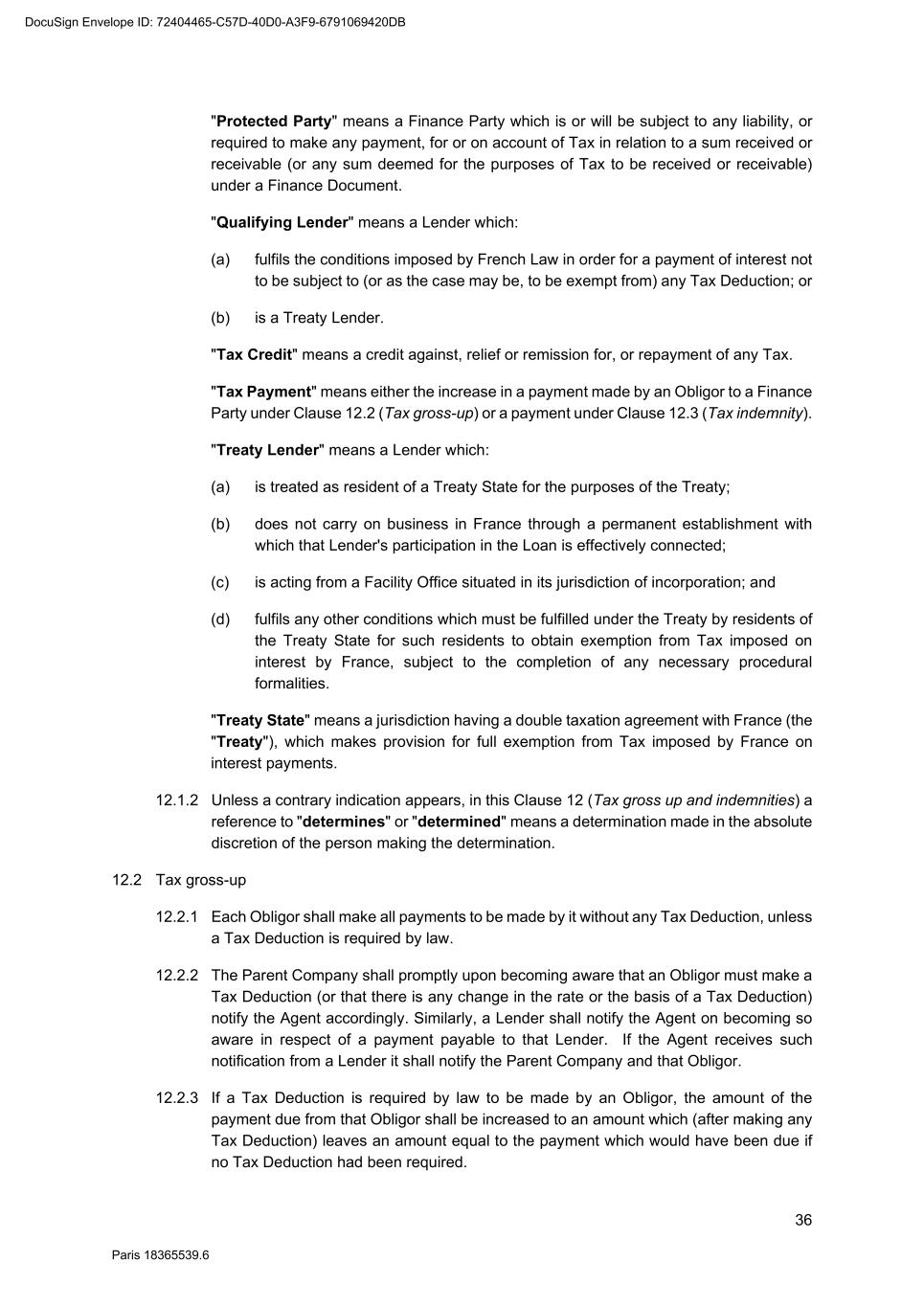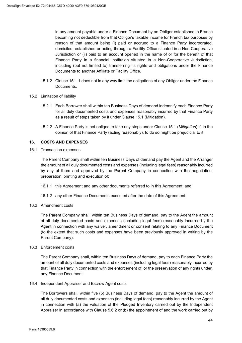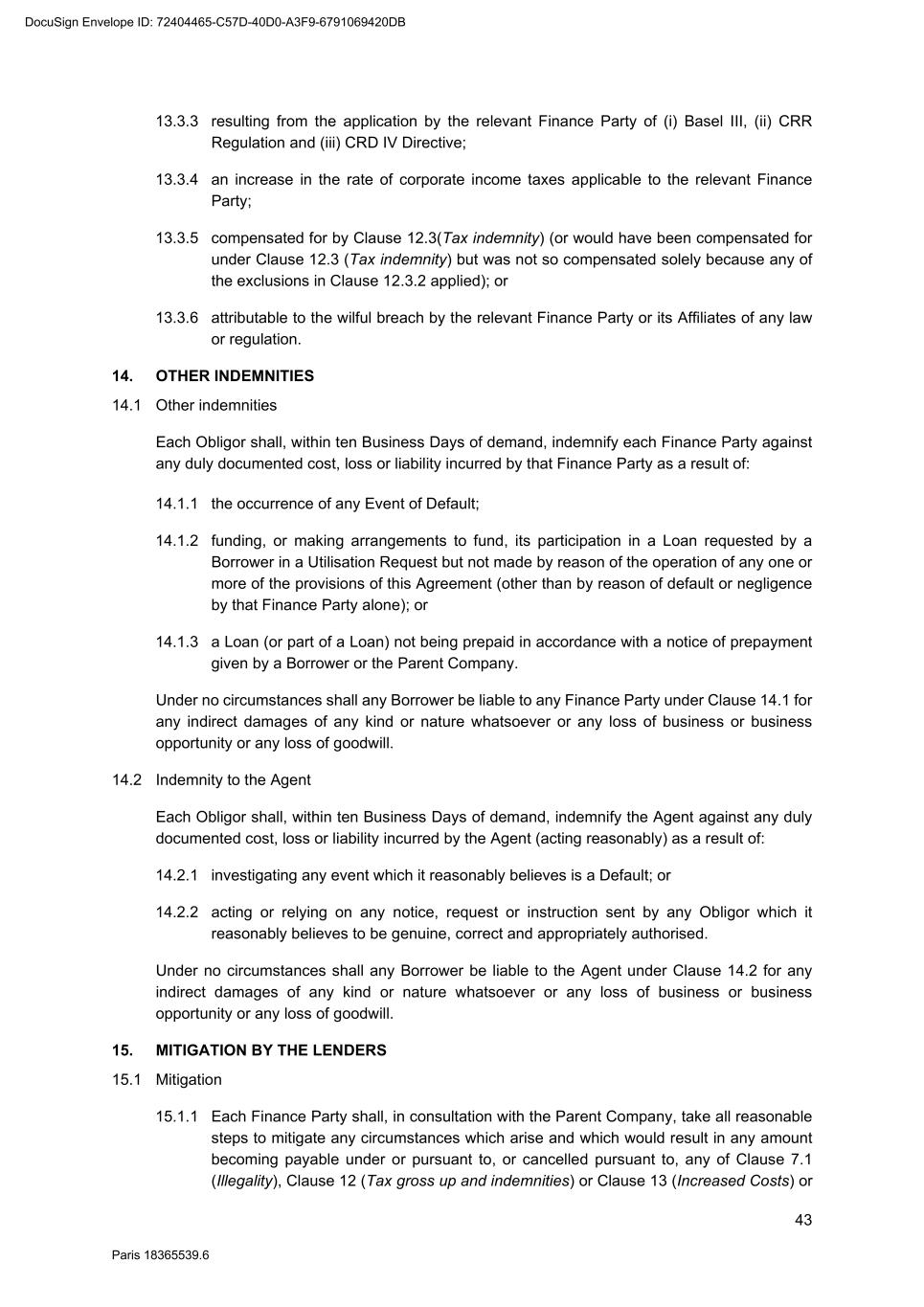 66 Paris 18365539.6 22.18.2 No Reference Bank will be liable for any action taken by it under or in connection with any Finance Document, or for any Reference Bank Quotation, unless directly caused by its gross negligence or wilful misconduct. 22.18.3 No Party (other than the relevant Reference Bank) may take any proceedings against any officer, employee or agent of any Reference Bank in respect of any claim it might have against that Reference Bank or in respect of any act or omission of any kind by that officer, employee or agent in relation to any Finance Document, or to any Reference Bank Quotation, and any officer, employee or agent of each Reference Bank may rely on this Clause 22.18. 23. CONDUCT OF BUSINESS BY THE FINANCE PARTIES 23.1 No provision of this Agreement will: 23.1.1 interfere with the right of any Finance Party to arrange its affairs (tax or otherwise) in whatever manner it thinks fit; 23.1.2 oblige any Finance Party to investigate or claim any credit, relief, remission or repayment available to it or the extent, order and manner of any claim; or 23.1.3 oblige any Finance Party to disclose any information relating to its affairs (tax or otherwise) or any computations in respect of Tax. 23.2 Any Lender is entitled to exercise any of its rights and discretion under the Finance Documents through any agent (including any entity appointed to act as servicer on its behalf). 24. SHARING AMONG THE FINANCE PARTIES 24.1 Payments to Finance Parties If a Finance Party (a "Recovering Finance Party") receives or recovers any amount from an Obligor other than in accordance with Clause 25 (Payment mechanics) (a "Recovered Amount") and applies that amount to a payment due under the Finance Documents then such Recovering Finance Party shall be deemed to have been substituted (within the meaning of Article 1994 of the French Code civil) for the Agent for purposes of receiving or recovering a Sharing Payment (as defined below) and: 24.1.1 the Recovering Finance Party shall, within three Business Days, notify details of the receipt or recovery, to the Agent; 24.1.2 the Agent shall determine whether the receipt or recovery is in excess of the amount the Recovering Finance Party would have been paid had the receipt or recovery been received or made by the Agent and distributed in accordance with Clause 25 (Payment mechanics), without taking account of any Tax which would be imposed on the Agent in relation to the receipt, recovery or distribution; and 24.1.3 the Recovering Finance Party shall, within three Business Days of demand by the Agent, pay to the Agent an amount (the "Sharing Payment") equal to such receipt or recovery less any amount which the Agent determines may be retained by the Recovering Finance Party as its share of any payment to be made, in accordance with Clause 25.5 (Partial payments). 24.2 Redistribution of payments DocuSign Envelope ID: 72404465-C57D-40D0-A3F9-6791069420DB