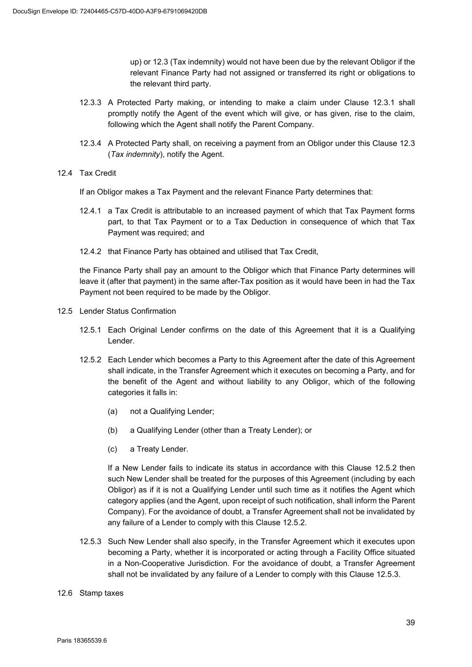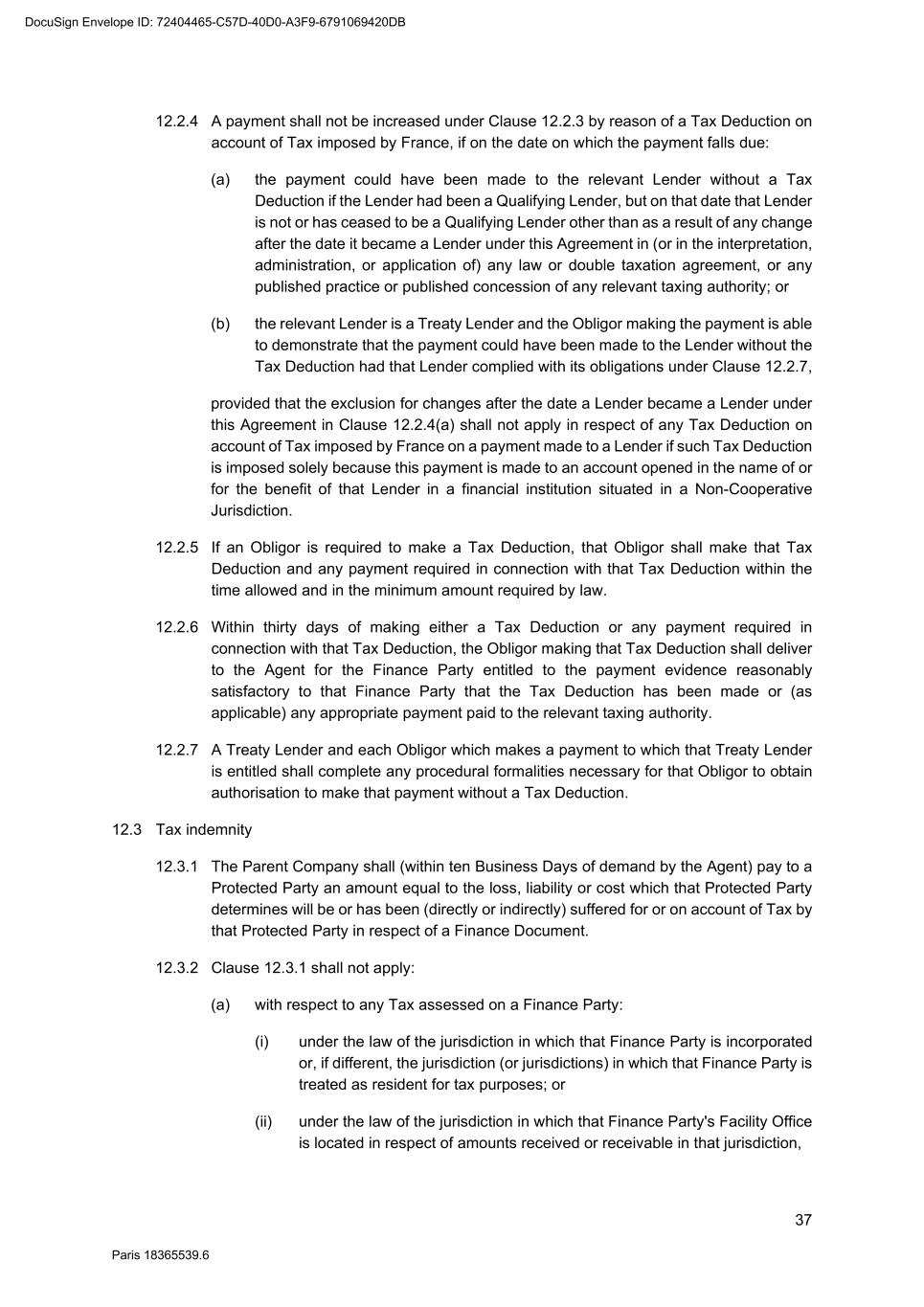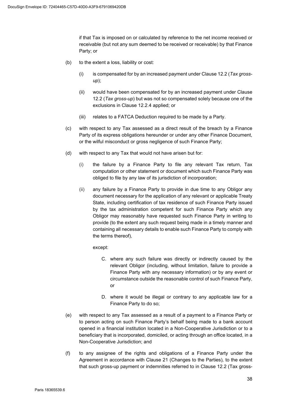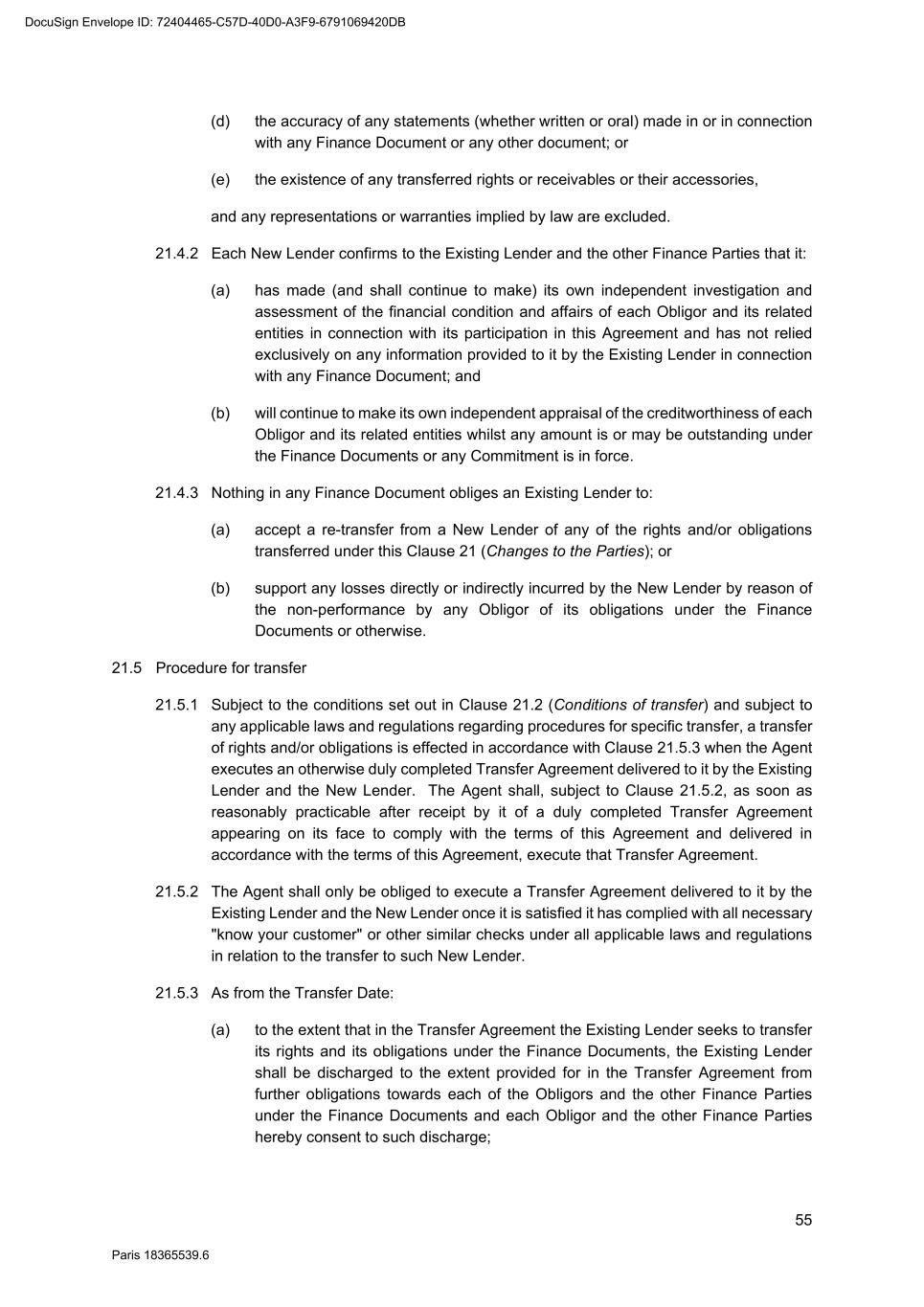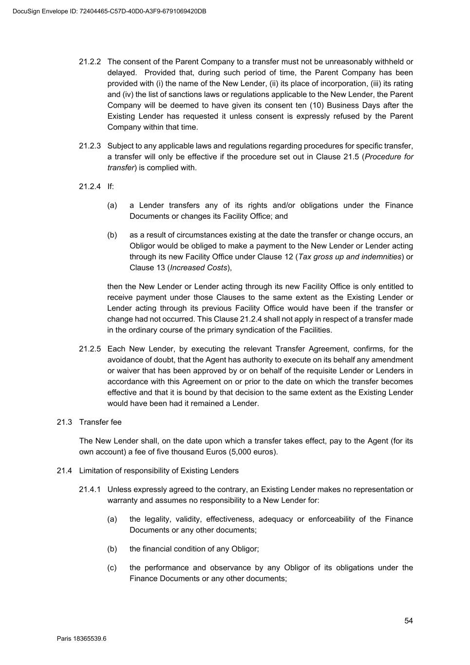 87 Paris 18365539.6 4. The New Lender expressly acknowledges the limitations on the Existing Lender's obligations set out in Clause 21.4 (Limitation of responsibility of Existing Lenders) of the Facility Agreement. 5. The New Lender confirms, for the benefit of the Agent and without liability to any Obligor, that it is: (a) a Qualifying Lender other than a Treaty Lender; (b) a Treaty Lender; (c) not a Qualifying Lender,4 and that it is [not]5 incorporated or acting through a Facility Office situated in a Non-Cooperative Jurisdiction. 6. The New Lender confirms to the other Finance Parties represented by the Agent that it has become entitled to the same rights and that it will assume the same obligations to those Parties as it would have been under if it was an Original Lender. 7. This Transfer Agreement is governed by French law. The Tribunal de Commerce de Paris shall have jurisdiction in relation to any dispute concerning it. 8. This Transfer Agreement has been entered into on the date stated at the beginning of this Transfer Agreement. 4 Delete as applicable. Each New Lender is required to confirm which of these three categories it falls within. 5 Delete as applicable. Each New Lender is required to confirm whether it falls within one of these categories or not. DocuSign Envelope ID: 72404465-C57D-40D0-A3F9-6791069420DB