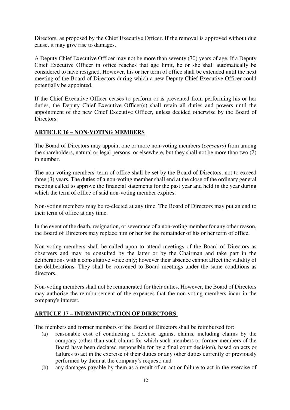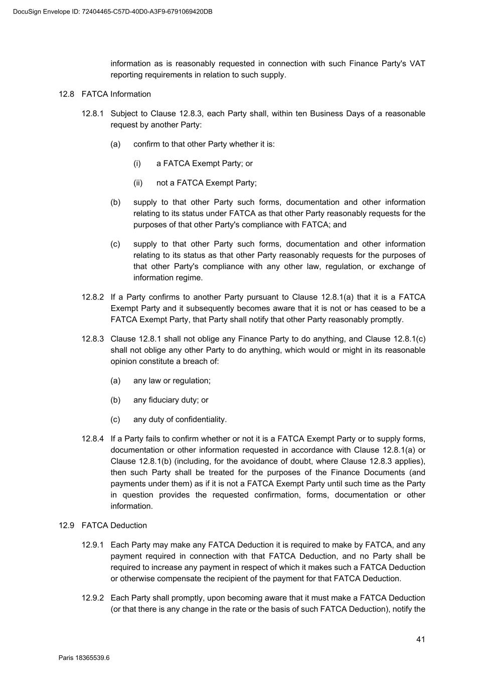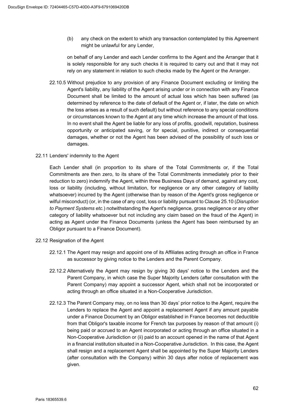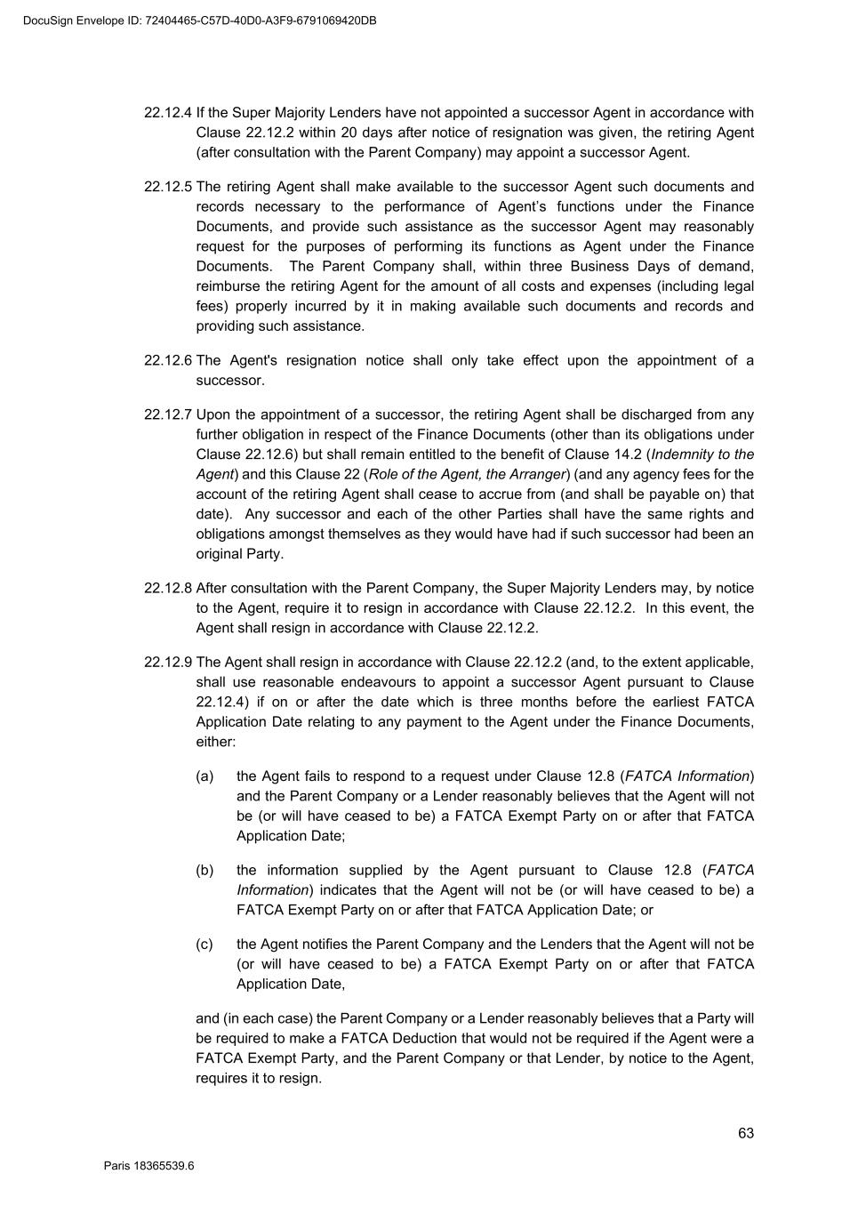 63 Paris 18365539.6 22.12.4 If the Super Majority Lenders have not appointed a successor Agent in accordance with Clause 22.12.2 within 20 days after notice of resignation was given, the retiring Agent (after consultation with the Parent Company) may appoint a successor Agent. 22.12.5 The retiring Agent shall make available to the successor Agent such documents and records necessary to the performance of Agent’s functions under the Finance Documents, and provide such assistance as the successor Agent may reasonably request for the purposes of performing its functions as Agent under the Finance Documents. The Parent Company shall, within three Business Days of demand, reimburse the retiring Agent for the amount of all costs and expenses (including legal fees) properly incurred by it in making available such documents and records and providing such assistance. 22.12.6 The Agent's resignation notice shall only take effect upon the appointment of a successor. 22.12.7 Upon the appointment of a successor, the retiring Agent shall be discharged from any further obligation in respect of the Finance Documents (other than its obligations under Clause 22.12.6) but shall remain entitled to the benefit of Clause 14.2 (Indemnity to the Agent) and this Clause 22 (Role of the Agent, the Arranger) (and any agency fees for the account of the retiring Agent shall cease to accrue from (and shall be payable on) that date). Any successor and each of the other Parties shall have the same rights and obligations amongst themselves as they would have had if such successor had been an original Party. 22.12.8 After consultation with the Parent Company, the Super Majority Lenders may, by notice to the Agent, require it to resign in accordance with Clause 22.12.2. In this event, the Agent shall resign in accordance with Clause 22.12.2. 22.12.9 The Agent shall resign in accordance with Clause 22.12.2 (and, to the extent applicable, shall use reasonable endeavours to appoint a successor Agent pursuant to Clause 22.12.4) if on or after the date which is three months before the earliest FATCA Application Date relating to any payment to the Agent under the Finance Documents, either: (a) the Agent fails to respond to a request under Clause 12.8 (FATCA Information) and the Parent Company or a Lender reasonably believes that the Agent will not be (or will have ceased to be) a FATCA Exempt Party on or after that FATCA Application Date; (b) the information supplied by the Agent pursuant to Clause 12.8 (FATCA Information) indicates that the Agent will not be (or will have ceased to be) a FATCA Exempt Party on or after that FATCA Application Date; or (c) the Agent notifies the Parent Company and the Lenders that the Agent will not be (or will have ceased to be) a FATCA Exempt Party on or after that FATCA Application Date, and (in each case) the Parent Company or a Lender reasonably believes that a Party will be required to make a FATCA Deduction that would not be required if the Agent were a FATCA Exempt Party, and the Parent Company or that Lender, by notice to the Agent, requires it to resign. DocuSign Envelope ID: 72404465-C57D-40D0-A3F9-6791069420DB