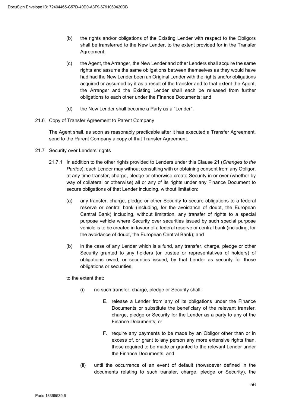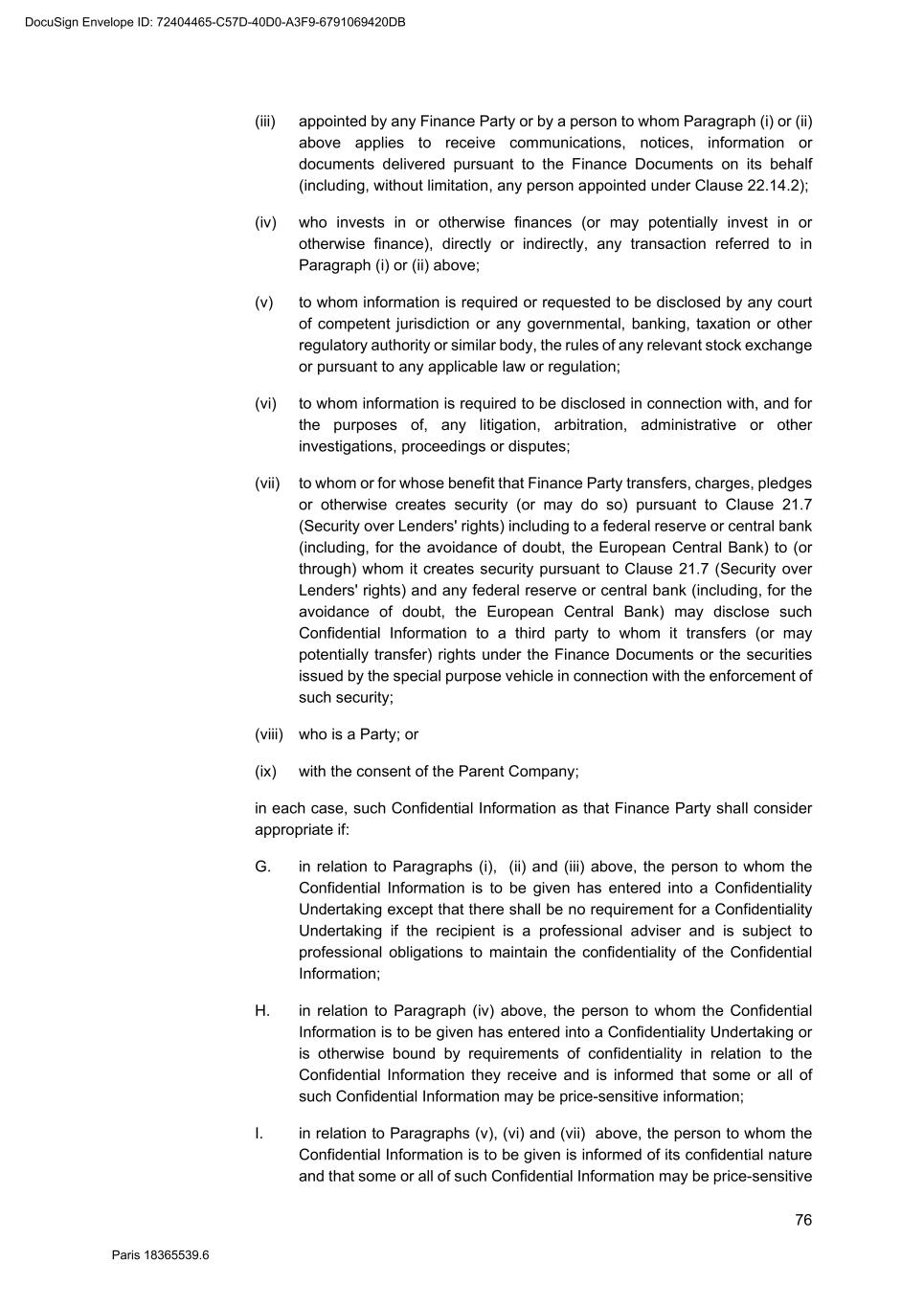 76 Paris 18365539.6 (iii) appointed by any Finance Party or by a person to whom Paragraph (i) or (ii) above applies to receive communications, notices, information or documents delivered pursuant to the Finance Documents on its behalf (including, without limitation, any person appointed under Clause 22.14.2); (iv) who invests in or otherwise finances (or may potentially invest in or otherwise finance), directly or indirectly, any transaction referred to in Paragraph (i) or (ii) above; (v) to whom information is required or requested to be disclosed by any court of competent jurisdiction or any governmental, banking, taxation or other regulatory authority or similar body, the rules of any relevant stock exchange or pursuant to any applicable law or regulation; (vi) to whom information is required to be disclosed in connection with, and for the purposes of, any litigation, arbitration, administrative or other investigations, proceedings or disputes; (vii) to whom or for whose benefit that Finance Party transfers, charges, pledges or otherwise creates security (or may do so) pursuant to Clause 21.7 (Security over Lenders' rights) including to a federal reserve or central bank (including, for the avoidance of doubt, the European Central Bank) to (or through) whom it creates security pursuant to Clause 21.7 (Security over Lenders' rights) and any federal reserve or central bank (including, for the avoidance of doubt, the European Central Bank) may disclose such Confidential Information to a third party to whom it transfers (or may potentially transfer) rights under the Finance Documents or the securities issued by the special purpose vehicle in connection with the enforcement of such security; (viii) who is a Party; or (ix) with the consent of the Parent Company; in each case, such Confidential Information as that Finance Party shall consider appropriate if: G. in relation to Paragraphs (i), (ii) and (iii) above, the person to whom the Confidential Information is to be given has entered into a Confidentiality Undertaking except that there shall be no requirement for a Confidentiality Undertaking if the recipient is a professional adviser and is subject to professional obligations to maintain the confidentiality of the Confidential Information; H. in relation to Paragraph (iv) above, the person to whom the Confidential Information is to be given has entered into a Confidentiality Undertaking or is otherwise bound by requirements of confidentiality in relation to the Confidential Information they receive and is informed that some or all of such Confidential Information may be price-sensitive information; I. in relation to Paragraphs (v), (vi) and (vii) above, the person to whom the Confidential Information is to be given is informed of its confidential nature and that some or all of such Confidential Information may be price-sensitive DocuSign Envelope ID: 72404465-C57D-40D0-A3F9-6791069420DB