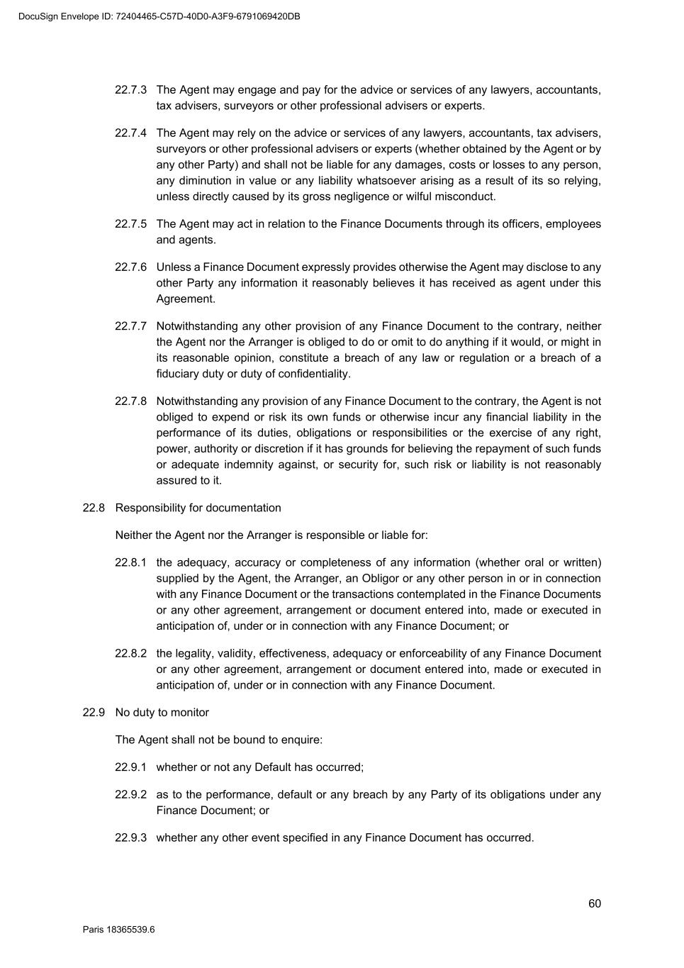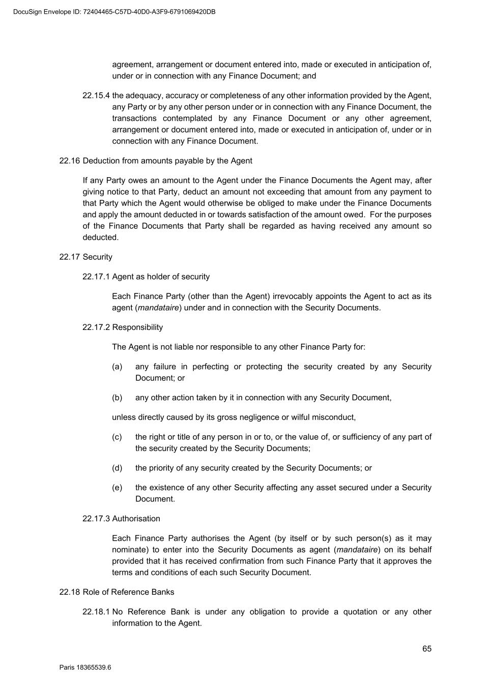 65 Paris 18365539.6 agreement, arrangement or document entered into, made or executed in anticipation of, under or in connection with any Finance Document; and 22.15.4 the adequacy, accuracy or completeness of any other information provided by the Agent, any Party or by any other person under or in connection with any Finance Document, the transactions contemplated by any Finance Document or any other agreement, arrangement or document entered into, made or executed in anticipation of, under or in connection with any Finance Document. 22.16 Deduction from amounts payable by the Agent If any Party owes an amount to the Agent under the Finance Documents the Agent may, after giving notice to that Party, deduct an amount not exceeding that amount from any payment to that Party which the Agent would otherwise be obliged to make under the Finance Documents and apply the amount deducted in or towards satisfaction of the amount owed. For the purposes of the Finance Documents that Party shall be regarded as having received any amount so deducted. 22.17 Security 22.17.1 Agent as holder of security Each Finance Party (other than the Agent) irrevocably appoints the Agent to act as its agent (mandataire) under and in connection with the Security Documents. 22.17.2 Responsibility The Agent is not liable nor responsible to any other Finance Party for: (a) any failure in perfecting or protecting the security created by any Security Document; or (b) any other action taken by it in connection with any Security Document, unless directly caused by its gross negligence or wilful misconduct, (c) the right or title of any person in or to, or the value of, or sufficiency of any part of the security created by the Security Documents; (d) the priority of any security created by the Security Documents; or (e) the existence of any other Security affecting any asset secured under a Security Document. 22.17.3 Authorisation Each Finance Party authorises the Agent (by itself or by such person(s) as it may nominate) to enter into the Security Documents as agent (mandataire) on its behalf provided that it has received confirmation from such Finance Party that it approves the terms and conditions of each such Security Document. 22.18 Role of Reference Banks 22.18.1 No Reference Bank is under any obligation to provide a quotation or any other information to the Agent. DocuSign Envelope ID: 72404465-C57D-40D0-A3F9-6791069420DB