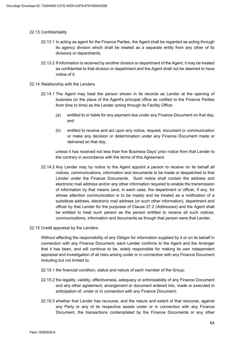 64 Paris 18365539.6 22.13 Confidentiality 22.13.1 In acting as agent for the Finance Parties, the Agent shall be regarded as acting through its agency division which shall be treated as a separate entity from any other of its divisions or departments. 22.13.2 If information is received by another division or department of the Agent, it may be treated as confidential to that division or department and the Agent shall not be deemed to have notice of it. 22.14 Relationship with the Lenders 22.14.1 The Agent may treat the person shown in its records as Lender at the opening of business (in the place of the Agent's principal office as notified to the Finance Parties from time to time) as the Lender acting through its Facility Office: (a) entitled to or liable for any payment due under any Finance Document on that day; and (b) entitled to receive and act upon any notice, request, document or communication or make any decision or determination under any Finance Document made or delivered on that day, unless it has received not less than five Business Days' prior notice from that Lender to the contrary in accordance with the terms of this Agreement. 22.14.2 Any Lender may by notice to the Agent appoint a person to receive on its behalf all notices, communications, information and documents to be made or despatched to that Lender under the Finance Documents. Such notice shall contain the address and electronic mail address and/or any other information required to enable the transmission of information by that means (and, in each case, the department or officer, if any, for whose attention communication is to be made) and be treated as a notification of a substitute address, electronic mail address (or such other information), department and officer by that Lender for the purposes of Clause 27.2 (Addresses) and the Agent shall be entitled to treat such person as the person entitled to receive all such notices, communications, information and documents as though that person were that Lender. 22.15 Credit appraisal by the Lenders Without affecting the responsibility of any Obligor for information supplied by it or on its behalf in connection with any Finance Document, each Lender confirms to the Agent and the Arranger that it has been, and will continue to be, solely responsible for making its own independent appraisal and investigation of all risks arising under or in connection with any Finance Document including but not limited to: 22.15.1 the financial condition, status and nature of each member of the Group; 22.15.2 the legality, validity, effectiveness, adequacy or enforceability of any Finance Document and any other agreement, arrangement or document entered into, made or executed in anticipation of, under or in connection with any Finance Document; 22.15.3 whether that Lender has recourse, and the nature and extent of that recourse, against any Party or any of its respective assets under or in connection with any Finance Document, the transactions contemplated by the Finance Documents or any other DocuSign Envelope ID: 72404465-C57D-40D0-A3F9-6791069420DB