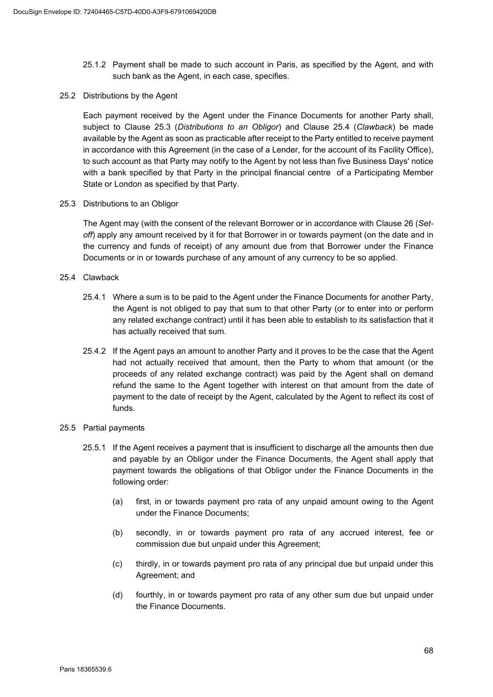 68 Paris 18365539.6 25.1.2 Payment shall be made to such account in Paris, as specified by the Agent, and with such bank as the Agent, in each case, specifies. 25.2 Distributions by the Agent Each payment received by the Agent under the Finance Documents for another Party shall, subject to Clause 25.3 (Distributions to an Obligor) and Clause 25.4 (Clawback) be made available by the Agent as soon as practicable after receipt to the Party entitled to receive payment in accordance with this Agreement (in the case of a Lender, for the account of its Facility Office), to such account as that Party may notify to the Agent by not less than five Business Days' notice with a bank specified by that Party in the principal financial centre of a Participating Member State or London as specified by that Party. 25.3 Distributions to an Obligor The Agent may (with the consent of the relevant Borrower or in accordance with Clause 26 (Set- off) apply any amount received by it for that Borrower in or towards payment (on the date and in the currency and funds of receipt) of any amount due from that Borrower under the Finance Documents or in or towards purchase of any amount of any currency to be so applied. 25.4 Clawback 25.4.1 Where a sum is to be paid to the Agent under the Finance Documents for another Party, the Agent is not obliged to pay that sum to that other Party (or to enter into or perform any related exchange contract) until it has been able to establish to its satisfaction that it has actually received that sum. 25.4.2 If the Agent pays an amount to another Party and it proves to be the case that the Agent had not actually received that amount, then the Party to whom that amount (or the proceeds of any related exchange contract) was paid by the Agent shall on demand refund the same to the Agent together with interest on that amount from the date of payment to the date of receipt by the Agent, calculated by the Agent to reflect its cost of funds. 25.5 Partial payments 25.5.1 If the Agent receives a payment that is insufficient to discharge all the amounts then due and payable by an Obligor under the Finance Documents, the Agent shall apply that payment towards the obligations of that Obligor under the Finance Documents in the following order: (a) first, in or towards payment pro rata of any unpaid amount owing to the Agent under the Finance Documents; (b) secondly, in or towards payment pro rata of any accrued interest, fee or commission due but unpaid under this Agreement; (c) thirdly, in or towards payment pro rata of any principal due but unpaid under this Agreement; and (d) fourthly, in or towards payment pro rata of any other sum due but unpaid under the Finance Documents. DocuSign Envelope ID: 72404465-C57D-40D0-A3F9-6791069420DB