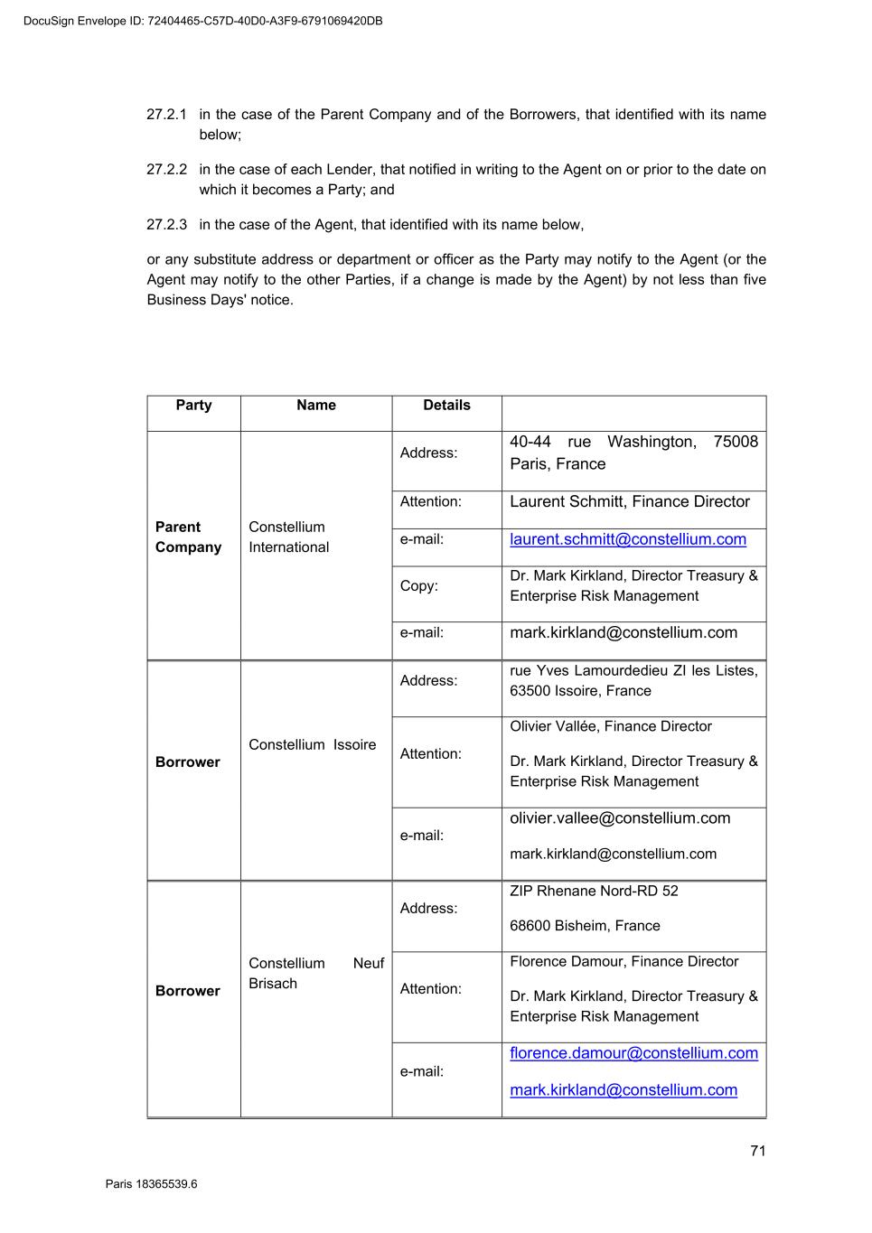 71 Paris 18365539.6 27.2.1 in the case of the Parent Company and of the Borrowers, that identified with its name below; 27.2.2 in the case of each Lender, that notified in writing to the Agent on or prior to the date on which it becomes a Party; and 27.2.3 in the case of the Agent, that identified with its name below, or any substitute address or department or officer as the Party may notify to the Agent (or the Agent may notify to the other Parties, if a change is made by the Agent) by not less than five Business Days' notice. Party Name Details Parent Company Constellium International Address: 40-44 rue Washington, 75008 Paris, France Attention: Laurent Schmitt, Finance Director e-mail: laurent.schmitt@constellium.com Copy: Dr. Mark Kirkland, Director Treasury & Enterprise Risk Management e-mail: mark.kirkland@constellium.com Borrower Constellium Issoire Address: rue Yves Lamourdedieu ZI les Listes, 63500 Issoire, France Attention: Olivier Vallée, Finance Director Dr. Mark Kirkland, Director Treasury & Enterprise Risk Management e-mail: olivier.vallee@constellium.com mark.kirkland@constellium.com Borrower Constellium Neuf Brisach Address: ZIP Rhenane Nord-RD 52 68600 Bisheim, France Attention: Florence Damour, Finance Director Dr. Mark Kirkland, Director Treasury & Enterprise Risk Management e-mail: florence.damour@constellium.com mark.kirkland@constellium.com DocuSign Envelope ID: 72404465-C57D-40D0-A3F9-6791069420DB