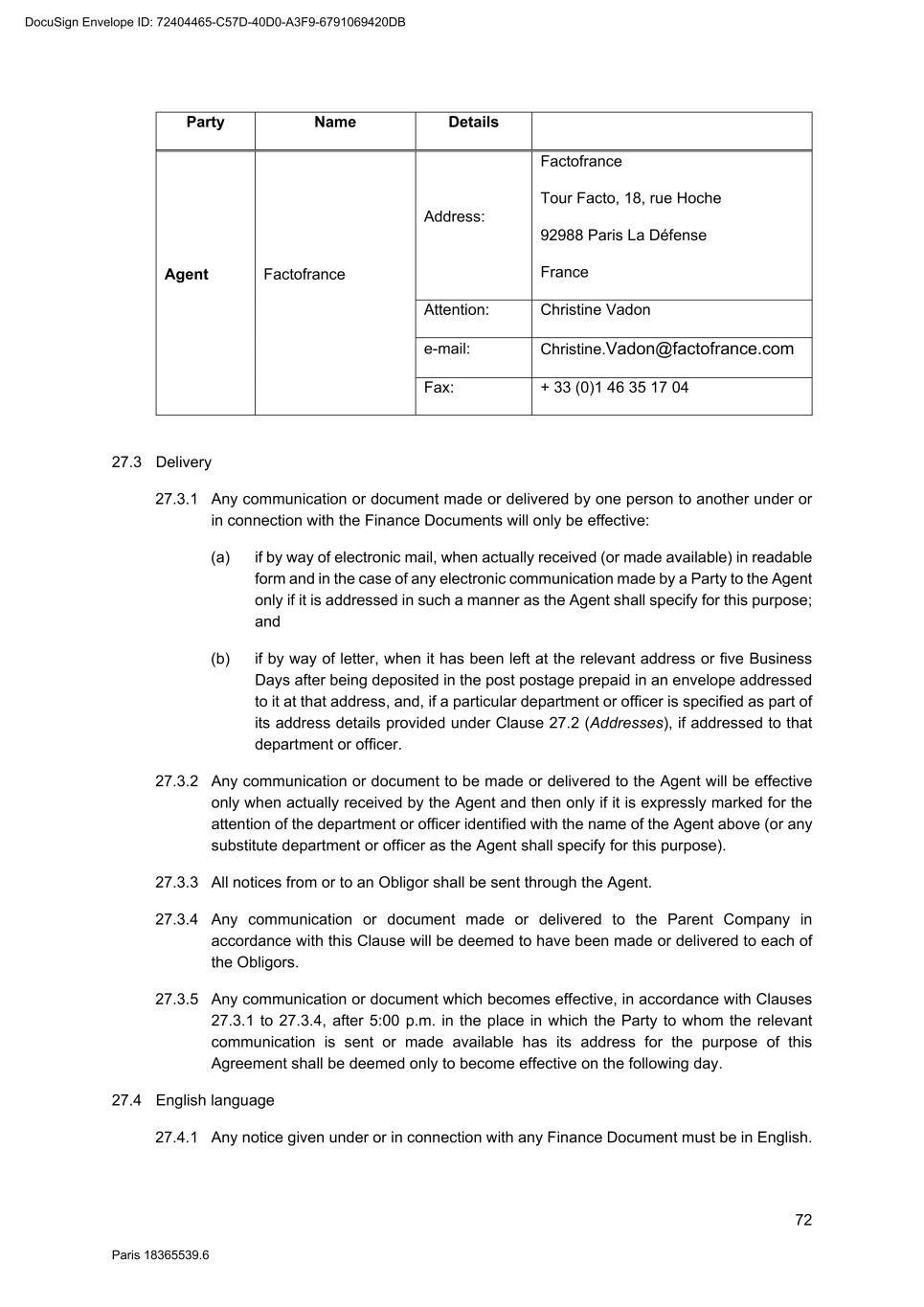 72 Paris 18365539.6 Party Name Details Agent Factofrance Address: Factofrance Tour Facto, 18, rue Hoche 92988 Paris La Défense France Attention: Christine Vadon e-mail: Christine.Vadon@factofrance.com Fax: + 33 (0)1 46 35 17 04 27.3 Delivery 27.3.1 Any communication or document made or delivered by one person to another under or in connection with the Finance Documents will only be effective: (a) if by way of electronic mail, when actually received (or made available) in readable form and in the case of any electronic communication made by a Party to the Agent only if it is addressed in such a manner as the Agent shall specify for this purpose; and (b) if by way of letter, when it has been left at the relevant address or five Business Days after being deposited in the post postage prepaid in an envelope addressed to it at that address, and, if a particular department or officer is specified as part of its address details provided under Clause 27.2 (Addresses), if addressed to that department or officer. 27.3.2 Any communication or document to be made or delivered to the Agent will be effective only when actually received by the Agent and then only if it is expressly marked for the attention of the department or officer identified with the name of the Agent above (or any substitute department or officer as the Agent shall specify for this purpose). 27.3.3 All notices from or to an Obligor shall be sent through the Agent. 27.3.4 Any communication or document made or delivered to the Parent Company in accordance with this Clause will be deemed to have been made or delivered to each of the Obligors. 27.3.5 Any communication or document which becomes effective, in accordance with Clauses 27.3.1 to 27.3.4, after 5:00 p.m. in the place in which the Party to whom the relevant communication is sent or made available has its address for the purpose of this Agreement shall be deemed only to become effective on the following day. 27.4 English language 27.4.1 Any notice given under or in connection with any Finance Document must be in English. DocuSign Envelope ID: 72404465-C57D-40D0-A3F9-6791069420DB
