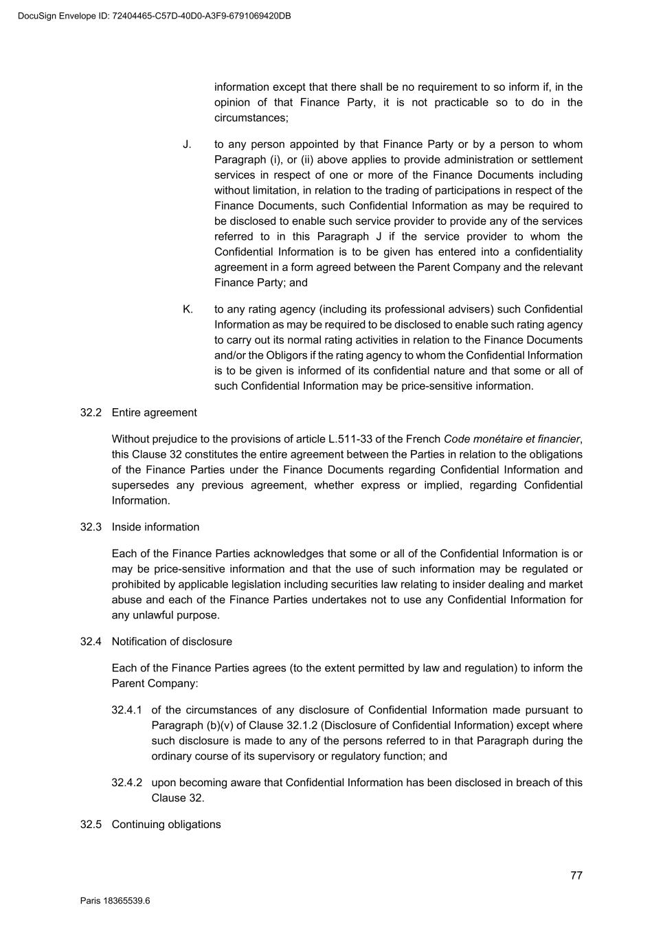 77 Paris 18365539.6 information except that there shall be no requirement to so inform if, in the opinion of that Finance Party, it is not practicable so to do in the circumstances; J. to any person appointed by that Finance Party or by a person to whom Paragraph (i), or (ii) above applies to provide administration or settlement services in respect of one or more of the Finance Documents including without limitation, in relation to the trading of participations in respect of the Finance Documents, such Confidential Information as may be required to be disclosed to enable such service provider to provide any of the services referred to in this Paragraph J if the service provider to whom the Confidential Information is to be given has entered into a confidentiality agreement in a form agreed between the Parent Company and the relevant Finance Party; and K. to any rating agency (including its professional advisers) such Confidential Information as may be required to be disclosed to enable such rating agency to carry out its normal rating activities in relation to the Finance Documents and/or the Obligors if the rating agency to whom the Confidential Information is to be given is informed of its confidential nature and that some or all of such Confidential Information may be price-sensitive information. 32.2 Entire agreement Without prejudice to the provisions of article L.511-33 of the French Code monétaire et financier, this Clause 32 constitutes the entire agreement between the Parties in relation to the obligations of the Finance Parties under the Finance Documents regarding Confidential Information and supersedes any previous agreement, whether express or implied, regarding Confidential Information. 32.3 Inside information Each of the Finance Parties acknowledges that some or all of the Confidential Information is or may be price-sensitive information and that the use of such information may be regulated or prohibited by applicable legislation including securities law relating to insider dealing and market abuse and each of the Finance Parties undertakes not to use any Confidential Information for any unlawful purpose. 32.4 Notification of disclosure Each of the Finance Parties agrees (to the extent permitted by law and regulation) to inform the Parent Company: 32.4.1 of the circumstances of any disclosure of Confidential Information made pursuant to Paragraph (b)(v) of Clause 32.1.2 (Disclosure of Confidential Information) except where such disclosure is made to any of the persons referred to in that Paragraph during the ordinary course of its supervisory or regulatory function; and 32.4.2 upon becoming aware that Confidential Information has been disclosed in breach of this Clause 32. 32.5 Continuing obligations DocuSign Envelope ID: 72404465-C57D-40D0-A3F9-6791069420DB