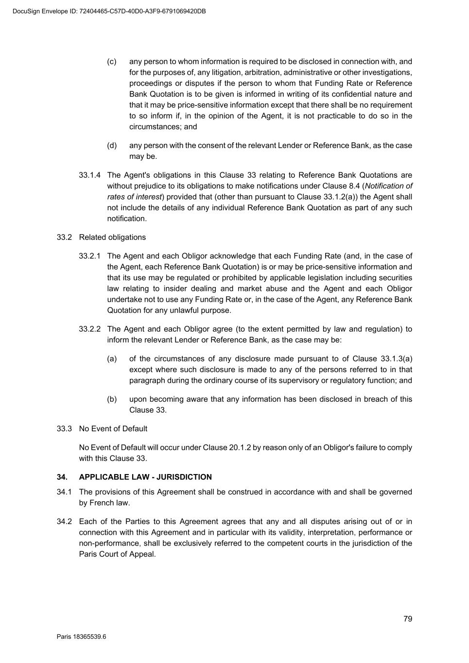 79 Paris 18365539.6 (c) any person to whom information is required to be disclosed in connection with, and for the purposes of, any litigation, arbitration, administrative or other investigations, proceedings or disputes if the person to whom that Funding Rate or Reference Bank Quotation is to be given is informed in writing of its confidential nature and that it may be price-sensitive information except that there shall be no requirement to so inform if, in the opinion of the Agent, it is not practicable to do so in the circumstances; and (d) any person with the consent of the relevant Lender or Reference Bank, as the case may be. 33.1.4 The Agent's obligations in this Clause 33 relating to Reference Bank Quotations are without prejudice to its obligations to make notifications under Clause 8.4 (Notification of rates of interest) provided that (other than pursuant to Clause 33.1.2(a)) the Agent shall not include the details of any individual Reference Bank Quotation as part of any such notification. 33.2 Related obligations 33.2.1 The Agent and each Obligor acknowledge that each Funding Rate (and, in the case of the Agent, each Reference Bank Quotation) is or may be price-sensitive information and that its use may be regulated or prohibited by applicable legislation including securities law relating to insider dealing and market abuse and the Agent and each Obligor undertake not to use any Funding Rate or, in the case of the Agent, any Reference Bank Quotation for any unlawful purpose. 33.2.2 The Agent and each Obligor agree (to the extent permitted by law and regulation) to inform the relevant Lender or Reference Bank, as the case may be: (a) of the circumstances of any disclosure made pursuant to of Clause 33.1.3(a) except where such disclosure is made to any of the persons referred to in that paragraph during the ordinary course of its supervisory or regulatory function; and (b) upon becoming aware that any information has been disclosed in breach of this Clause 33. 33.3 No Event of Default No Event of Default will occur under Clause 20.1.2 by reason only of an Obligor's failure to comply with this Clause 33. 34. APPLICABLE LAW - JURISDICTION 34.1 The provisions of this Agreement shall be construed in accordance with and shall be governed by French law. 34.2 Each of the Parties to this Agreement agrees that any and all disputes arising out of or in connection with this Agreement and in particular with its validity, interpretation, performance or non-performance, shall be exclusively referred to the competent courts in the jurisdiction of the Paris Court of Appeal. DocuSign Envelope ID: 72404465-C57D-40D0-A3F9-6791069420DB