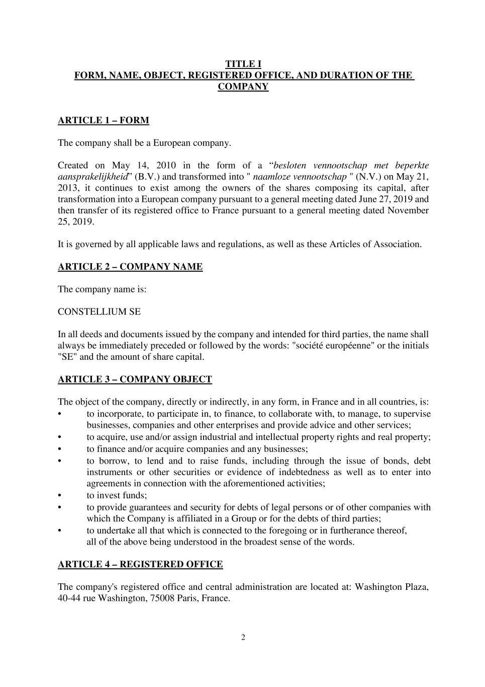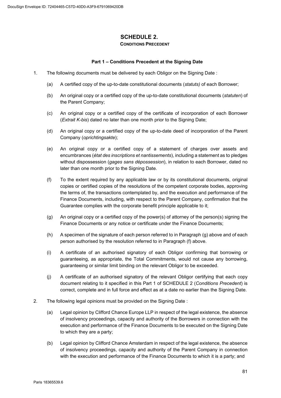 81 Paris 18365539.6 SCHEDULE 2. CONDITIONS PRECEDENT Part 1 – Conditions Precedent at the Signing Date 1. The following documents must be delivered by each Obligor on the Signing Date : (a) A certified copy of the up-to-date constitutional documents (statuts) of each Borrower; (b) An original copy or a certified copy of the up-to-date constitutional documents (statuten) of the Parent Company; (c) An original copy or a certified copy of the certificate of incorporation of each Borrower (Extrait K-bis) dated no later than one month prior to the Signing Date; (d) An original copy or a certified copy of the up-to-date deed of incorporation of the Parent Company (oprichtingsakte); (e) An original copy or a certified copy of a statement of charges over assets and encumbrances (état des inscriptions et nantissements), including a statement as to pledges without dispossession (gages sans dépossession), in relation to each Borrower, dated no later than one month prior to the Signing Date. (f) To the extent required by any applicable law or by its constitutional documents, original copies or certified copies of the resolutions of the competent corporate bodies, approving the terms of, the transactions contemplated by, and the execution and performance of the Finance Documents, including, with respect to the Parent Company, confirmation that the Guarantee complies with the corporate benefit principle applicable to it; (g) An original copy or a certified copy of the power(s) of attorney of the person(s) signing the Finance Documents or any notice or certificate under the Finance Documents; (h) A specimen of the signature of each person referred to in Paragraph (g) above and of each person authorised by the resolution referred to in Paragraph (f) above. (i) A certificate of an authorised signatory of each Obligor confirming that borrowing or guaranteeing, as appropriate, the Total Commitments, would not cause any borrowing, guaranteeing or similar limit binding on the relevant Obligor to be exceeded. (j) A certificate of an authorised signatory of the relevant Obligor certifying that each copy document relating to it specified in this Part 1 of SCHEDULE 2 (Conditions Precedent) is correct, complete and in full force and effect as at a date no earlier than the Signing Date. 2. The following legal opinions must be provided on the Signing Date : (a) Legal opinion by Clifford Chance Europe LLP in respect of the legal existence, the absence of insolvency proceedings, capacity and authority of the Borrowers in connection with the execution and performance of the Finance Documents to be executed on the Signing Date to which they are a party; (b) Legal opinion by Clifford Chance Amsterdam in respect of the legal existence, the absence of insolvency proceedings, capacity and authority of the Parent Company in connection with the execution and performance of the Finance Documents to which it is a party; and DocuSign Envelope ID: 72404465-C57D-40D0-A3F9-6791069420DB