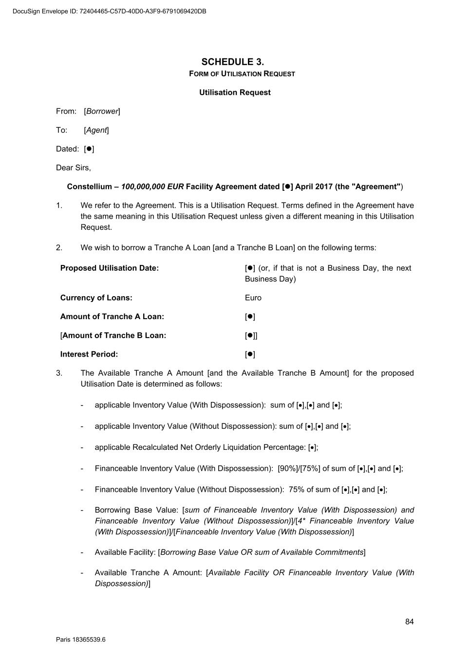 84 Paris 18365539.6 SCHEDULE 3. FORM OF UTILISATION REQUEST Utilisation Request From: [Borrower] To: [Agent] Dated: [] Dear Sirs, Constellium – 100,000,000 EUR Facility Agreement dated [] April 2017 (the "Agreement") 1. We refer to the Agreement. This is a Utilisation Request. Terms defined in the Agreement have the same meaning in this Utilisation Request unless given a different meaning in this Utilisation Request. 2. We wish to borrow a Tranche A Loan [and a Tranche B Loan] on the following terms: Proposed Utilisation Date: [] (or, if that is not a Business Day, the next Business Day) Currency of Loans: Euro Amount of Tranche A Loan: [] [Amount of Tranche B Loan: []] Interest Period: [] 3. The Available Tranche A Amount [and the Available Tranche B Amount] for the proposed Utilisation Date is determined as follows: - applicable Inventory Value (With Dispossession): sum of [],[] and []; - applicable Inventory Value (Without Dispossession): sum of [],[] and []; - applicable Recalculated Net Orderly Liquidation Percentage: []; - Financeable Inventory Value (With Dispossession): [90%]/[75%] of sum of [],[] and []; - Financeable Inventory Value (Without Dispossession): 75% of sum of [],[] and []; - Borrowing Base Value: [sum of Financeable Inventory Value (With Dispossession) and Financeable Inventory Value (Without Dispossession)]/[4* Financeable Inventory Value (With Dispossession)]/[Financeable Inventory Value (With Dispossession)] - Available Facility: [Borrowing Base Value OR sum of Available Commitments] - Available Tranche A Amount: [Available Facility OR Financeable Inventory Value (With Dispossession)] DocuSign Envelope ID: 72404465-C57D-40D0-A3F9-6791069420DB