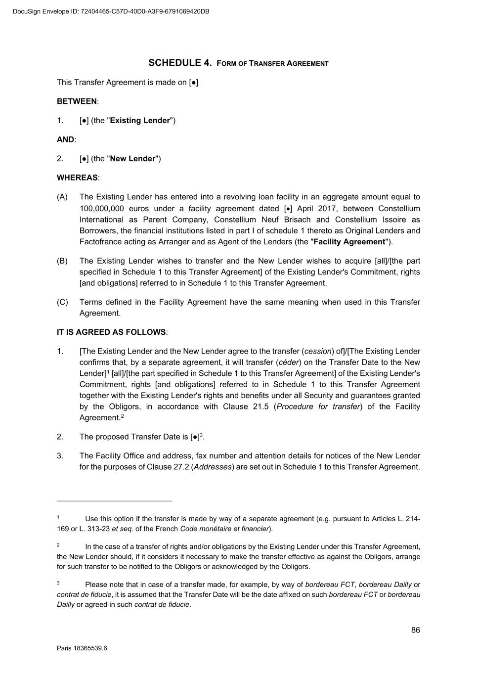 86 Paris 18365539.6 SCHEDULE 4. FORM OF TRANSFER AGREEMENT This Transfer Agreement is made on [●] BETWEEN: 1. [●] (the "Existing Lender") AND: 2. [●] (the "New Lender") WHEREAS: (A) The Existing Lender has entered into a revolving loan facility in an aggregate amount equal to 100,000,000 euros under a facility agreement dated [] April 2017, between Constellium International as Parent Company, Constellium Neuf Brisach and Constellium Issoire as Borrowers, the financial institutions listed in part I of schedule 1 thereto as Original Lenders and Factofrance acting as Arranger and as Agent of the Lenders (the "Facility Agreement"). (B) The Existing Lender wishes to transfer and the New Lender wishes to acquire [all]/[the part specified in Schedule 1 to this Transfer Agreement] of the Existing Lender's Commitment, rights [and obligations] referred to in Schedule 1 to this Transfer Agreement. (C) Terms defined in the Facility Agreement have the same meaning when used in this Transfer Agreement. IT IS AGREED AS FOLLOWS: 1. [The Existing Lender and the New Lender agree to the transfer (cession) of]/[The Existing Lender confirms that, by a separate agreement, it will transfer (céder) on the Transfer Date to the New Lender]1 [all]/[the part specified in Schedule 1 to this Transfer Agreement] of the Existing Lender's Commitment, rights [and obligations] referred to in Schedule 1 to this Transfer Agreement together with the Existing Lender's rights and benefits under all Security and guarantees granted by the Obligors, in accordance with Clause 21.5 (Procedure for transfer) of the Facility Agreement.2 2. The proposed Transfer Date is [●]3. 3. The Facility Office and address, fax number and attention details for notices of the New Lender for the purposes of Clause 27.2 (Addresses) are set out in Schedule 1 to this Transfer Agreement. 1 Use this option if the transfer is made by way of a separate agreement (e.g. pursuant to Articles L. 214- 169 or L. 313-23 et seq. of the French Code monétaire et financier). 2 In the case of a transfer of rights and/or obligations by the Existing Lender under this Transfer Agreement, the New Lender should, if it considers it necessary to make the transfer effective as against the Obligors, arrange for such transfer to be notified to the Obligors or acknowledged by the Obligors. 3 Please note that in case of a transfer made, for example, by way of bordereau FCT, bordereau Dailly or contrat de fiducie, it is assumed that the Transfer Date will be the date affixed on such bordereau FCT or bordereau Dailly or agreed in such contrat de fiducie. DocuSign Envelope ID: 72404465-C57D-40D0-A3F9-6791069420DB