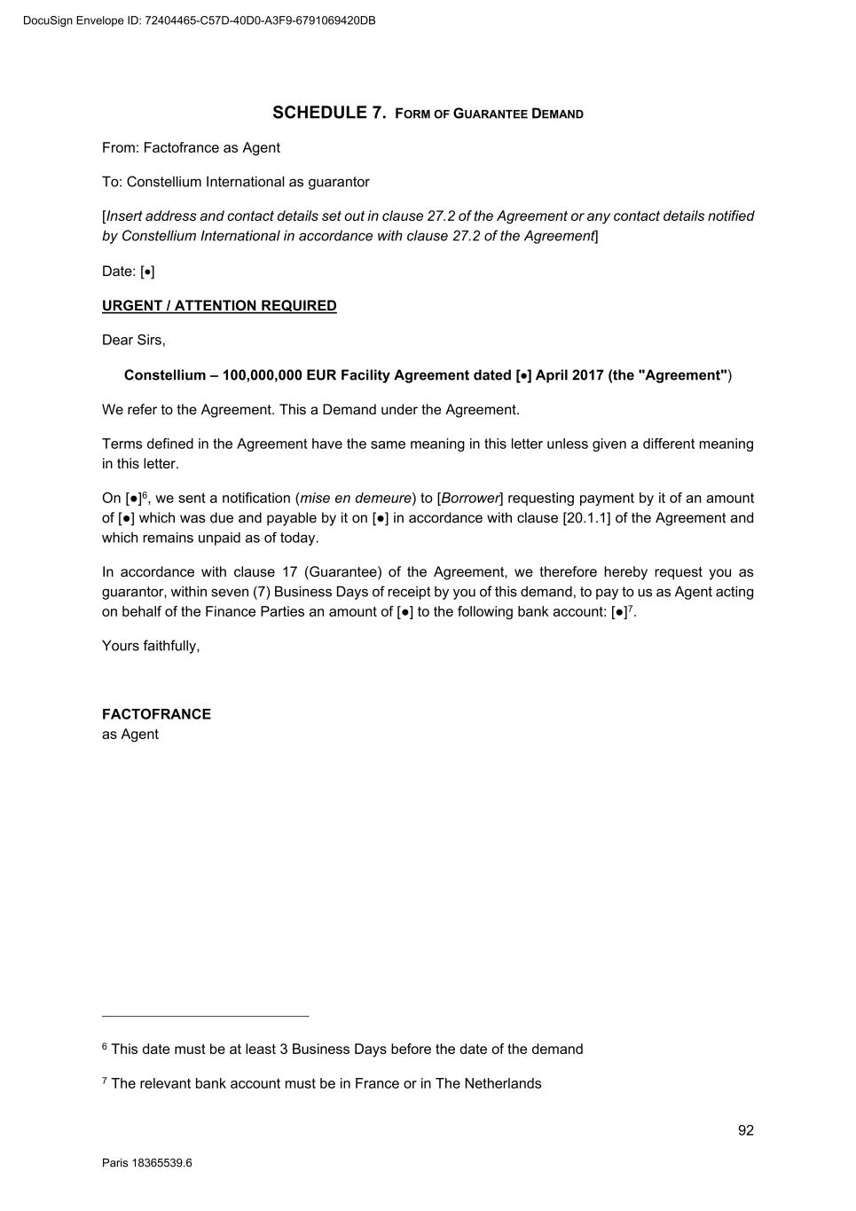 92 Paris 18365539.6 SCHEDULE 7. FORM OF GUARANTEE DEMAND From: Factofrance as Agent To: Constellium International as guarantor [Insert address and contact details set out in clause 27.2 of the Agreement or any contact details notified by Constellium International in accordance with clause 27.2 of the Agreement] Date: [] URGENT / ATTENTION REQUIRED Dear Sirs, Constellium – 100,000,000 EUR Facility Agreement dated [] April 2017 (the "Agreement") We refer to the Agreement. This a Demand under the Agreement. Terms defined in the Agreement have the same meaning in this letter unless given a different meaning in this letter. On [●]6, we sent a notification (mise en demeure) to [Borrower] requesting payment by it of an amount of [●] which was due and payable by it on [●] in accordance with clause [20.1.1] of the Agreement and which remains unpaid as of today. In accordance with clause 17 (Guarantee) of the Agreement, we therefore hereby request you as guarantor, within seven (7) Business Days of receipt by you of this demand, to pay to us as Agent acting on behalf of the Finance Parties an amount of [●] to the following bank account: [●]7. Yours faithfully, FACTOFRANCE as Agent 6 This date must be at least 3 Business Days before the date of the demand 7 The relevant bank account must be in France or in The Netherlands DocuSign Envelope ID: 72404465-C57D-40D0-A3F9-6791069420DB