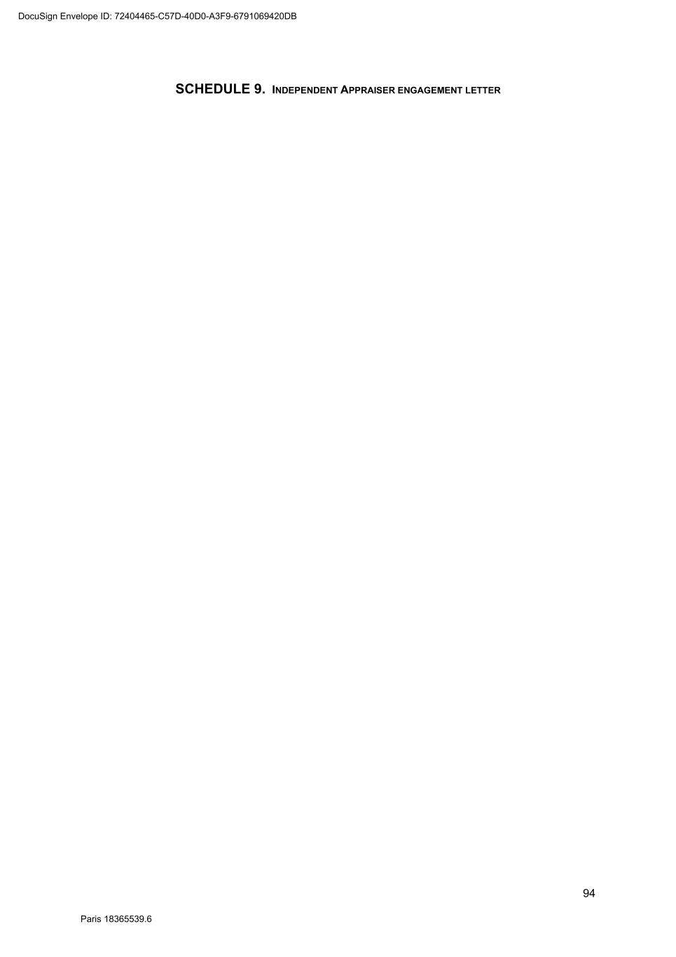 94 Paris 18365539.6 SCHEDULE 9. INDEPENDENT APPRAISER ENGAGEMENT LETTER DocuSign Envelope ID: 72404465-C57D-40D0-A3F9-6791069420DB