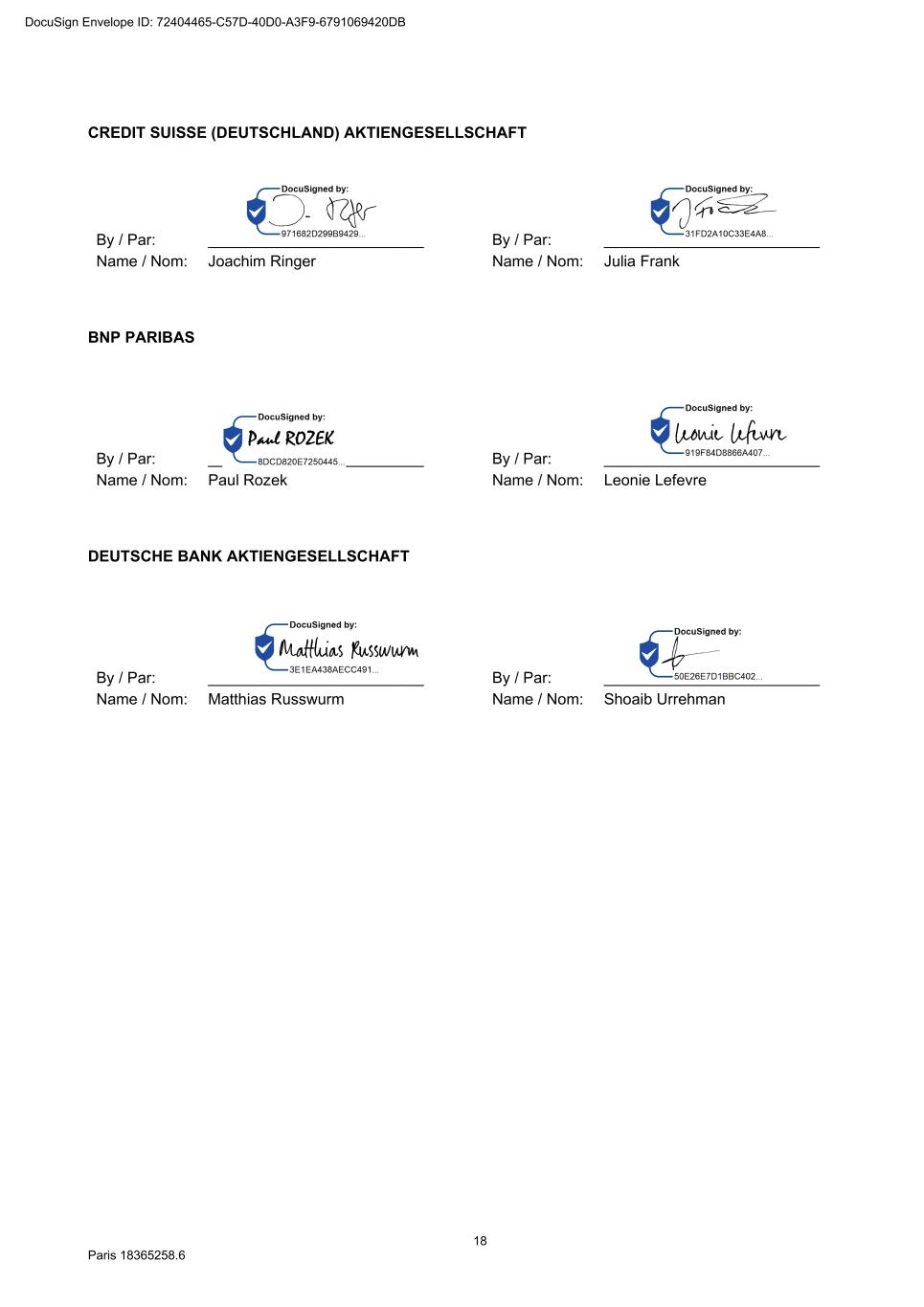 18 Paris 18365258.6 CREDIT SUISSE (DEUTSCHLAND) AKTIENGESELLSCHAFT By / Par: _________________________ Name / Nom: Joachim Ringer By / Par: _________________________ Name / Nom: Julia Frank BNP PARIBAS By / Par: _________________________ Name / Nom: Paul Rozek By / Par: _________________________ Name / Nom: Leonie Lefevre DEUTSCHE BANK AKTIENGESELLSCHAFT By / Par: _________________________ Name / Nom: Matthias Russwurm By / Par: _________________________ Name / Nom: Shoaib Urrehman DocuSign Envelope ID: 72404465-C57D-40D0-A3F9-6791069420DB