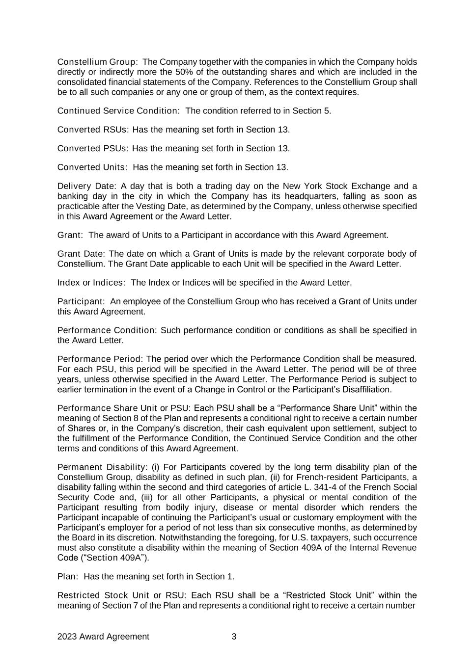 2023 Award Agreement 3 Constellium Group: The Company together with the companies in which the Company holds directly or indirectly more the 50% of the outstanding shares and which are included in the consolidated financial statements of the Company. References to the Constellium Group shall be to all such companies or any one or group of them, as the context requires. Continued Service Condition: The condition referred to in Section 5. Converted RSUs: Has the meaning set forth in Section 13. Converted PSUs: Has the meaning set forth in Section 13. Converted Units: Has the meaning set forth in Section 13. Delivery Date: A day that is both a trading day on the New York Stock Exchange and a banking day in the city in which the Company has its headquarters, falling as soon as practicable after the Vesting Date, as determined by the Company, unless otherwise specified in this Award Agreement or the Award Letter. Grant: The award of Units to a Participant in accordance with this Award Agreement. Grant Date: The date on which a Grant of Units is made by the relevant corporate body of Constellium. The Grant Date applicable to each Unit will be specified in the Award Letter. Index or Indices: The Index or Indices will be specified in the Award Letter. Participant: An employee of the Constellium Group who has received a Grant of Units under this Award Agreement. Performance Condition: Such performance condition or conditions as shall be specified in the Award Letter. Performance Period: The period over which the Performance Condition shall be measured. For each PSU, this period will be specified in the Award Letter. The period will be of three years, unless otherwise specified in the Award Letter. The Performance Period is subject to earlier termination in the event of a Change in Control or the Participant’s Disaffiliation. Performance Share Unit or PSU: Each PSU shall be a “Performance Share Unit” within the meaning of Section 8 of the Plan and represents a conditional right to receive a certain number of Shares or, in the Company’s discretion, their cash equivalent upon settlement, subject to the fulfillment of the Performance Condition, the Continued Service Condition and the other terms and conditions of this Award Agreement. Permanent Disability: (i) For Participants covered by the long term disability plan of the Constellium Group, disability as defined in such plan, (ii) for French-resident Participants, a disability falling within the second and third categories of article L. 341-4 of the French Social Security Code and, (iii) for all other Participants, a physical or mental condition of the Participant resulting from bodily injury, disease or mental disorder which renders the Participant incapable of continuing the Participant’s usual or customary employment with the Participant’s employer for a period of not less than six consecutive months, as determined by the Board in its discretion. Notwithstanding the foregoing, for U.S. taxpayers, such occurrence must also constitute a disability within the meaning of Section 409A of the Internal Revenue Code (“Section 409A”). Plan: Has the meaning set forth in Section 1. Restricted Stock Unit or RSU: Each RSU shall be a “Restricted Stock Unit” within the meaning of Section 7 of the Plan and represents a conditional right to receive a certain number
