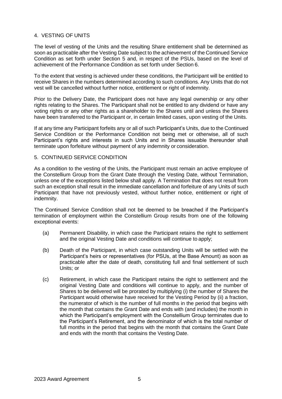 2023 Award Agreement 5 4. VESTING OF UNITS The level of vesting of the Units and the resulting Share entitlement shall be determined as soon as practicable after the Vesting Date subject to the achievement of the Continued Service Condition as set forth under Section 5 and, in respect of the PSUs, based on the level of achievement of the Performance Condition as set forth under Section 6. To the extent that vesting is achieved under these conditions, the Participant will be entitled to receive Shares in the numbers determined according to such conditions. Any Units that do not vest will be cancelled without further notice, entitlement or right of indemnity. Prior to the Delivery Date, the Participant does not have any legal ownership or any other rights relating to the Shares. The Participant shall not be entitled to any dividend or have any voting rights or any other rights as a shareholder to the Shares until and unless the Shares have been transferred to the Participant or, in certain limited cases, upon vesting of the Units. If at any time any Participant forfeits any or all of such Participant’s Units, due to the Continued Service Condition or the Performance Condition not being met or otherwise, all of such Participant’s rights and interests in such Units and in Shares issuable thereunder shall terminate upon forfeiture without payment of any indemnity or consideration. 5. CONTINUED SERVICE CONDITION As a condition to the vesting of the Units, the Participant must remain an active employee of the Constellium Group from the Grant Date through the Vesting Date, without Termination, unless one of the exceptions listed below shall apply. A Termination that does not result from such an exception shall result in the immediate cancellation and forfeiture of any Units of such Participant that have not previously vested, without further notice, entitlement or right of indemnity. The Continued Service Condition shall not be deemed to be breached if the Participant’s termination of employment within the Constellium Group results from one of the following exceptional events: (a) Permanent Disability, in which case the Participant retains the right to settlement and the original Vesting Date and conditions will continue to apply; (b) Death of the Participant, in which case outstanding Units will be settled with the Participant’s heirs or representatives (for PSUs, at the Base Amount) as soon as practicable after the date of death, constituting full and final settlement of such Units; or (c) Retirement, in which case the Participant retains the right to settlement and the original Vesting Date and conditions will continue to apply, and the number of Shares to be delivered will be prorated by multiplying (i) the number of Shares the Participant would otherwise have received for the Vesting Period by (ii) a fraction, the numerator of which is the number of full months in the period that begins with the month that contains the Grant Date and ends with (and includes) the month in which the Participant’s employment with the Constellium Group terminates due to the Participant’s Retirement, and the denominator of which is the total number of full months in the period that begins with the month that contains the Grant Date and ends with the month that contains the Vesting Date.