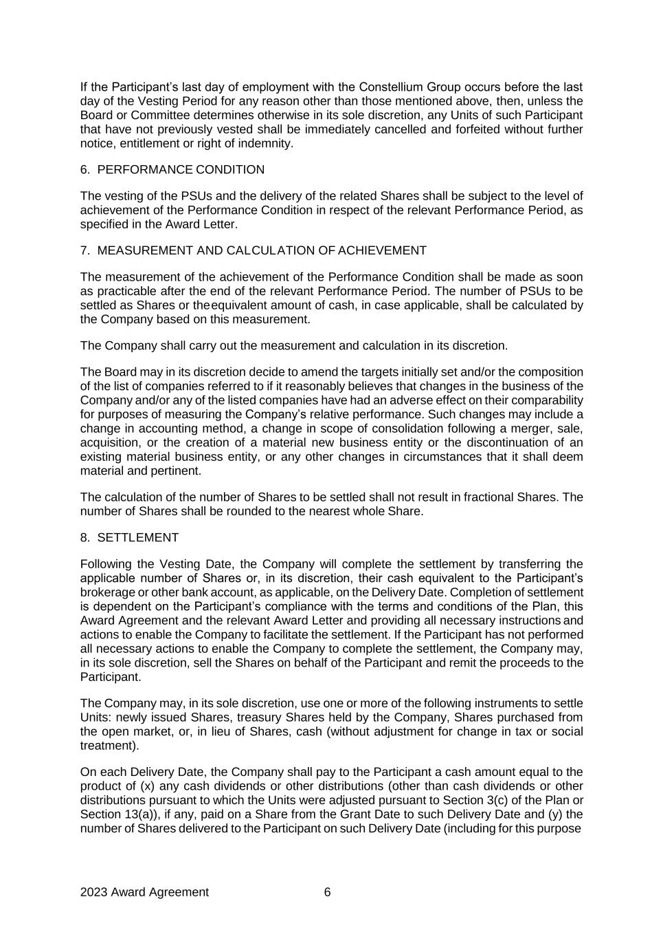 2023 Award Agreement 6 If the Participant’s last day of employment with the Constellium Group occurs before the last day of the Vesting Period for any reason other than those mentioned above, then, unless the Board or Committee determines otherwise in its sole discretion, any Units of such Participant that have not previously vested shall be immediately cancelled and forfeited without further notice, entitlement or right of indemnity. 6. PERFORMANCE CONDITION The vesting of the PSUs and the delivery of the related Shares shall be subject to the level of achievement of the Performance Condition in respect of the relevant Performance Period, as specified in the Award Letter. 7. MEASUREMENT AND CALCULATION OF ACHIEVEMENT The measurement of the achievement of the Performance Condition shall be made as soon as practicable after the end of the relevant Performance Period. The number of PSUs to be settled as Shares or the equivalent amount of cash, in case applicable, shall be calculated by the Company based on this measurement. The Company shall carry out the measurement and calculation in its discretion. The Board may in its discretion decide to amend the targets initially set and/or the composition of the list of companies referred to if it reasonably believes that changes in the business of the Company and/or any of the listed companies have had an adverse effect on their comparability for purposes of measuring the Company’s relative performance. Such changes may include a change in accounting method, a change in scope of consolidation following a merger, sale, acquisition, or the creation of a material new business entity or the discontinuation of an existing material business entity, or any other changes in circumstances that it shall deem material and pertinent. The calculation of the number of Shares to be settled shall not result in fractional Shares. The number of Shares shall be rounded to the nearest whole Share. 8. SETTLEMENT Following the Vesting Date, the Company will complete the settlement by transferring the applicable number of Shares or, in its discretion, their cash equivalent to the Participant’s brokerage or other bank account, as applicable, on the Delivery Date. Completion of settlement is dependent on the Participant’s compliance with the terms and conditions of the Plan, this Award Agreement and the relevant Award Letter and providing all necessary instructions and actions to enable the Company to facilitate the settlement. If the Participant has not performed all necessary actions to enable the Company to complete the settlement, the Company may, in its sole discretion, sell the Shares on behalf of the Participant and remit the proceeds to the Participant. The Company may, in its sole discretion, use one or more of the following instruments to settle Units: newly issued Shares, treasury Shares held by the Company, Shares purchased from the open market, or, in lieu of Shares, cash (without adjustment for change in tax or social treatment). On each Delivery Date, the Company shall pay to the Participant a cash amount equal to the product of (x) any cash dividends or other distributions (other than cash dividends or other distributions pursuant to which the Units were adjusted pursuant to Section 3(c) of the Plan or Section 13(a)), if any, paid on a Share from the Grant Date to such Delivery Date and (y) the number of Shares delivered to the Participant on such Delivery Date (including for this purpose