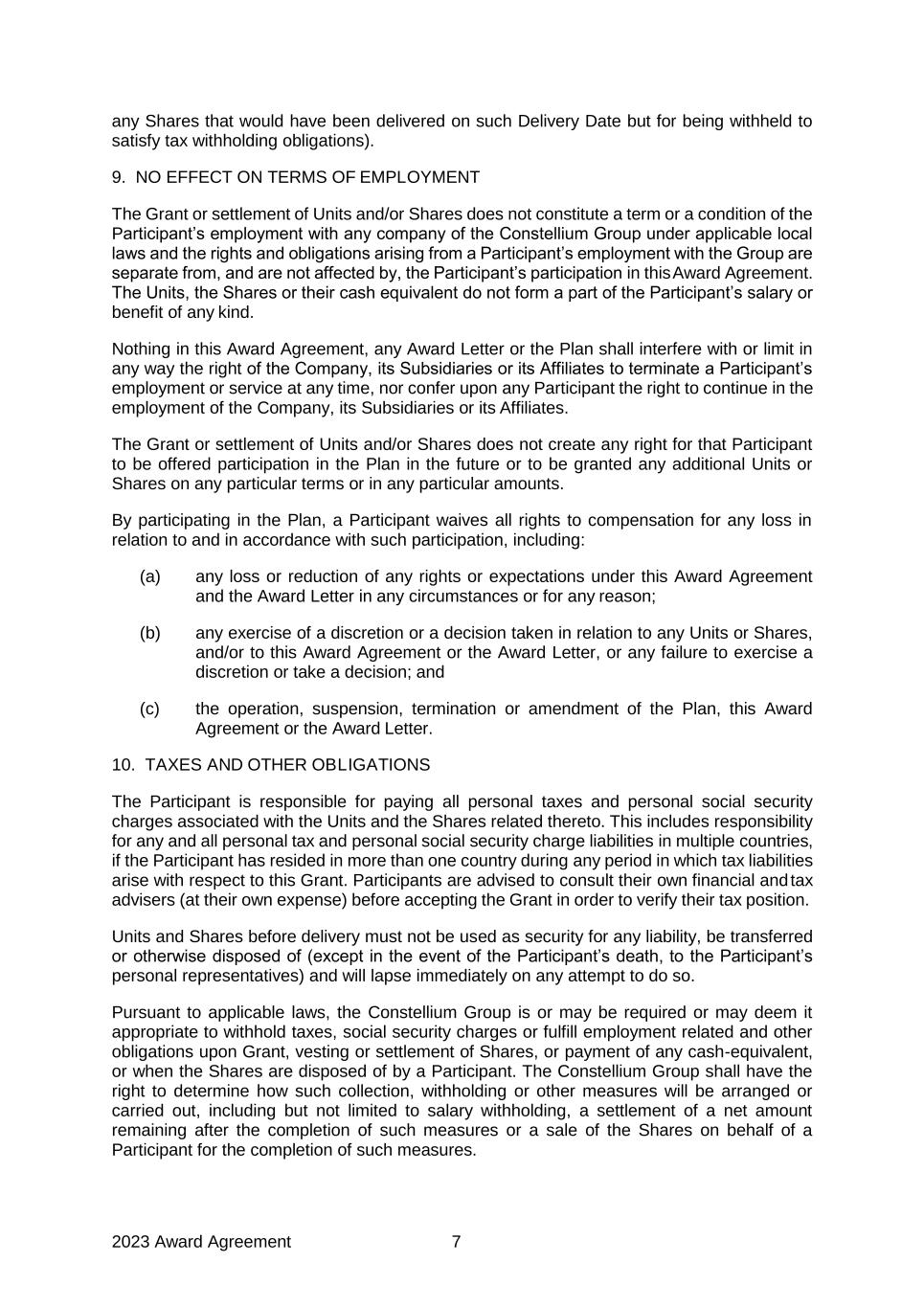 2023 Award Agreement 7 any Shares that would have been delivered on such Delivery Date but for being withheld to satisfy tax withholding obligations). 9. NO EFFECT ON TERMS OF EMPLOYMENT The Grant or settlement of Units and/or Shares does not constitute a term or a condition of the Participant’s employment with any company of the Constellium Group under applicable local laws and the rights and obligations arising from a Participant’s employment with the Group are separate from, and are not affected by, the Participant’s participation in this Award Agreement. The Units, the Shares or their cash equivalent do not form a part of the Participant’s salary or benefit of any kind. Nothing in this Award Agreement, any Award Letter or the Plan shall interfere with or limit in any way the right of the Company, its Subsidiaries or its Affiliates to terminate a Participant’s employment or service at any time, nor confer upon any Participant the right to continue in the employment of the Company, its Subsidiaries or its Affiliates. The Grant or settlement of Units and/or Shares does not create any right for that Participant to be offered participation in the Plan in the future or to be granted any additional Units or Shares on any particular terms or in any particular amounts. By participating in the Plan, a Participant waives all rights to compensation for any loss in relation to and in accordance with such participation, including: (a) any loss or reduction of any rights or expectations under this Award Agreement and the Award Letter in any circumstances or for any reason; (b) any exercise of a discretion or a decision taken in relation to any Units or Shares, and/or to this Award Agreement or the Award Letter, or any failure to exercise a discretion or take a decision; and (c) the operation, suspension, termination or amendment of the Plan, this Award Agreement or the Award Letter. 10. TAXES AND OTHER OBLIGATIONS The Participant is responsible for paying all personal taxes and personal social security charges associated with the Units and the Shares related thereto. This includes responsibility for any and all personal tax and personal social security charge liabilities in multiple countries, if the Participant has resided in more than one country during any period in which tax liabilities arise with respect to this Grant. Participants are advised to consult their own financial and tax advisers (at their own expense) before accepting the Grant in order to verify their tax position. Units and Shares before delivery must not be used as security for any liability, be transferred or otherwise disposed of (except in the event of the Participant’s death, to the Participant’s personal representatives) and will lapse immediately on any attempt to do so. Pursuant to applicable laws, the Constellium Group is or may be required or may deem it appropriate to withhold taxes, social security charges or fulfill employment related and other obligations upon Grant, vesting or settlement of Shares, or payment of any cash-equivalent, or when the Shares are disposed of by a Participant. The Constellium Group shall have the right to determine how such collection, withholding or other measures will be arranged or carried out, including but not limited to salary withholding, a settlement of a net amount remaining after the completion of such measures or a sale of the Shares on behalf of a Participant for the completion of such measures.