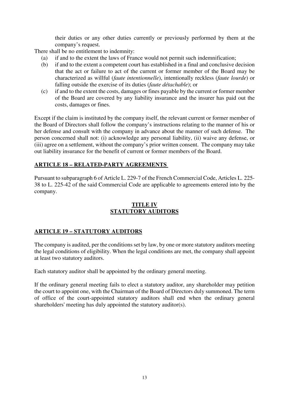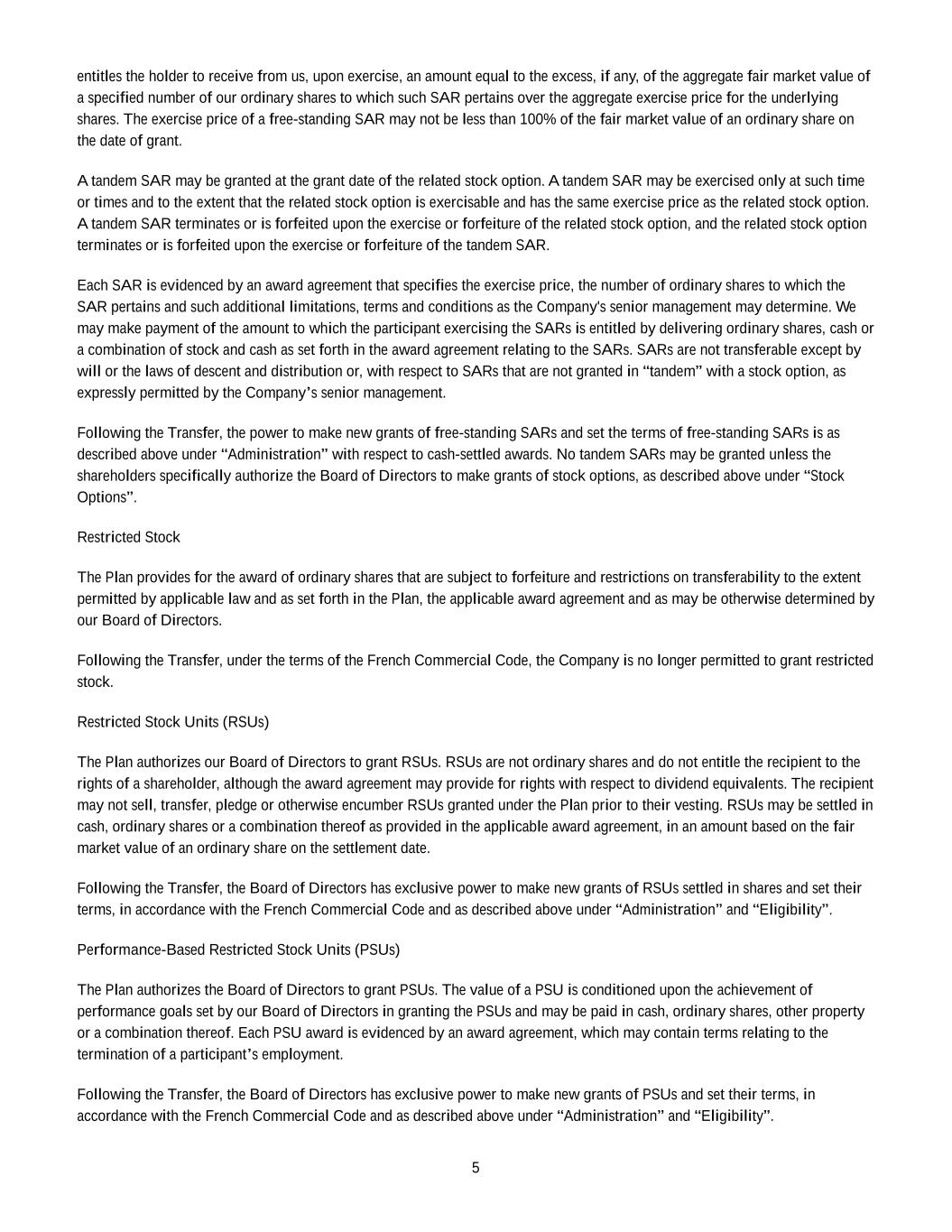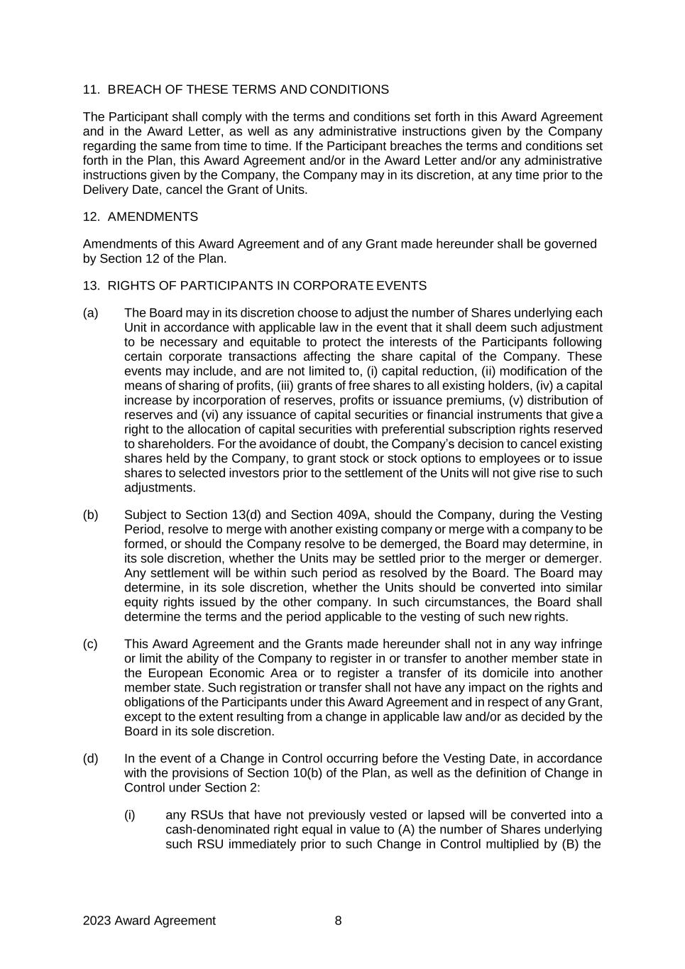 2023 Award Agreement 8 11. BREACH OF THESE TERMS AND CONDITIONS The Participant shall comply with the terms and conditions set forth in this Award Agreement and in the Award Letter, as well as any administrative instructions given by the Company regarding the same from time to time. If the Participant breaches the terms and conditions set forth in the Plan, this Award Agreement and/or in the Award Letter and/or any administrative instructions given by the Company, the Company may in its discretion, at any time prior to the Delivery Date, cancel the Grant of Units. 12. AMENDMENTS Amendments of this Award Agreement and of any Grant made hereunder shall be governed by Section 12 of the Plan. 13. RIGHTS OF PARTICIPANTS IN CORPORATE EVENTS (a) The Board may in its discretion choose to adjust the number of Shares underlying each Unit in accordance with applicable law in the event that it shall deem such adjustment to be necessary and equitable to protect the interests of the Participants following certain corporate transactions affecting the share capital of the Company. These events may include, and are not limited to, (i) capital reduction, (ii) modification of the means of sharing of profits, (iii) grants of free shares to all existing holders, (iv) a capital increase by incorporation of reserves, profits or issuance premiums, (v) distribution of reserves and (vi) any issuance of capital securities or financial instruments that give a right to the allocation of capital securities with preferential subscription rights reserved to shareholders. For the avoidance of doubt, the Company’s decision to cancel existing shares held by the Company, to grant stock or stock options to employees or to issue shares to selected investors prior to the settlement of the Units will not give rise to such adjustments. (b) Subject to Section 13(d) and Section 409A, should the Company, during the Vesting Period, resolve to merge with another existing company or merge with a company to be formed, or should the Company resolve to be demerged, the Board may determine, in its sole discretion, whether the Units may be settled prior to the merger or demerger. Any settlement will be within such period as resolved by the Board. The Board may determine, in its sole discretion, whether the Units should be converted into similar equity rights issued by the other company. In such circumstances, the Board shall determine the terms and the period applicable to the vesting of such new rights. (c) This Award Agreement and the Grants made hereunder shall not in any way infringe or limit the ability of the Company to register in or transfer to another member state in the European Economic Area or to register a transfer of its domicile into another member state. Such registration or transfer shall not have any impact on the rights and obligations of the Participants under this Award Agreement and in respect of any Grant, except to the extent resulting from a change in applicable law and/or as decided by the Board in its sole discretion. (d) In the event of a Change in Control occurring before the Vesting Date, in accordance with the provisions of Section 10(b) of the Plan, as well as the definition of Change in Control under Section 2: (i) any RSUs that have not previously vested or lapsed will be converted into a cash-denominated right equal in value to (A) the number of Shares underlying such RSU immediately prior to such Change in Control multiplied by (B) the