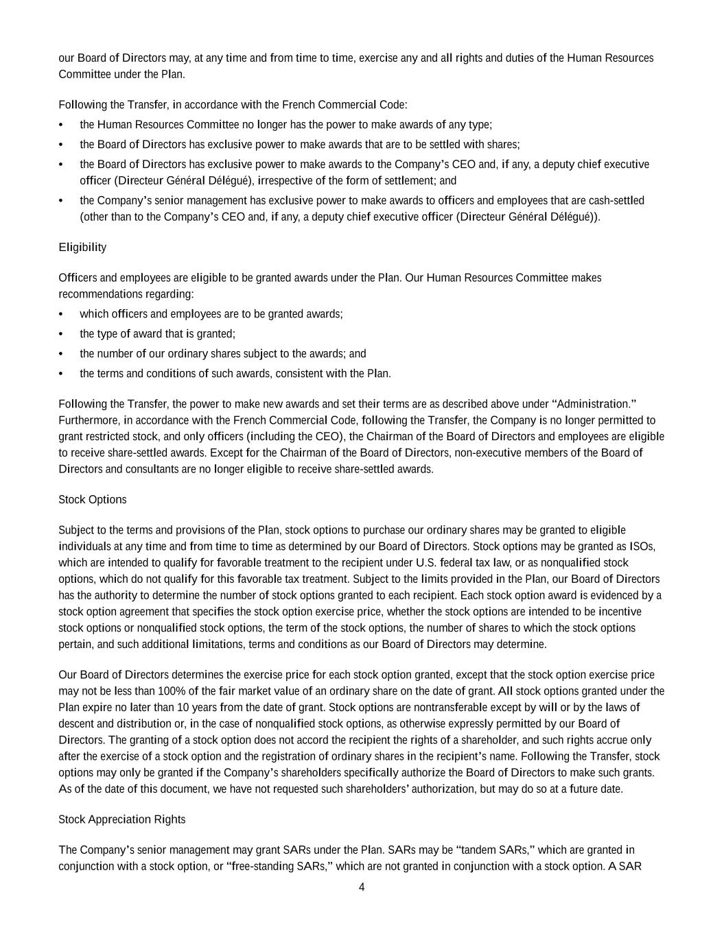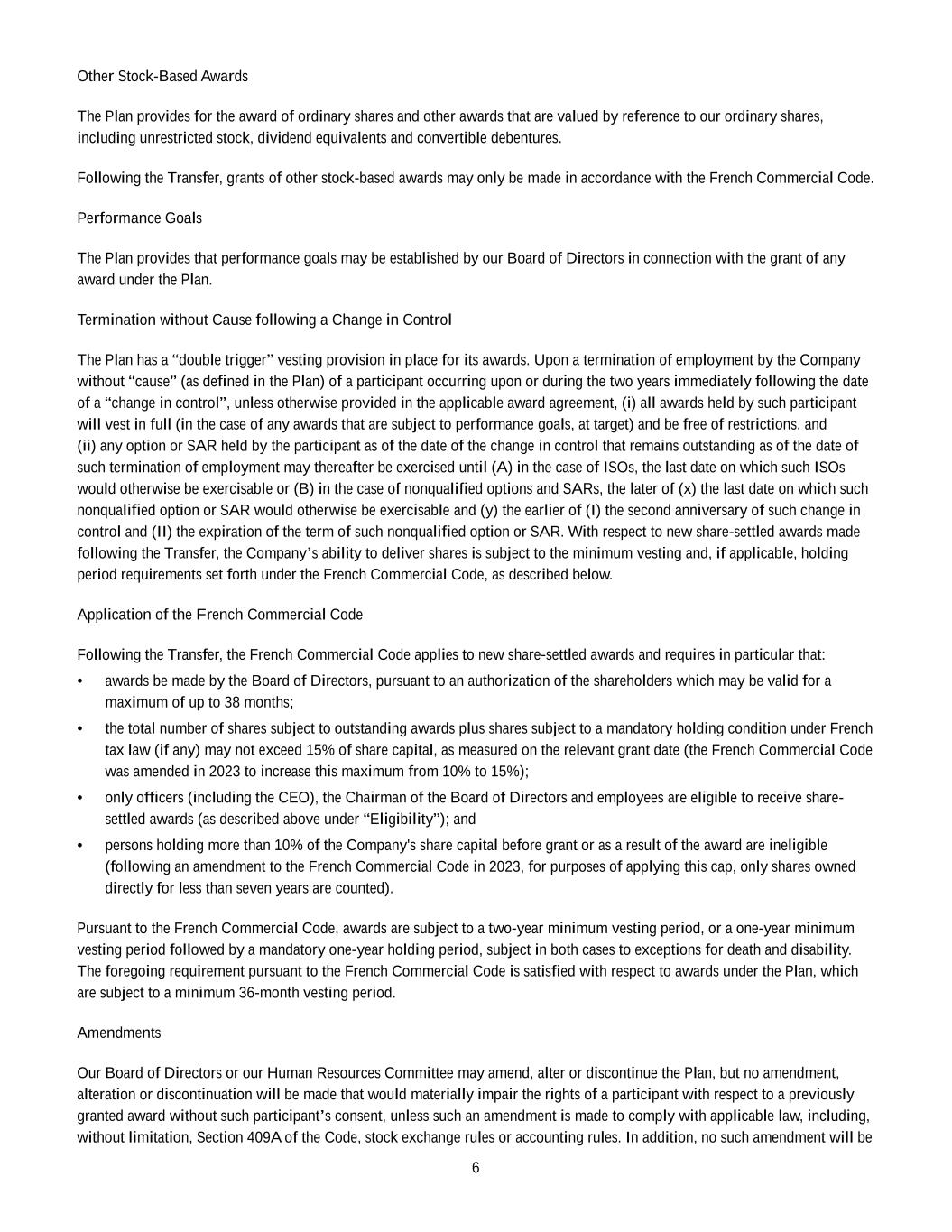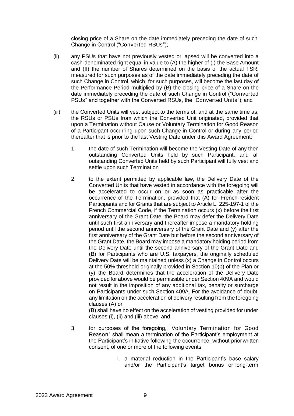 2023 Award Agreement 9 closing price of a Share on the date immediately preceding the date of such Change in Control (“Converted RSUs”); (ii) any PSUs that have not previously vested or lapsed will be converted into a cash-denominated right equal in value to (A) the higher of (I) the Base Amount and (II) the number of Shares determined on the basis of the actual TSR, measured for such purposes as of the date immediately preceding the date of such Change in Control, which, for such purposes, will become the last day of the Performance Period multiplied by (B) the closing price of a Share on the date immediately preceding the date of such Change in Control (“Converted PSUs” and together with the Converted RSUs, the “Converted Units”); and (iii) the Converted Units will vest subject to the terms of, and at the same time as, the RSUs or PSUs from which the Converted Unit originated, provided that upon a Termination without Cause or Voluntary Termination for Good Reason of a Participant occurring upon such Change in Control or during any period thereafter that is prior to the last Vesting Date under this Award Agreement: 1. the date of such Termination will become the Vesting Date of any then outstanding Converted Units held by such Participant, and all outstanding Converted Units held by such Participant will fully vest and settle upon such Termination 2. to the extent permitted by applicable law, the Delivery Date of the Converted Units that have vested in accordance with the foregoing will be accelerated to occur on or as soon as practicable after the occurrence of the Termination, provided that (A) for French-resident Participants and for Grants that are subject to Article L. 225-197-1 of the French Commercial Code, if the Termination occurs (x) before the first anniversary of the Grant Date, the Board may defer the Delivery Date until such first anniversary and thereafter impose a mandatory holding period until the second anniversary of the Grant Date and (y) after the first anniversary of the Grant Date but before the second anniversary of the Grant Date, the Board may impose a mandatory holding period from the Delivery Date until the second anniversary of the Grant Date and (B) for Participants who are U.S. taxpayers, the originally scheduled Delivery Date will be maintained unless (x) a Change in Control occurs at the 50% threshold originally provided in Section 10(b) of the Plan or (y) the Board determines that the acceleration of the Delivery Date provided for above would be permissible under Section 409A and would not result in the imposition of any additional tax, penalty or surcharge on Participants under such Section 409A. For the avoidance of doubt, any limitation on the acceleration of delivery resulting from the foregoing clauses (A) or (B) shall have no effect on the acceleration of vesting provided for under clauses (i), (ii) and (iii) above, and 3. for purposes of the foregoing, “Voluntary Termination for Good Reason” shall mean a termination of the Participant’s employment at the Participant’s initiative following the occurrence, without prior written consent, of one or more of the following events: i. a material reduction in the Participant’s base salary and/or the Participant’s target bonus or long-term