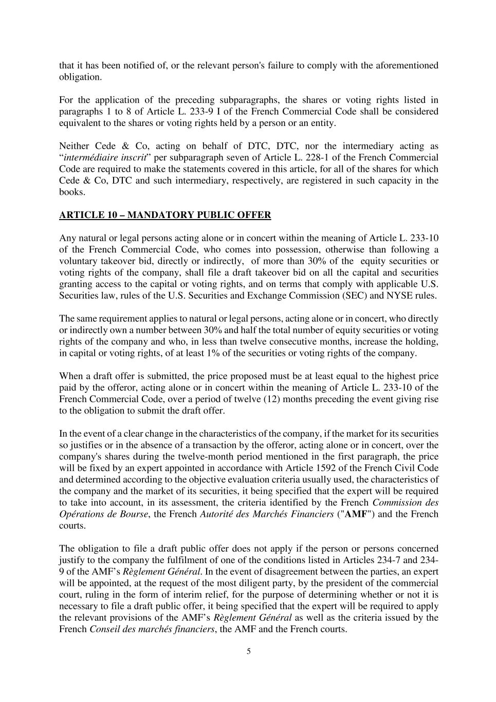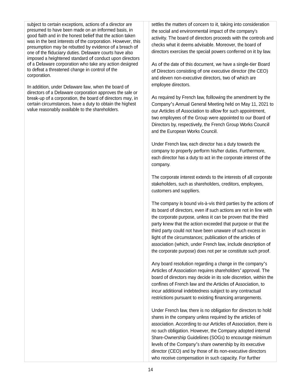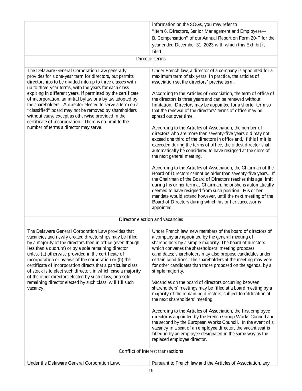 2023 Award Agreement 9 closing price of a Share on the date immediately preceding the date of such Change in Control (“Converted RSUs”); (ii) any PSUs that have not previously vested or lapsed will be converted into a cash-denominated right equal in value to (A) the higher of (I) the Base Amount and (II) the number of Shares determined on the basis of the actual TSR, measured for such purposes as of the date immediately preceding the date of such Change in Control, which, for such purposes, will become the last day of the Performance Period multiplied by (B) the closing price of a Share on the date immediately preceding the date of such Change in Control (“Converted PSUs” and together with the Converted RSUs, the “Converted Units”); and (iii) the Converted Units will vest subject to the terms of, and at the same time as, the RSUs or PSUs from which the Converted Unit originated, provided that upon a Termination without Cause or Voluntary Termination for Good Reason of a Participant occurring upon such Change in Control or during any period thereafter that is prior to the last Vesting Date under this Award Agreement: 1. the date of such Termination will become the Vesting Date of any then outstanding Converted Units held by such Participant, and all outstanding Converted Units held by such Participant will fully vest and settle upon such Termination 2. to the extent permitted by applicable law, the Delivery Date of the Converted Units that have vested in accordance with the foregoing will be accelerated to occur on or as soon as practicable after the occurrence of the Termination, provided that (A) for French-resident Participants and for Grants that are subject to Article L. 225-197-1 of the French Commercial Code, if the Termination occurs (x) before the first anniversary of the Grant Date, the Board may defer the Delivery Date until such first anniversary and thereafter impose a mandatory holding period until the second anniversary of the Grant Date and (y) after the first anniversary of the Grant Date but before the second anniversary of the Grant Date, the Board may impose a mandatory holding period from the Delivery Date until the second anniversary of the Grant Date and (B) for Participants who are U.S. taxpayers, the originally scheduled Delivery Date will be maintained unless (x) a Change in Control occurs at the 50% threshold originally provided in Section 10(b) of the Plan or (y) the Board determines that the acceleration of the Delivery Date provided for above would be permissible under Section 409A and would not result in the imposition of any additional tax, penalty or surcharge on Participants under such Section 409A. For the avoidance of doubt, any limitation on the acceleration of delivery resulting from the foregoing clauses (A) or (B) shall have no effect on the acceleration of vesting provided for under clauses (i), (ii) and (iii) above, and 3. for purposes of the foregoing, “Voluntary Termination for Good Reason” shall mean a termination of the Participant’s employment at the Participant’s initiative following the occurrence, without prior written consent, of one or more of the following events: i. a material reduction in the Participant’s base salary and/or the Participant’s target bonus or long-term