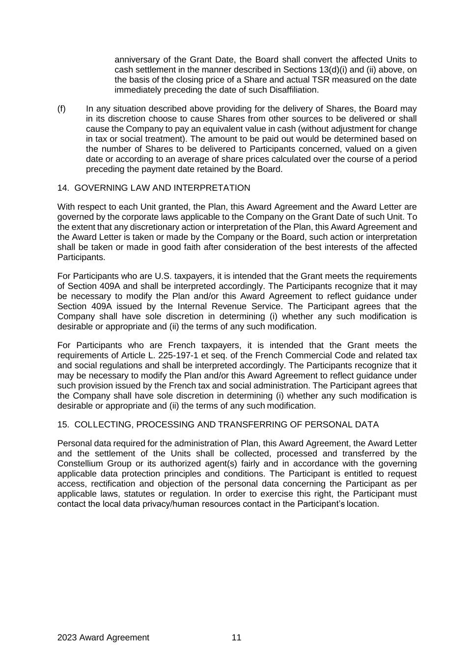 2023 Award Agreement 11 anniversary of the Grant Date, the Board shall convert the affected Units to cash settlement in the manner described in Sections 13(d)(i) and (ii) above, on the basis of the closing price of a Share and actual TSR measured on the date immediately preceding the date of such Disaffiliation. (f) In any situation described above providing for the delivery of Shares, the Board may in its discretion choose to cause Shares from other sources to be delivered or shall cause the Company to pay an equivalent value in cash (without adjustment for change in tax or social treatment). The amount to be paid out would be determined based on the number of Shares to be delivered to Participants concerned, valued on a given date or according to an average of share prices calculated over the course of a period preceding the payment date retained by the Board. 14. GOVERNING LAW AND INTERPRETATION With respect to each Unit granted, the Plan, this Award Agreement and the Award Letter are governed by the corporate laws applicable to the Company on the Grant Date of such Unit. To the extent that any discretionary action or interpretation of the Plan, this Award Agreement and the Award Letter is taken or made by the Company or the Board, such action or interpretation shall be taken or made in good faith after consideration of the best interests of the affected Participants. For Participants who are U.S. taxpayers, it is intended that the Grant meets the requirements of Section 409A and shall be interpreted accordingly. The Participants recognize that it may be necessary to modify the Plan and/or this Award Agreement to reflect guidance under Section 409A issued by the Internal Revenue Service. The Participant agrees that the Company shall have sole discretion in determining (i) whether any such modification is desirable or appropriate and (ii) the terms of any such modification. For Participants who are French taxpayers, it is intended that the Grant meets the requirements of Article L. 225-197-1 et seq. of the French Commercial Code and related tax and social regulations and shall be interpreted accordingly. The Participants recognize that it may be necessary to modify the Plan and/or this Award Agreement to reflect guidance under such provision issued by the French tax and social administration. The Participant agrees that the Company shall have sole discretion in determining (i) whether any such modification is desirable or appropriate and (ii) the terms of any such modification. 15. COLLECTING, PROCESSING AND TRANSFERRING OF PERSONAL DATA Personal data required for the administration of Plan, this Award Agreement, the Award Letter and the settlement of the Units shall be collected, processed and transferred by the Constellium Group or its authorized agent(s) fairly and in accordance with the governing applicable data protection principles and conditions. The Participant is entitled to request access, rectification and objection of the personal data concerning the Participant as per applicable laws, statutes or regulation. In order to exercise this right, the Participant must contact the local data privacy/human resources contact in the Participant’s location.