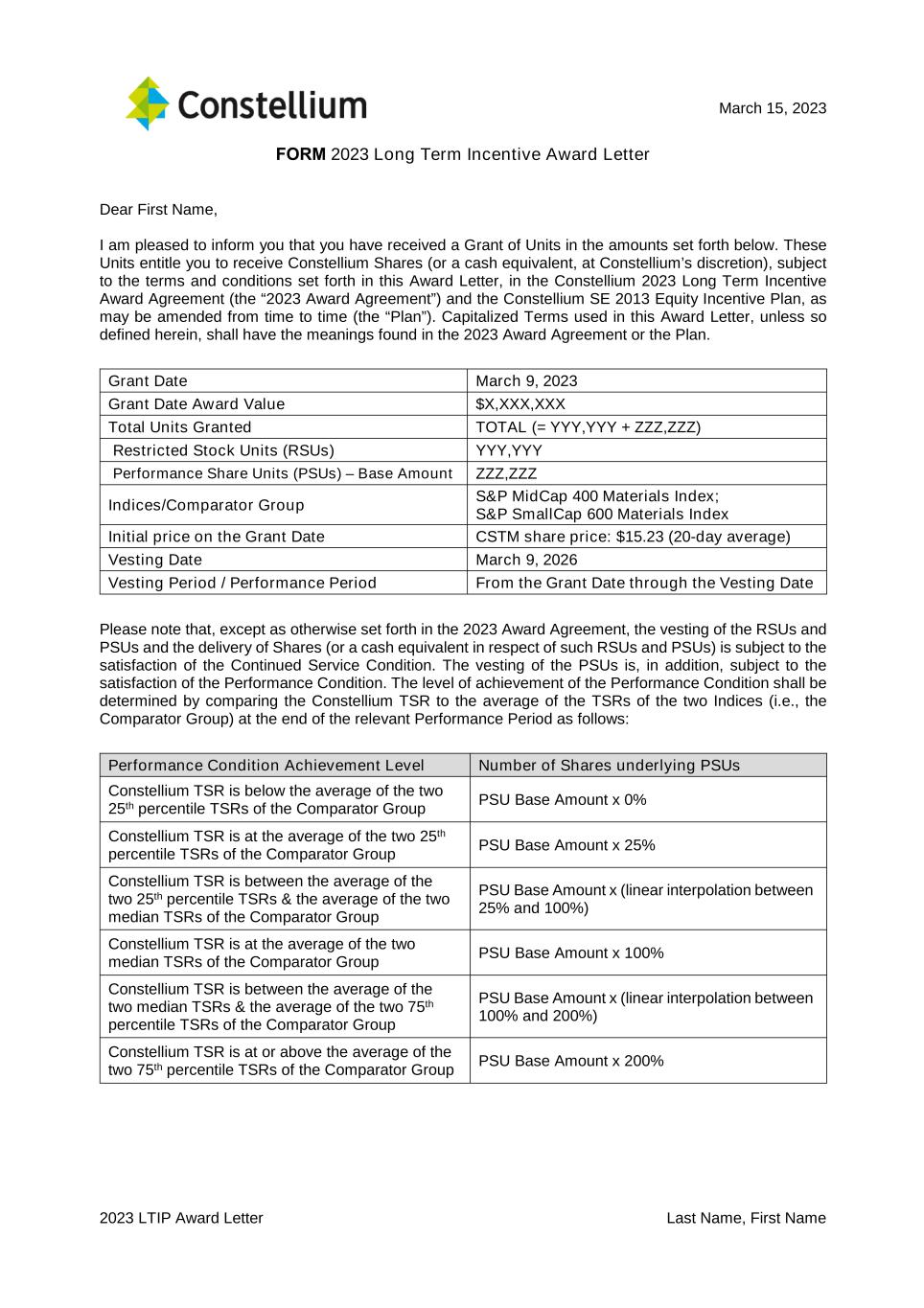 2023 LTIP Award Letter Last Name, First Name March 15, 2023 FORM 2023 Long Term Incentive Award Letter Dear First Name, I am pleased to inform you that you have received a Grant of Units in the amounts set forth below. These Units entitle you to receive Constellium Shares (or a cash equivalent, at Constellium’s discretion), subject to the terms and conditions set forth in this Award Letter, in the Constellium 2023 Long Term Incentive Award Agreement (the “2023 Award Agreement”) and the Constellium SE 2013 Equity Incentive Plan, as may be amended from time to time (the “Plan”). Capitalized Terms used in this Award Letter, unless so defined herein, shall have the meanings found in the 2023 Award Agreement or the Plan. Grant Date March 9, 2023 Grant Date Award Value $X,XXX,XXX Total Units Granted TOTAL (= YYY,YYY + ZZZ,ZZZ) Restricted Stock Units (RSUs) YYY,YYY Performance Share Units (PSUs) – Base Amount ZZZ,ZZZ Indices/Comparator Group S&P MidCap 400 Materials Index; S&P SmallCap 600 Materials Index Initial price on the Grant Date CSTM share price: $15.23 (20-day average) Vesting Date March 9, 2026 Vesting Period / Performance Period From the Grant Date through the Vesting Date Please note that, except as otherwise set forth in the 2023 Award Agreement, the vesting of the RSUs and PSUs and the delivery of Shares (or a cash equivalent in respect of such RSUs and PSUs) is subject to the satisfaction of the Continued Service Condition. The vesting of the PSUs is, in addition, subject to the satisfaction of the Performance Condition. The level of achievement of the Performance Condition shall be determined by comparing the Constellium TSR to the average of the TSRs of the two Indices (i.e., the Comparator Group) at the end of the relevant Performance Period as follows: Performance Condition Achievement Level Number of Shares underlying PSUs Constellium TSR is below the average of the two 25th percentile TSRs of the Comparator Group PSU Base Amount x 0% Constellium TSR is at the average of the two 25th percentile TSRs of the Comparator Group PSU Base Amount x 25% Constellium TSR is between the average of the two 25th percentile TSRs & the average of the two median TSRs of the Comparator Group PSU Base Amount x (linear interpolation between 25% and 100%) Constellium TSR is at the average of the two median TSRs of the Comparator Group PSU Base Amount x 100% Constellium TSR is between the average of the two median TSRs & the average of the two 75th percentile TSRs of the Comparator Group PSU Base Amount x (linear interpolation between 100% and 200%) Constellium TSR is at or above the average of the two 75th percentile TSRs of the Comparator Group PSU Base Amount x 200%