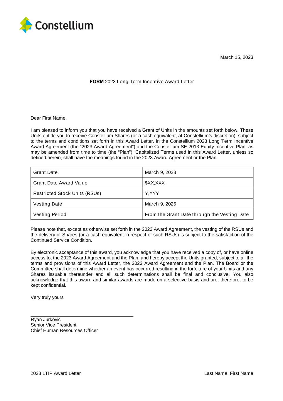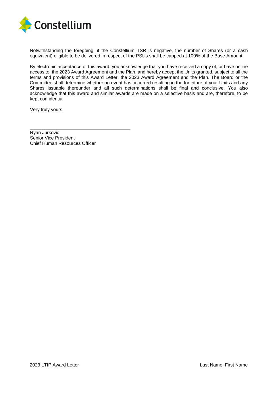2023 LTIP Award Letter Last Name, First Name Notwithstanding the foregoing, if the Constellium TSR is negative, the number of Shares (or a cash equivalent) eligible to be delivered in respect of the PSUs shall be capped at 100% of the Base Amount. By electronic acceptance of this award, you acknowledge that you have received a copy of, or have online access to, the 2023 Award Agreement and the Plan, and hereby accept the Units granted, subject to all the terms and provisions of this Award Letter, the 2023 Award Agreement and the Plan. The Board or the Committee shall determine whether an event has occurred resulting in the forfeiture of your Units and any Shares issuable thereunder and all such determinations shall be final and conclusive. You also acknowledge that this award and similar awards are made on a selective basis and are, therefore, to be kept confidential. Very truly yours, Ryan Jurkovic Senior Vice President Chief Human Resources Officer