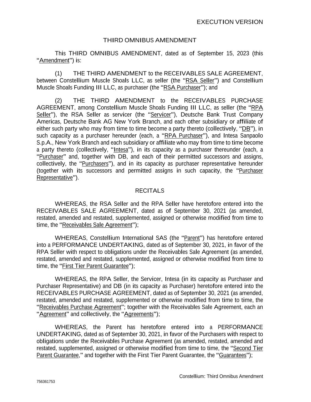 EXECUTION VERSION Constellium: Third Omnibus Amendment 756361753 THIRD OMNIBUS AMENDMENT This THIRD OMNIBUS AMENDMENT, dated as of September 15, 2023 (this “Amendment”) is: (1) THE THIRD AMENDMENT to the RECEIVABLES SALE AGREEMENT, between Constellium Muscle Shoals LLC, as seller (the “RSA Seller”) and Constellium Muscle Shoals Funding III LLC, as purchaser (the “RSA Purchaser”); and (2) THE THIRD AMENDMENT to the RECEIVABLES PURCHASE AGREEMENT, among Constellium Muscle Shoals Funding III LLC, as seller (the “RPA Seller”), the RSA Seller as servicer (the “Servicer”), Deutsche Bank Trust Company Americas, Deutsche Bank AG New York Branch, and each other subsidiary or affiliate of either such party who may from time to time become a party thereto (collectively, “DB”), in such capacity as a purchaser hereunder (each, a “RPA Purchaser”), and Intesa Sanpaolo S.p.A., New York Branch and each subsidiary or affiliate who may from time to time become a party thereto (collectively, “Intesa”), in its capacity as a purchaser thereunder (each, a “Purchaser” and, together with DB, and each of their permitted successors and assigns, collectively, the “Purchasers”), and in its capacity as purchaser representative hereunder (together with its successors and permitted assigns in such capacity, the “Purchaser Representative”). RECITALS WHEREAS, the RSA Seller and the RPA Seller have heretofore entered into the RECEIVABLES SALE AGREEMENT, dated as of September 30, 2021 (as amended, restated, amended and restated, supplemented, assigned or otherwise modified from time to time, the “Receivables Sale Agreement”); WHEREAS, Constellium International SAS (the “Parent”) has heretofore entered into a PERFORMANCE UNDERTAKING, dated as of September 30, 2021, in favor of the RPA Seller with respect to obligations under the Receivables Sale Agreement (as amended, restated, amended and restated, supplemented, assigned or otherwise modified from time to time, the “First Tier Parent Guarantee”); WHEREAS, the RPA Seller, the Servicer, Intesa (in its capacity as Purchaser and Purchaser Representative) and DB (in its capacity as Purchaser) heretofore entered into the RECEIVABLES PURCHASE AGREEMENT, dated as of September 30, 2021 (as amended, restated, amended and restated, supplemented or otherwise modified from time to time, the “Receivables Purchase Agreement”; together with the Receivables Sale Agreement, each an “Agreement” and collectively, the “Agreements”); WHEREAS, the Parent has heretofore entered into a PERFORMANCE UNDERTAKING, dated as of September 30, 2021, in favor of the Purchasers with respect to obligations under the Receivables Purchase Agreement (as amended, restated, amended and restated, supplemented, assigned or otherwise modified from time to time, the “Second Tier Parent Guarantee,” and together with the First Tier Parent Guarantee, the “Guarantees”);