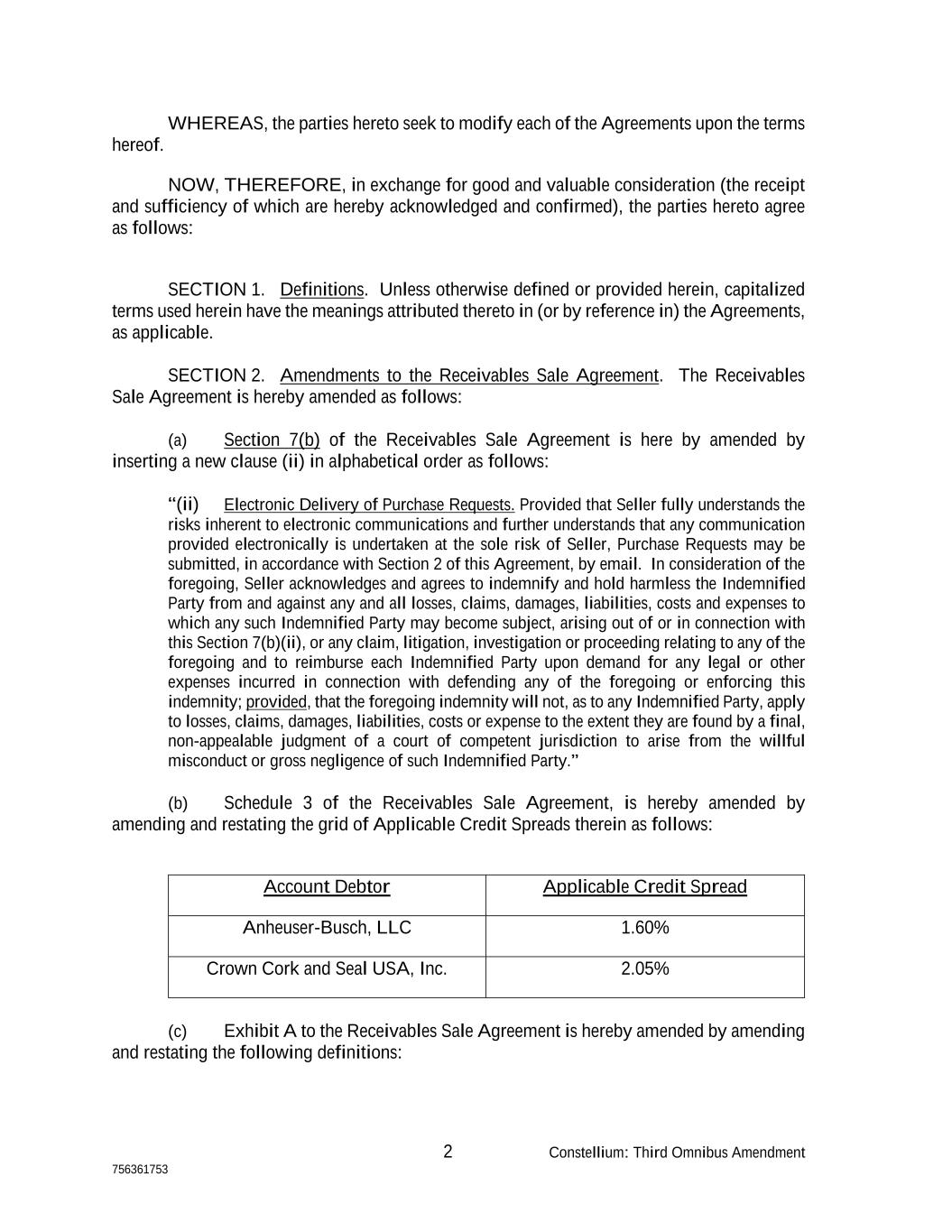 2 Constellium: Third Omnibus Amendment 756361753 WHEREAS, the parties hereto seek to modify each of the Agreements upon the terms hereof. NOW, THEREFORE, in exchange for good and valuable consideration (the receipt and sufficiency of which are hereby acknowledged and confirmed), the parties hereto agree as follows: SECTION 1. Definitions. Unless otherwise defined or provided herein, capitalized terms used herein have the meanings attributed thereto in (or by reference in) the Agreements, as applicable. SECTION 2. Amendments to the Receivables Sale Agreement. The Receivables Sale Agreement is hereby amended as follows: (a) Section 7(b) of the Receivables Sale Agreement is here by amended by inserting a new clause (ii) in alphabetical order as follows: “(ii) Electronic Delivery of Purchase Requests. Provided that Seller fully understands the risks inherent to electronic communications and further understands that any communication provided electronically is undertaken at the sole risk of Seller, Purchase Requests may be submitted, in accordance with Section 2 of this Agreement, by email. In consideration of the foregoing, Seller acknowledges and agrees to indemnify and hold harmless the Indemnified Party from and against any and all losses, claims, damages, liabilities, costs and expenses to which any such Indemnified Party may become subject, arising out of or in connection with this Section 7(b)(ii), or any claim, litigation, investigation or proceeding relating to any of the foregoing and to reimburse each Indemnified Party upon demand for any legal or other expenses incurred in connection with defending any of the foregoing or enforcing this indemnity; provided, that the foregoing indemnity will not, as to any Indemnified Party, apply to losses, claims, damages, liabilities, costs or expense to the extent they are found by a final, non-appealable judgment of a court of competent jurisdiction to arise from the willful misconduct or gross negligence of such Indemnified Party.” (b) Schedule 3 of the Receivables Sale Agreement, is hereby amended by amending and restating the grid of Applicable Credit Spreads therein as follows: Account Debtor Applicable Credit Spread Anheuser-Busch, LLC 1.60% Crown Cork and Seal USA, Inc. 2.05% (c) Exhibit A to the Receivables Sale Agreement is hereby amended by amending and restating the following definitions: