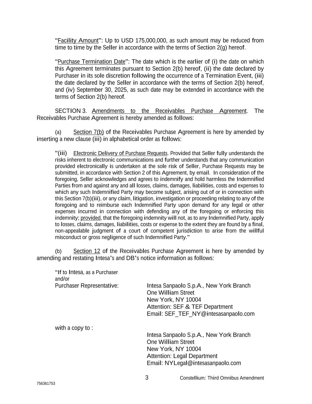 3 Constellium: Third Omnibus Amendment 756361753 “Facility Amount”: Up to USD 175,000,000, as such amount may be reduced from time to time by the Seller in accordance with the terms of Section 2(g) hereof. “Purchase Termination Date”: The date which is the earlier of (i) the date on which this Agreement terminates pursuant to Section 2(b) hereof, (ii) the date declared by Purchaser in its sole discretion following the occurrence of a Termination Event, (iii) the date declared by the Seller in accordance with the terms of Section 2(b) hereof, and (iv) September 30, 2025, as such date may be extended in accordance with the terms of Section 2(b) hereof. SECTION 3. Amendments to the Receivables Purchase Agreement. The Receivables Purchase Agreement is hereby amended as follows: (a) Section 7(b) of the Receivables Purchase Agreement is here by amended by inserting a new clause (iii) in alphabetical order as follows: “(iii) Electronic Delivery of Purchase Requests. Provided that Seller fully understands the risks inherent to electronic communications and further understands that any communication provided electronically is undertaken at the sole risk of Seller, Purchase Requests may be submitted, in accordance with Section 2 of this Agreement, by email. In consideration of the foregoing, Seller acknowledges and agrees to indemnify and hold harmless the Indemnified Parties from and against any and all losses, claims, damages, liabilities, costs and expenses to which any such Indemnified Party may become subject, arising out of or in connection with this Section 7(b)(iii), or any claim, litigation, investigation or proceeding relating to any of the foregoing and to reimburse each Indemnified Party upon demand for any legal or other expenses incurred in connection with defending any of the foregoing or enforcing this indemnity; provided, that the foregoing indemnity will not, as to any Indemnified Party, apply to losses, claims, damages, liabilities, costs or expense to the extent they are found by a final, non-appealable judgment of a court of competent jurisdiction to arise from the willful misconduct or gross negligence of such Indemnified Party.” (b) Section 12 of the Receivables Purchase Agreement is here by amended by amending and restating Intesa’s and DB’s notice information as follows: “If to Intesa, as a Purchaser and/or Purchaser Representative: Intesa Sanpaolo S.p.A., New York Branch One William Street New York, NY 10004 Attention: SEF & TEF Department Email: SEF_TEF_NY@intesasanpaolo.com with a copy to : Intesa Sanpaolo S.p.A., New York Branch One William Street New York, NY 10004 Attention: Legal Department Email: NYLegal@intesasanpaolo.com
