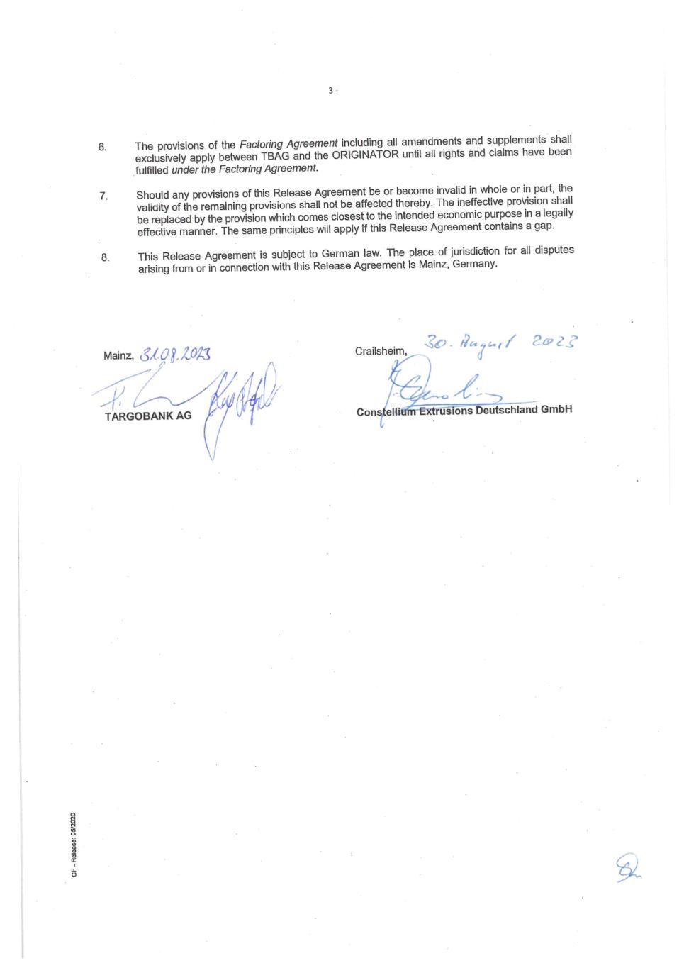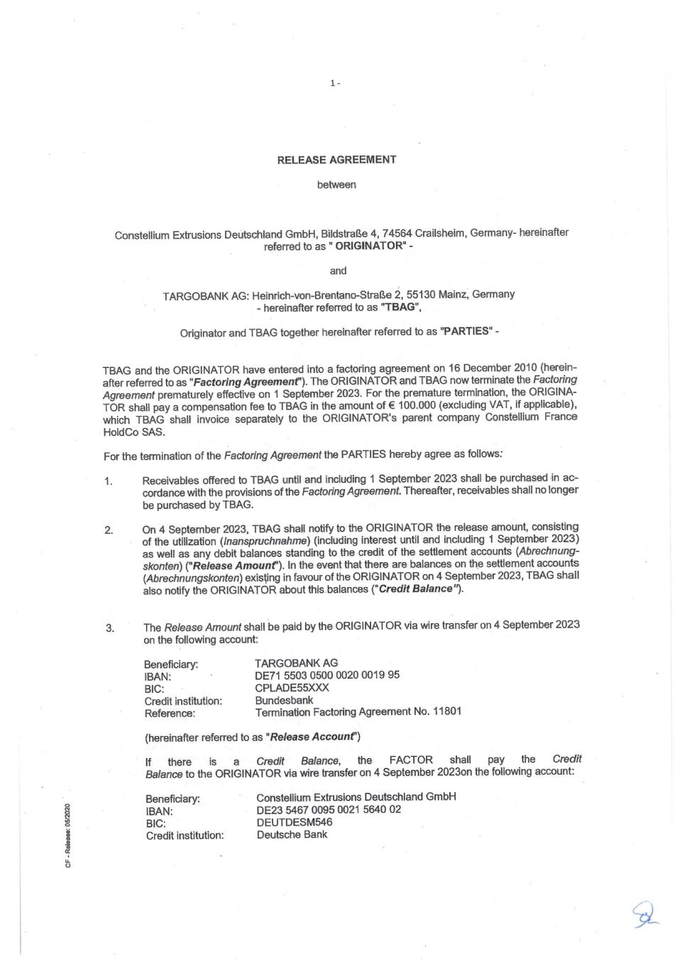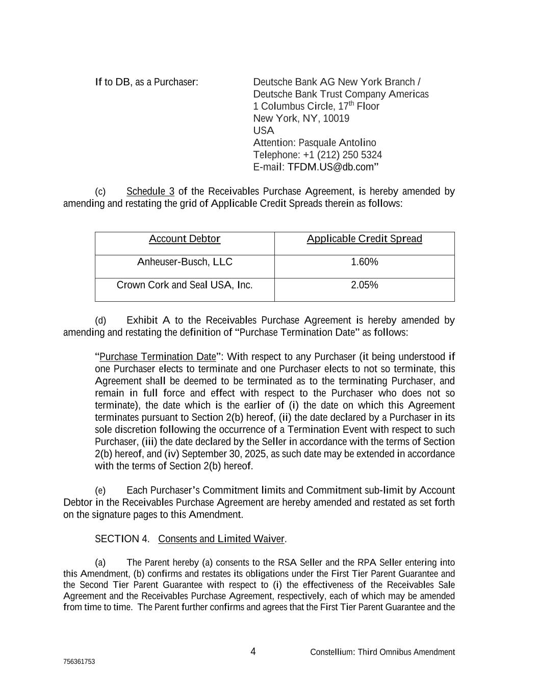 4 Constellium: Third Omnibus Amendment 756361753 If to DB, as a Purchaser: Deutsche Bank AG New York Branch / Deutsche Bank Trust Company Americas 1 Columbus Circle, 17th Floor New York, NY, 10019 USA Attention: Pasquale Antolino Telephone: +1 (212) 250 5324 E-mail: TFDM.US@db.com” (c) Schedule 3 of the Receivables Purchase Agreement, is hereby amended by amending and restating the grid of Applicable Credit Spreads therein as follows: Account Debtor Applicable Credit Spread Anheuser-Busch, LLC 1.60% Crown Cork and Seal USA, Inc. 2.05% (d) Exhibit A to the Receivables Purchase Agreement is hereby amended by amending and restating the definition of “Purchase Termination Date” as follows: “Purchase Termination Date”: With respect to any Purchaser (it being understood if one Purchaser elects to terminate and one Purchaser elects to not so terminate, this Agreement shall be deemed to be terminated as to the terminating Purchaser, and remain in full force and effect with respect to the Purchaser who does not so terminate), the date which is the earlier of (i) the date on which this Agreement terminates pursuant to Section 2(b) hereof, (ii) the date declared by a Purchaser in its sole discretion following the occurrence of a Termination Event with respect to such Purchaser, (iii) the date declared by the Seller in accordance with the terms of Section 2(b) hereof, and (iv) September 30, 2025, as such date may be extended in accordance with the terms of Section 2(b) hereof. (e) Each Purchaser’s Commitment limits and Commitment sub-limit by Account Debtor in the Receivables Purchase Agreement are hereby amended and restated as set forth on the signature pages to this Amendment. SECTION 4. Consents and Limited Waiver. (a) The Parent hereby (a) consents to the RSA Seller and the RPA Seller entering into this Amendment, (b) confirms and restates its obligations under the First Tier Parent Guarantee and the Second Tier Parent Guarantee with respect to (i) the effectiveness of the Receivables Sale Agreement and the Receivables Purchase Agreement, respectively, each of which may be amended from time to time. The Parent further confirms and agrees that the First Tier Parent Guarantee and the
