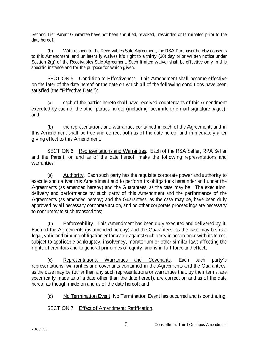 5 Constellium: Third Omnibus Amendment 756361753 Second Tier Parent Guarantee have not been annulled, revoked, rescinded or terminated prior to the date hereof. (b) With respect to the Receivables Sale Agreement, the RSA Purchaser hereby consents to this Amendment, and unilaterally waives it’s right to a thirty (30) day prior written notice under Section 2(g) of the Receivables Sale Agreement. Such limited waiver shall be effective only in this specific instance and for the purpose for which given. SECTION 5. Condition to Effectiveness. This Amendment shall become effective on the later of the date hereof or the date on which all of the following conditions have been satisfied (the “Effective Date”): (a) each of the parties hereto shall have received counterparts of this Amendment executed by each of the other parties hereto (including facsimile or e-mail signature pages); and (b) the representations and warranties contained in each of the Agreements and in this Amendment shall be true and correct both as of the date hereof and immediately after giving effect to this Amendment. SECTION 6. Representations and Warranties. Each of the RSA Seller, RPA Seller and the Parent, on and as of the date hereof, make the following representations and warranties: (a) Authority. Each such party has the requisite corporate power and authority to execute and deliver this Amendment and to perform its obligations hereunder and under the Agreements (as amended hereby) and the Guarantees, as the case may be. The execution, delivery and performance by such party of this Amendment and the performance of the Agreements (as amended hereby) and the Guarantees, as the case may be, have been duly approved by all necessary corporate action, and no other corporate proceedings are necessary to consummate such transactions; (b) Enforceability. This Amendment has been duly executed and delivered by it. Each of the Agreements (as amended hereby) and the Guarantees, as the case may be, is a legal, valid and binding obligation enforceable against such party in accordance with its terms, subject to applicable bankruptcy, insolvency, moratorium or other similar laws affecting the rights of creditors and to general principles of equity, and is in full force and effect; (c) Representations, Warranties and Covenants. Each such party’s representations, warranties and covenants contained in the Agreements and the Guarantees, as the case may be (other than any such representations or warranties that, by their terms, are specifically made as of a date other than the date hereof), are correct on and as of the date hereof as though made on and as of the date hereof; and (d) No Termination Event. No Termination Event has occurred and is continuing. SECTION 7. Effect of Amendment; Ratification.