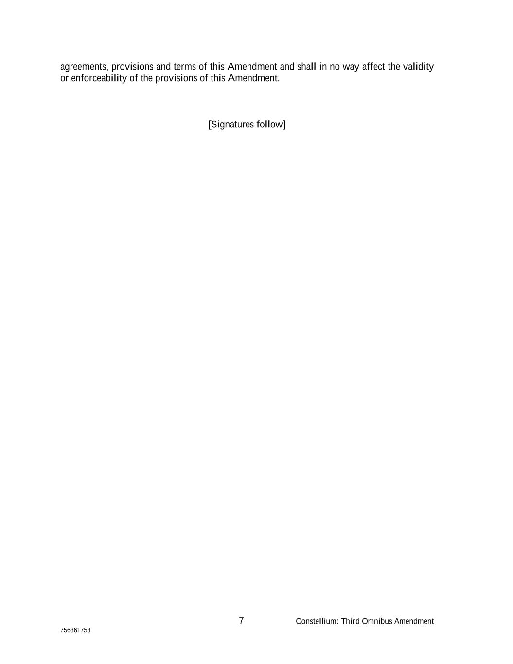 7 Constellium: Third Omnibus Amendment 756361753 agreements, provisions and terms of this Amendment and shall in no way affect the validity or enforceability of the provisions of this Amendment. [Signatures follow]