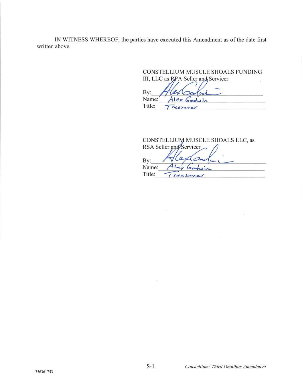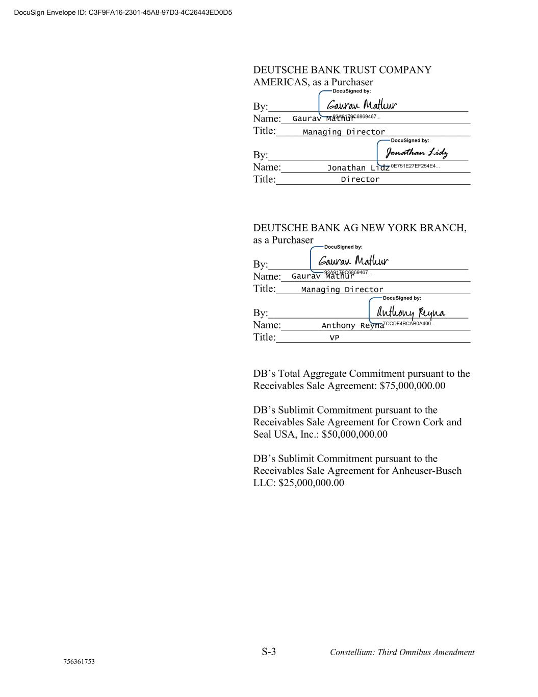 S-3 Constellium: Third Omnibus Amendment 756361753 DEUTSCHE BANK TRUST COMPANY AMERICAS, as a Purchaser By:______________________________________ Name:____________________________________ Title:_____________________________________ By:______________________________________ Name:____________________________________ Title:_____________________________________ DEUTSCHE BANK AG NEW YORK BRANCH, as a Purchaser By:______________________________________ Name:____________________________________ Title:_____________________________________ By:______________________________________ Name:____________________________________ Title:_____________________________________ DB’s Total Aggregate Commitment pursuant to the Receivables Sale Agreement: $75,000,000.00 DB’s Sublimit Commitment pursuant to the Receivables Sale Agreement for Crown Cork and Seal USA, Inc.: $50,000,000.00 DB’s Sublimit Commitment pursuant to the Receivables Sale Agreement for Anheuser-Busch LLC: $25,000,000.00 DocuSign Envelope ID: C3F9FA16-2301-45A8-97D3-4C26443ED0D5