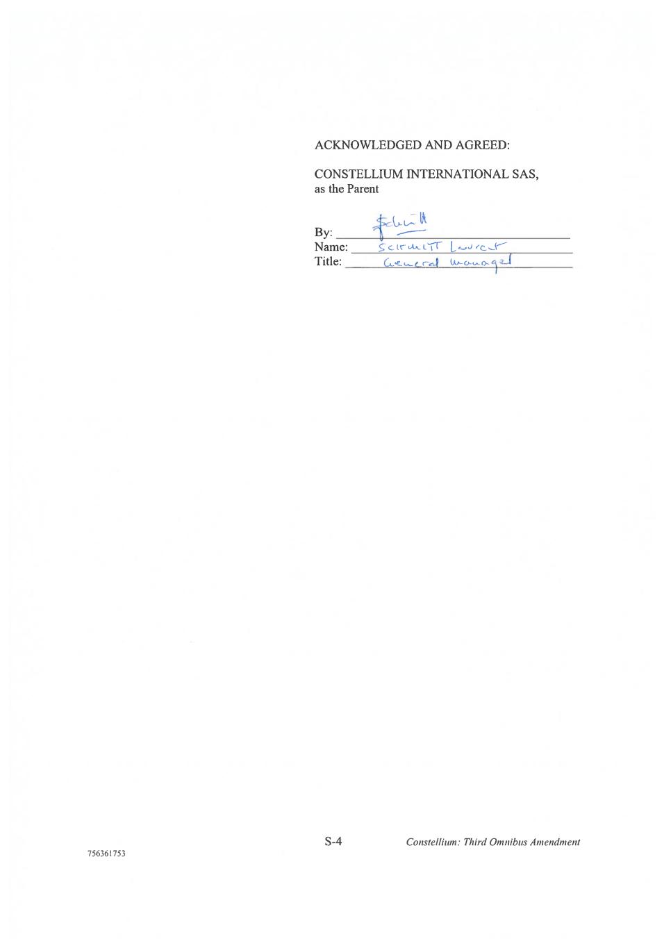 S-2 Constellium: Third Omnibus Amendment 756361753 INTESA SANPAOLO S.P.A., NEW YORK BRANCH, as a Purchaser and as Purchaser Representative By:______________________________________ Name:____________________________________ Title:_____________________________________ By:______________________________________ Name:____________________________________ Title:_____________________________________ Intesa’s Total Aggregate Commitment pursuant to the Receivables Sale Agreement: $100,000,000.00 Intesa’s Sublimit Commitment pursuant to the Receivables Sale Agreement for Crown Cork and Seal USA, Inc.: $55,000,000.00 Intesa’s Sublimit Commitment pursuant to the Receivables Sale Agreement for Anheuser-Busch LLC: $45,000,000.00 Marco Fracchia Head of Financial Institutions - SEF & TEF Thomas Sakellariou Business Director