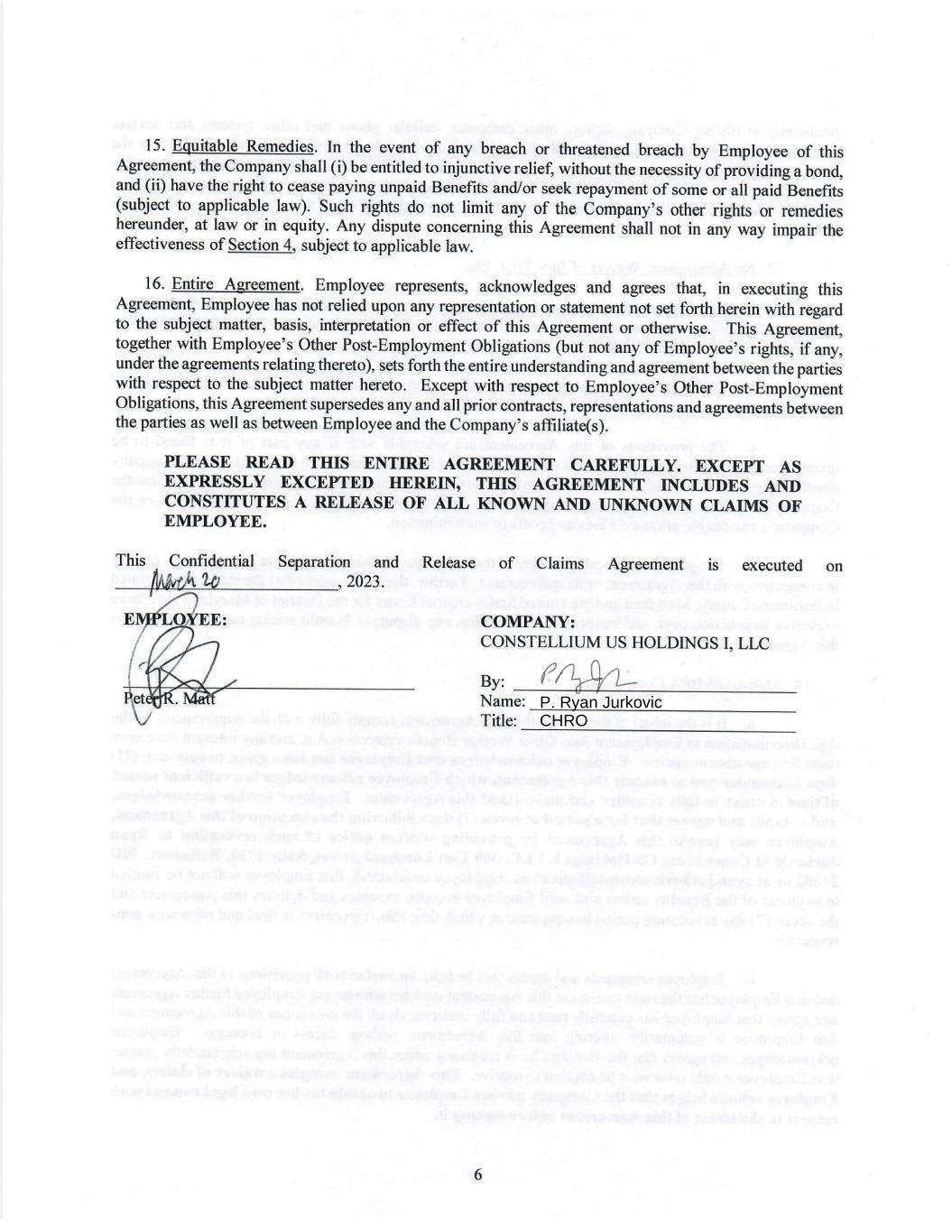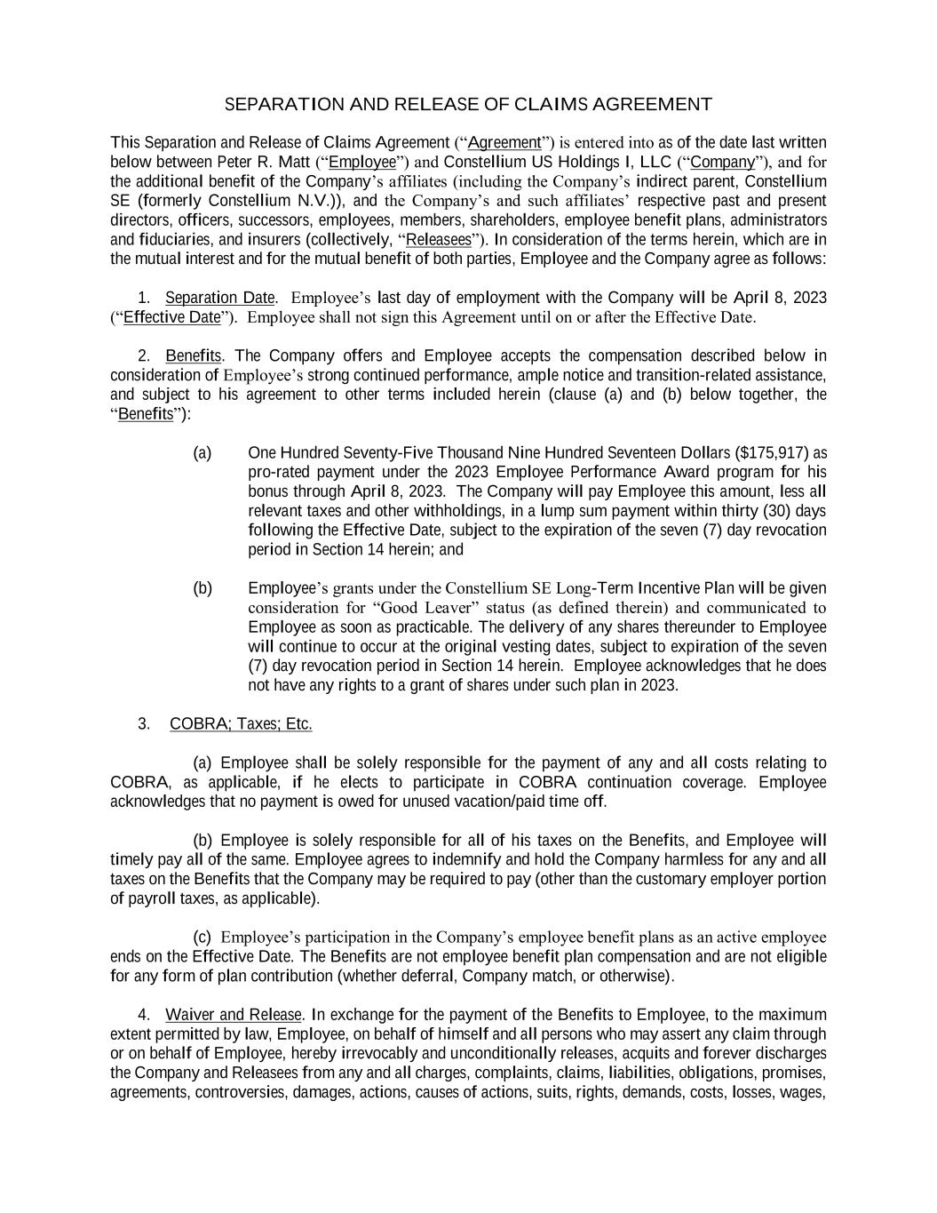 SEPARATION AND RELEASE OF CLAIMS AGREEMENT This Separation and Release of Claims Agreement (“Agreement”) is entered into as of the date last written below between Peter R. Matt (“Employee”) and Constellium US Holdings I, LLC (“Company”), and for the additional benefit of the Company’s affiliates (including the Company’s indirect parent, Constellium SE (formerly Constellium N.V.)), and the Company’s and such affiliates’ respective past and present directors, officers, successors, employees, members, shareholders, employee benefit plans, administrators and fiduciaries, and insurers (collectively, “Releasees”). In consideration of the terms herein, which are in the mutual interest and for the mutual benefit of both parties, Employee and the Company agree as follows: 1. Separation Date. Employee’s last day of employment with the Company will be April 8, 2023 (“Effective Date”). Employee shall not sign this Agreement until on or after the Effective Date. 2. Benefits. The Company offers and Employee accepts the compensation described below in consideration of Employee’s strong continued performance, ample notice and transition-related assistance, and subject to his agreement to other terms included herein (clause (a) and (b) below together, the “Benefits”): (a) One Hundred Seventy-Five Thousand Nine Hundred Seventeen Dollars ($175,917) as pro-rated payment under the 2023 Employee Performance Award program for his bonus through April 8, 2023. The Company will pay Employee this amount, less all relevant taxes and other withholdings, in a lump sum payment within thirty (30) days following the Effective Date, subject to the expiration of the seven (7) day revocation period in Section 14 herein; and (b) Employee’s grants under the Constellium SE Long-Term Incentive Plan will be given consideration for “Good Leaver” status (as defined therein) and communicated to Employee as soon as practicable. The delivery of any shares thereunder to Employee will continue to occur at the original vesting dates, subject to expiration of the seven (7) day revocation period in Section 14 herein. Employee acknowledges that he does not have any rights to a grant of shares under such plan in 2023. 3. COBRA; Taxes; Etc. (a) Employee shall be solely responsible for the payment of any and all costs relating to COBRA, as applicable, if he elects to participate in COBRA continuation coverage. Employee acknowledges that no payment is owed for unused vacation/paid time off. (b) Employee is solely responsible for all of his taxes on the Benefits, and Employee will timely pay all of the same. Employee agrees to indemnify and hold the Company harmless for any and all taxes on the Benefits that the Company may be required to pay (other than the customary employer portion of payroll taxes, as applicable). (c) Employee’s participation in the Company’s employee benefit plans as an active employee ends on the Effective Date. The Benefits are not employee benefit plan compensation and are not eligible for any form of plan contribution (whether deferral, Company match, or otherwise). 4. Waiver and Release. In exchange for the payment of the Benefits to Employee, to the maximum extent permitted by law, Employee, on behalf of himself and all persons who may assert any claim through or on behalf of Employee, hereby irrevocably and unconditionally releases, acquits and forever discharges the Company and Releasees from any and all charges, complaints, claims, liabilities, obligations, promises, agreements, controversies, damages, actions, causes of actions, suits, rights, demands, costs, losses, wages,